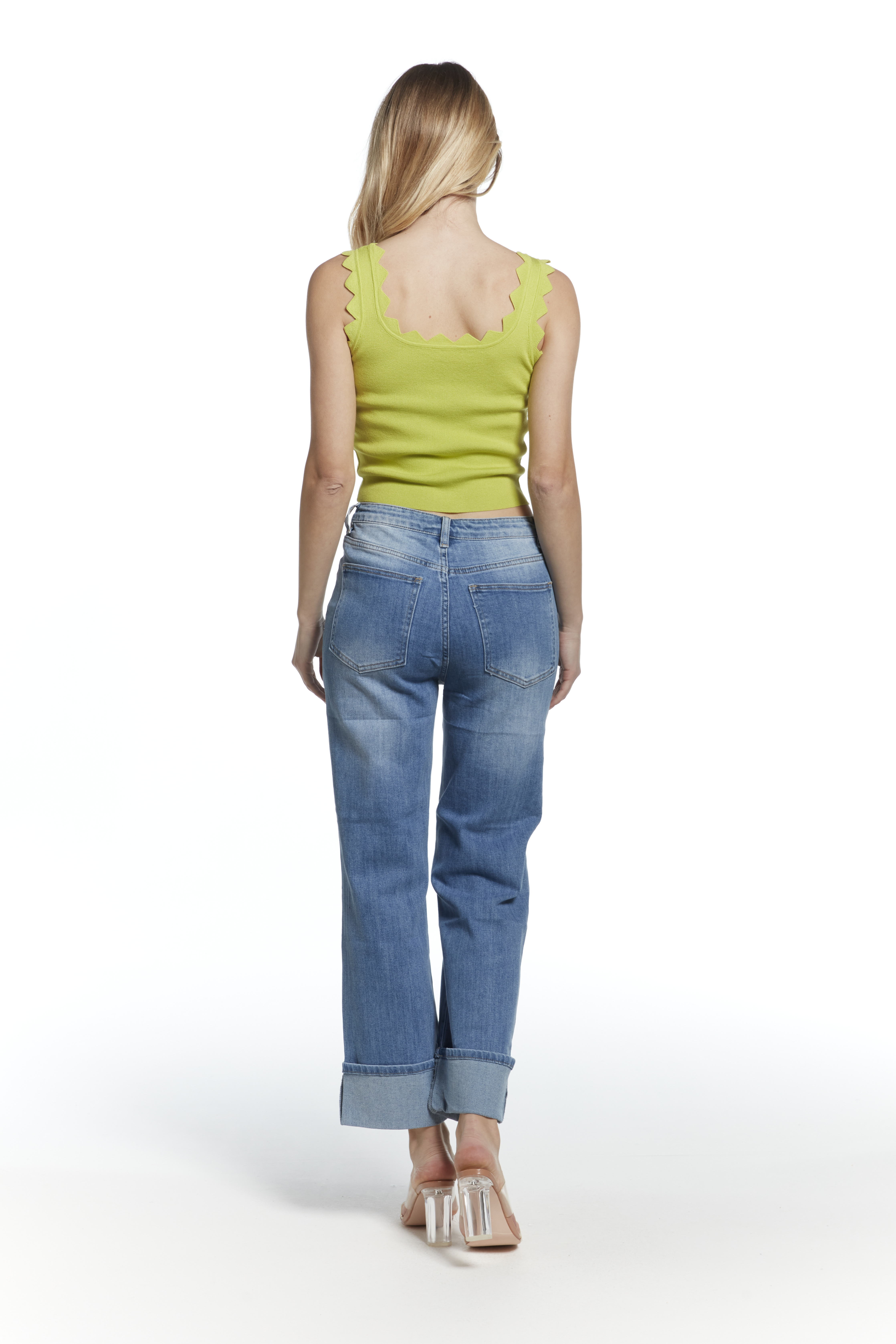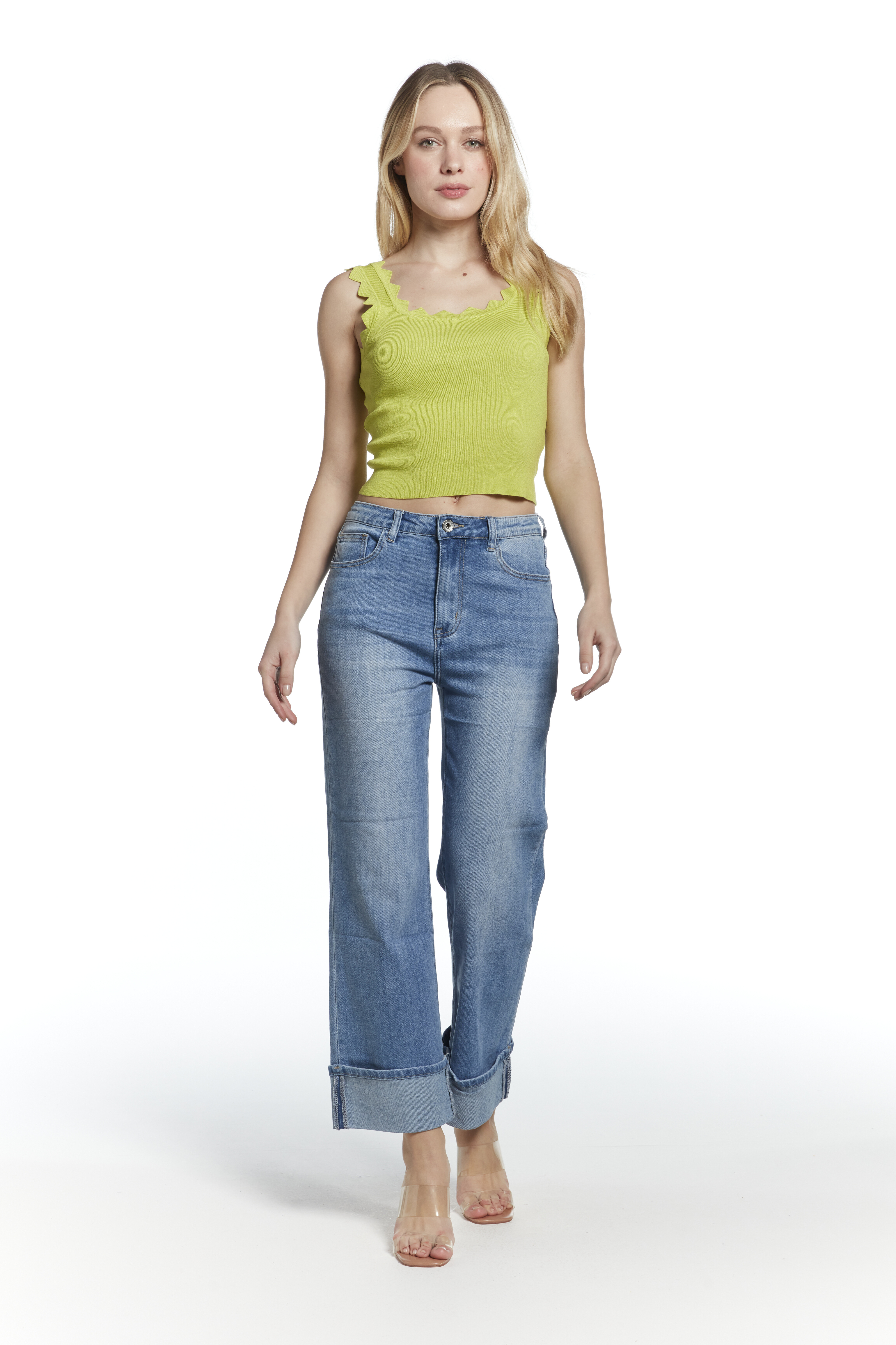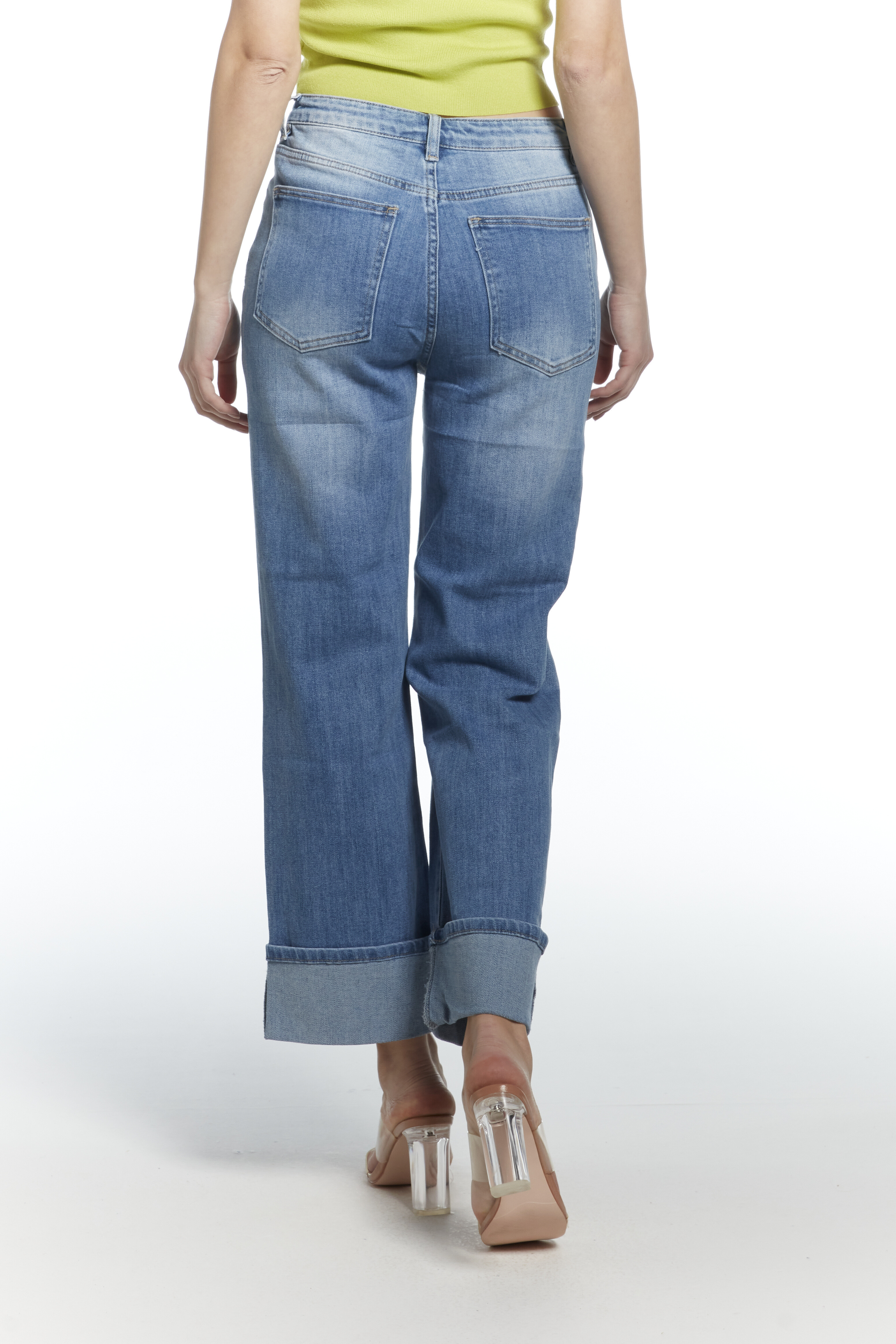 Módní džínové kalhoty a extra širokou nohavicí a vysokým pasem, zkrácená délka lem, vyrobeno Itálie