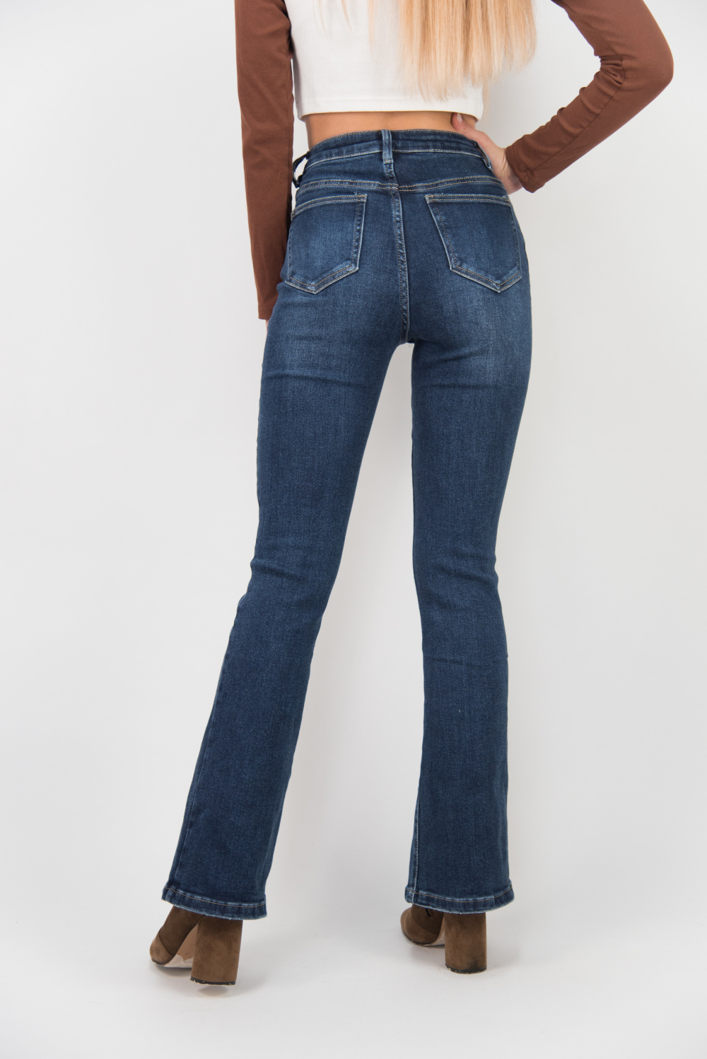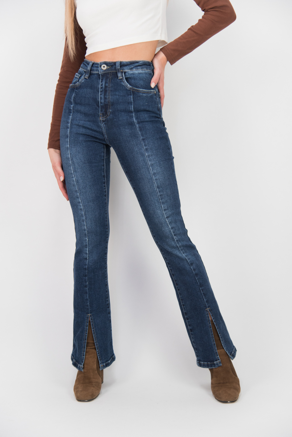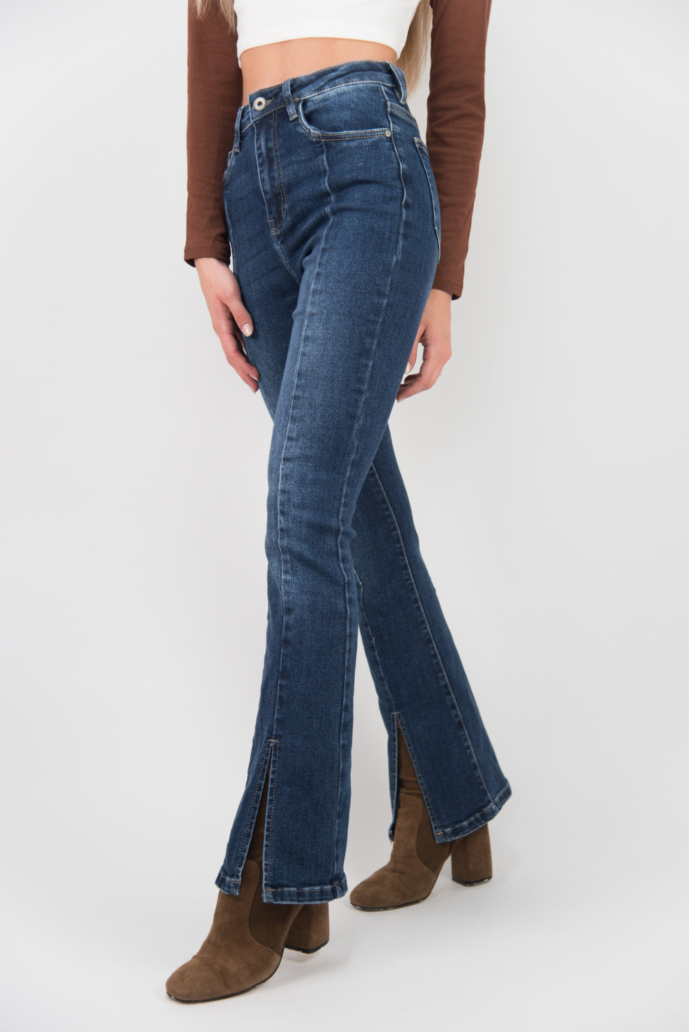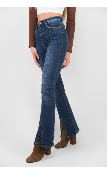 Módní jeans kalhoty - zvonový střih s prostřihem.