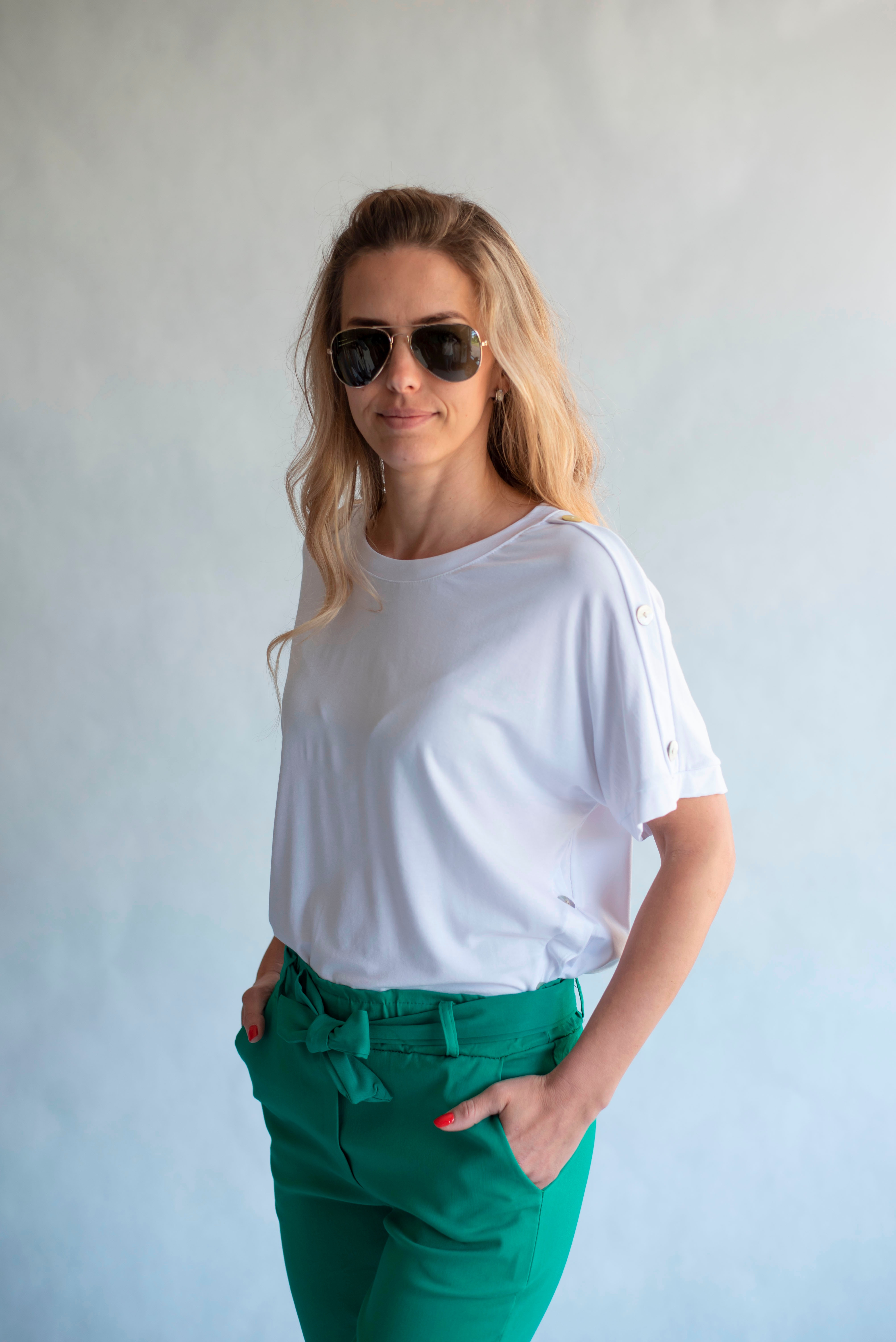 Módní kalhoty pohodlného střihu, elastický pas, opasek a 2x přední kapsy, vázaní na mašli v pase