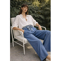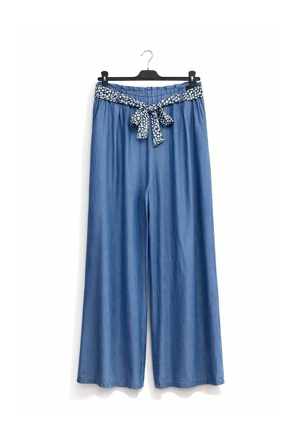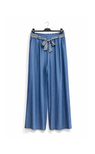 Dámské kalhoty s širokými nohavicemi WIDE-LEG střihu. Kalhoty jsou z prodyšného, odlehčeného materiálu Lyocell, v pase jsou do gumy, doplněny stylovým šátkem.