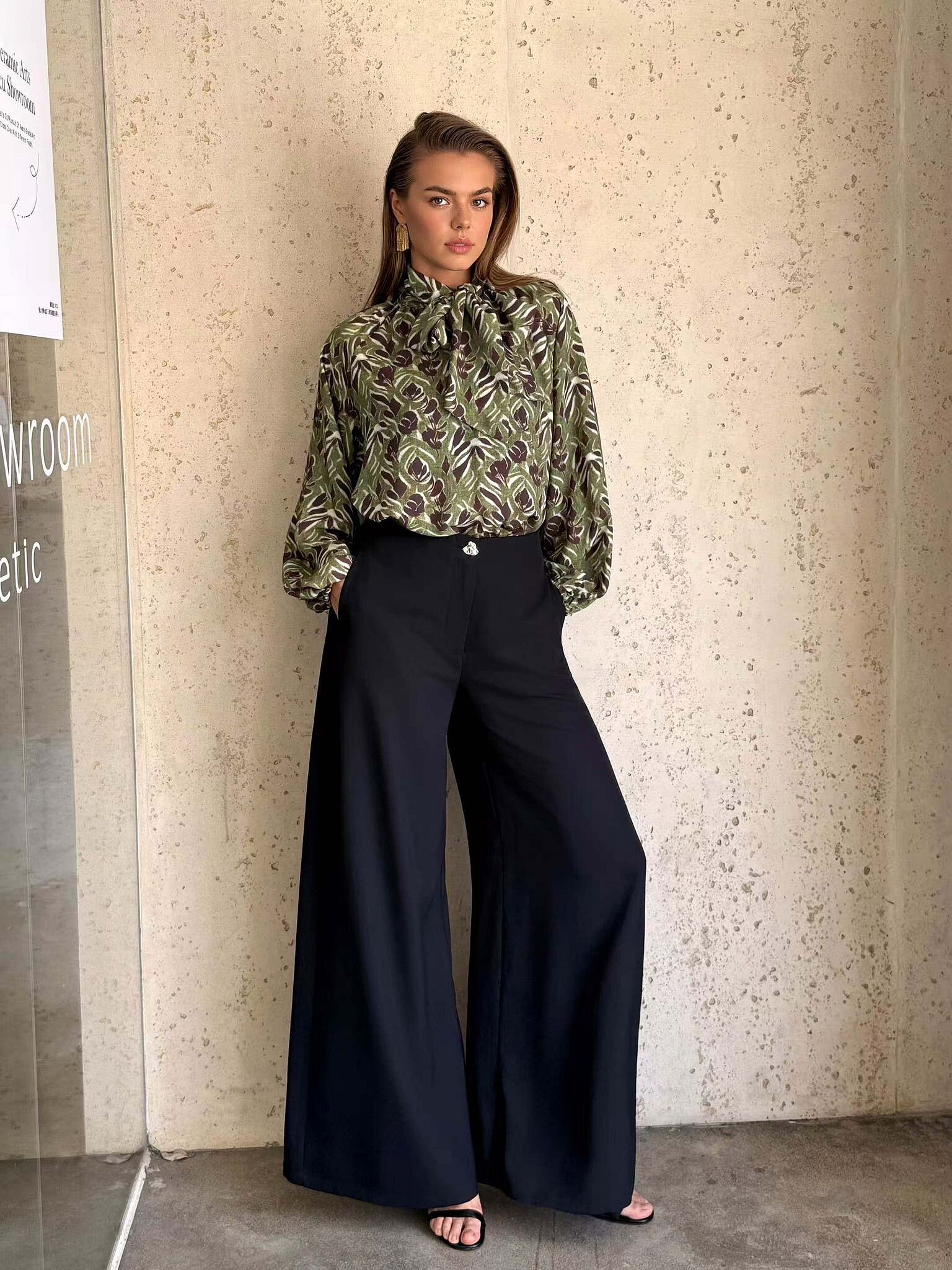 Dámské elegantní kalhoty s širokými nohavicemi. Kalhoty mají zapínání na zip a jsou doplněny o zlatý knoflík.