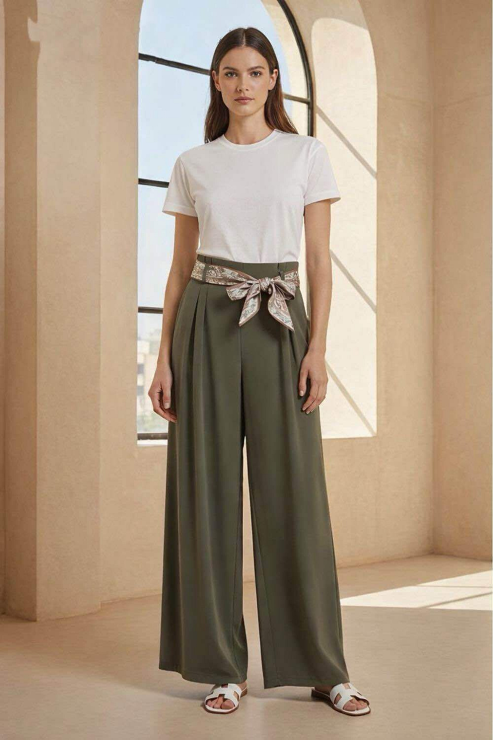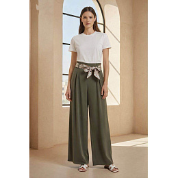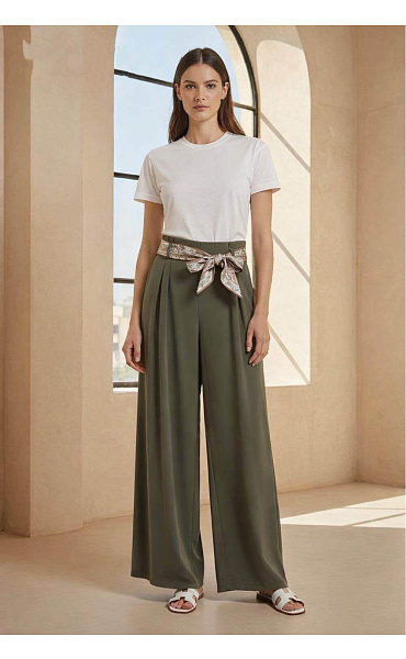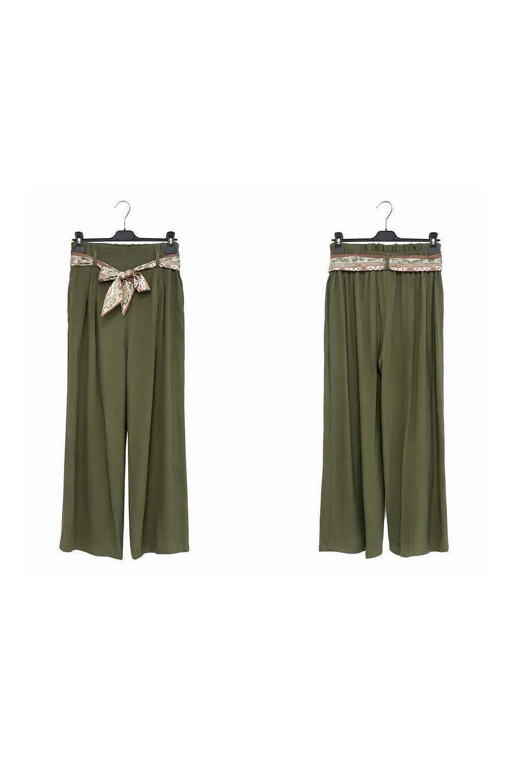 Dámské kalhoty s širokými nohavicemi WIDE-LEG střihu. Kalhoty jsou v pase do gumy, doplněny stylovým šátkem.