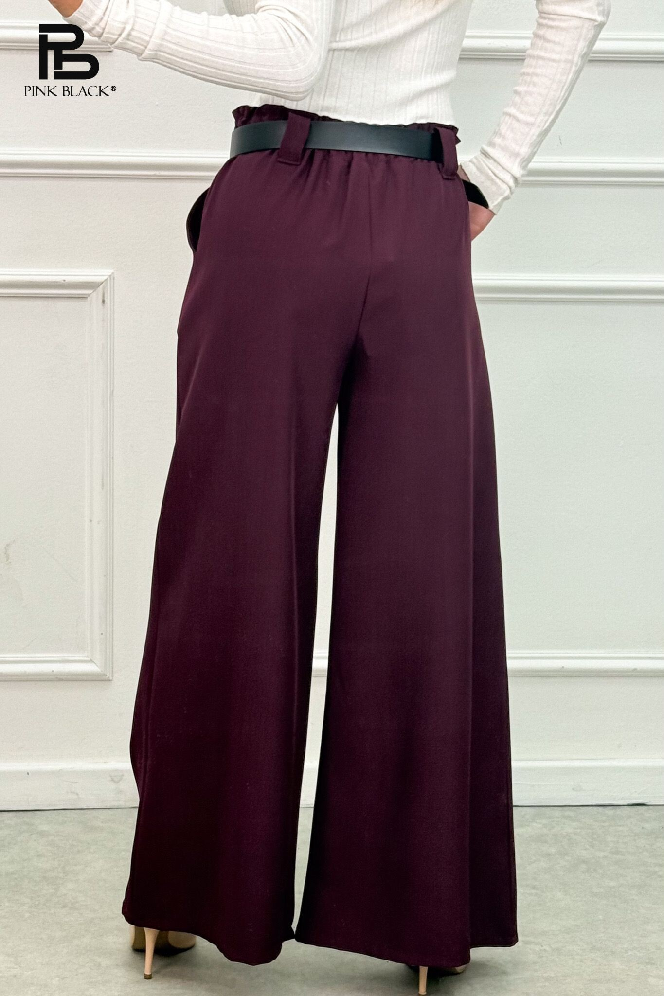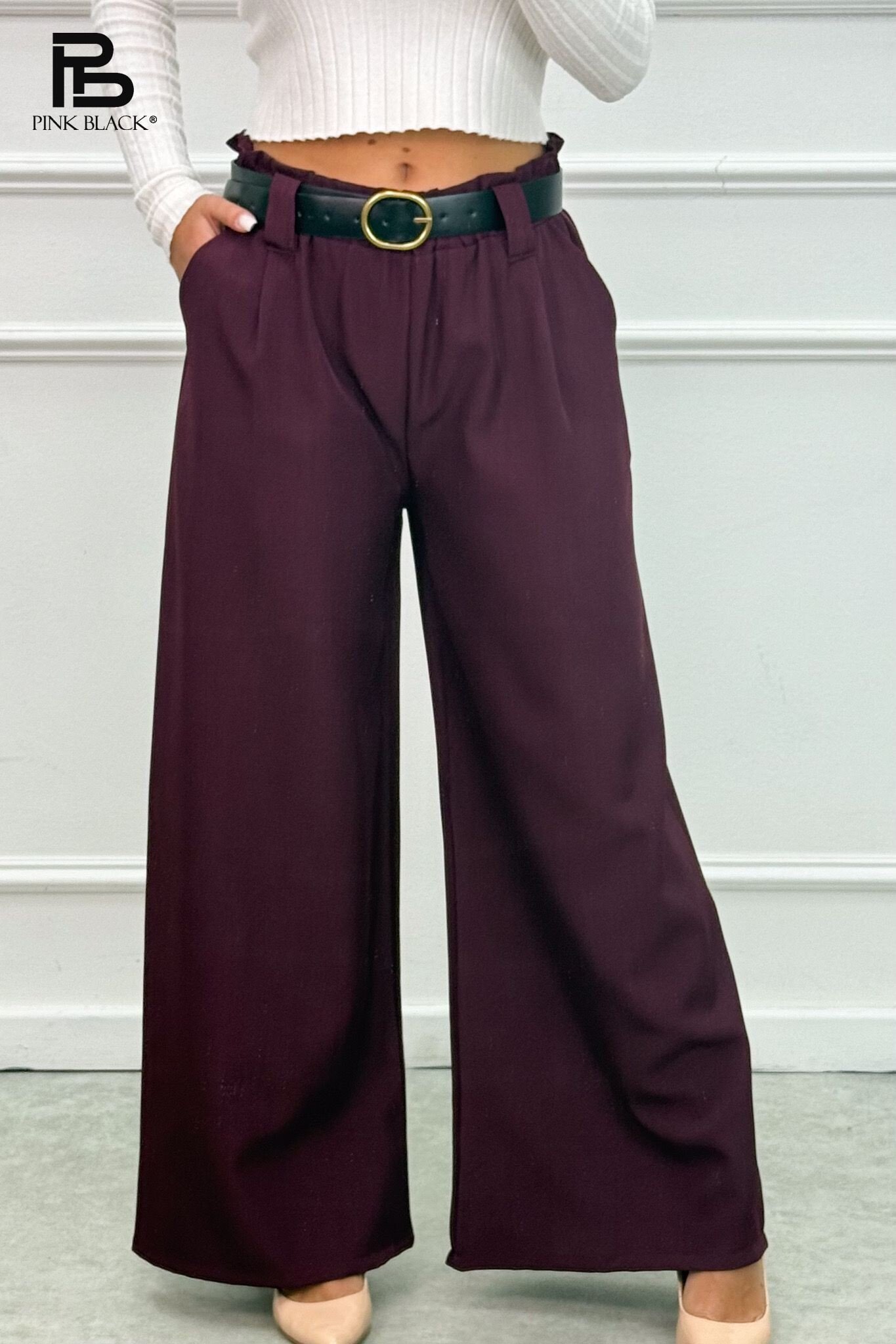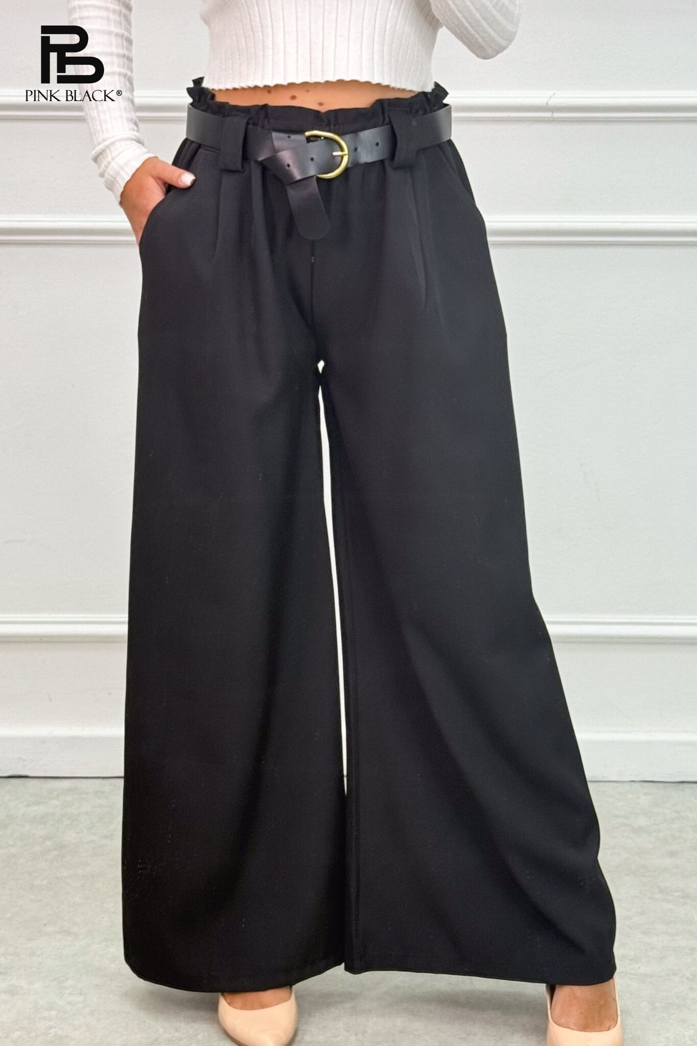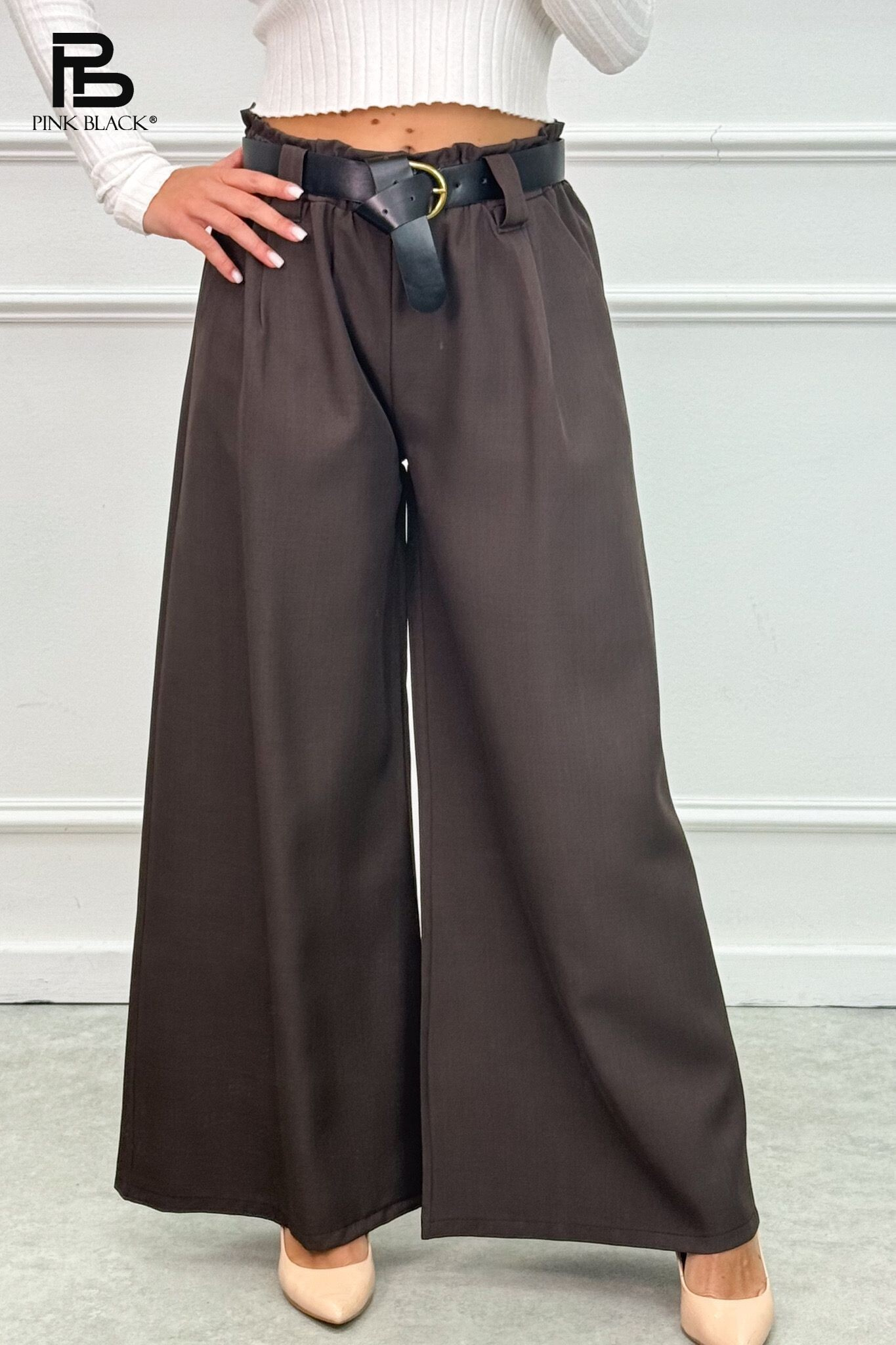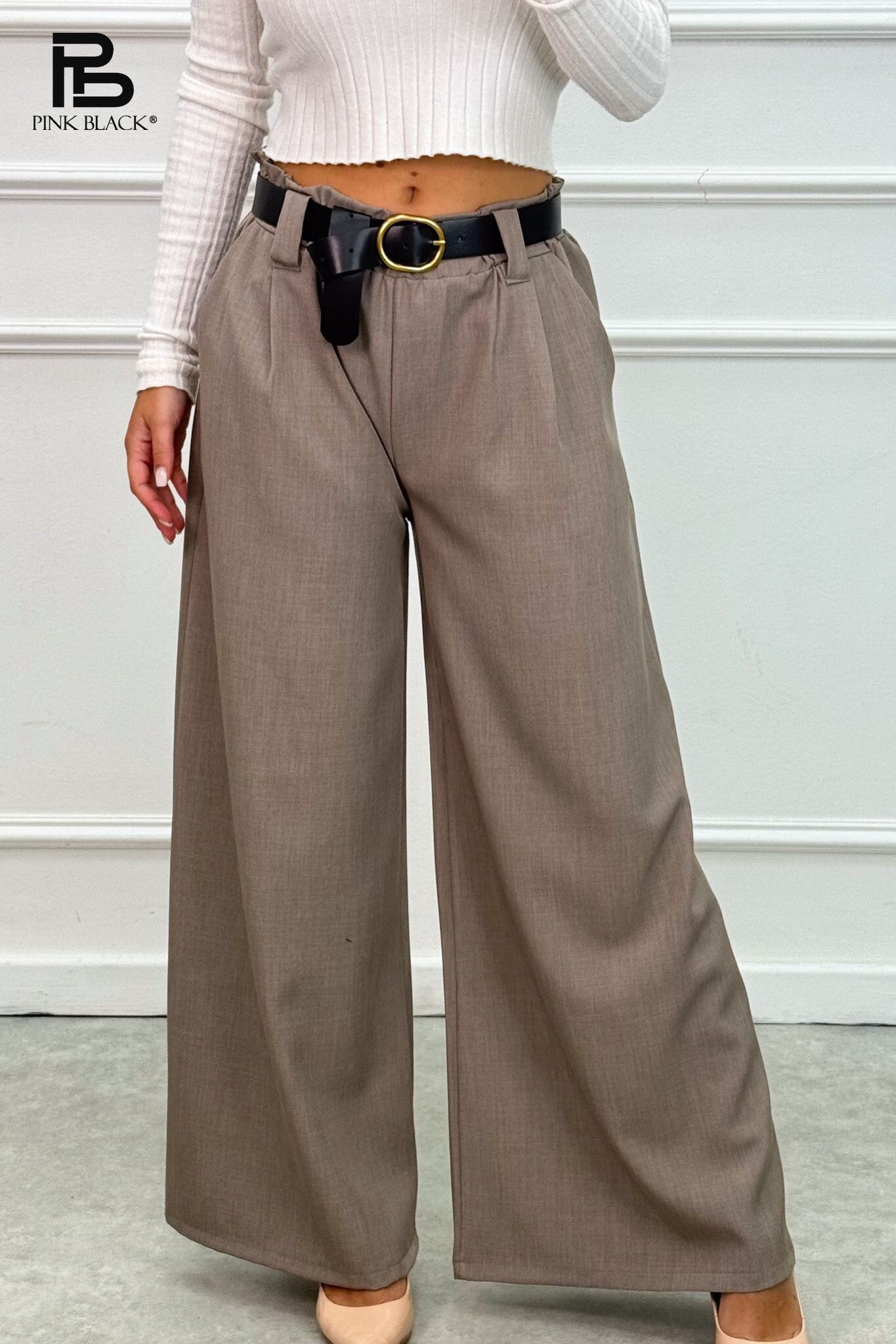 Kalhoty s širokými nohavicemi, v pase do gumy, doplněny páskem.