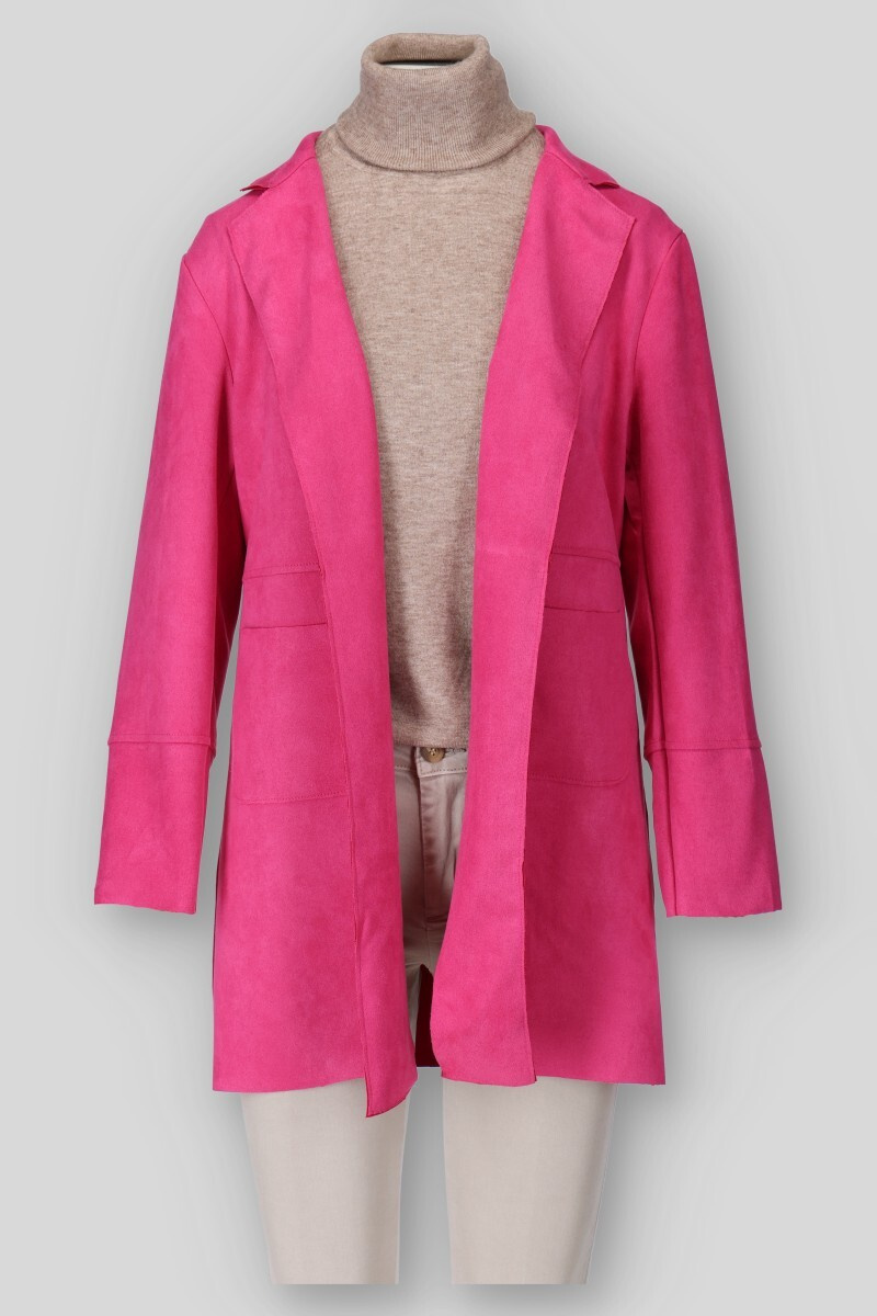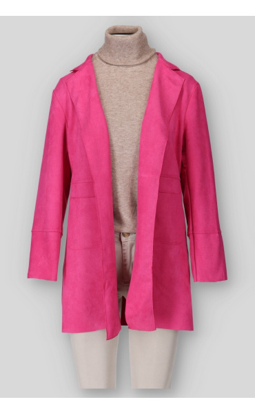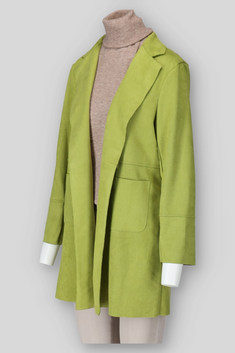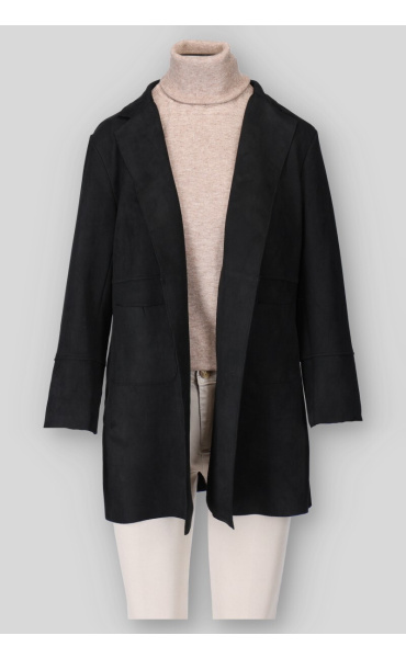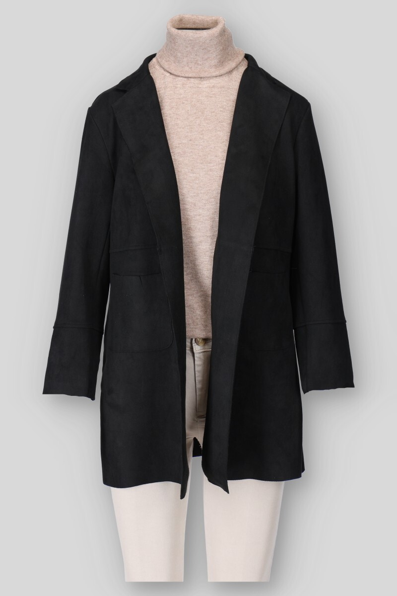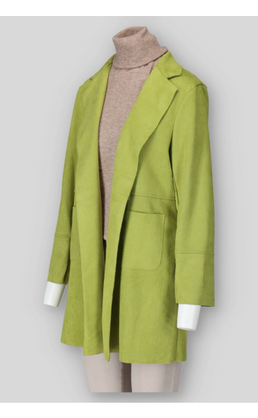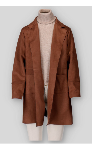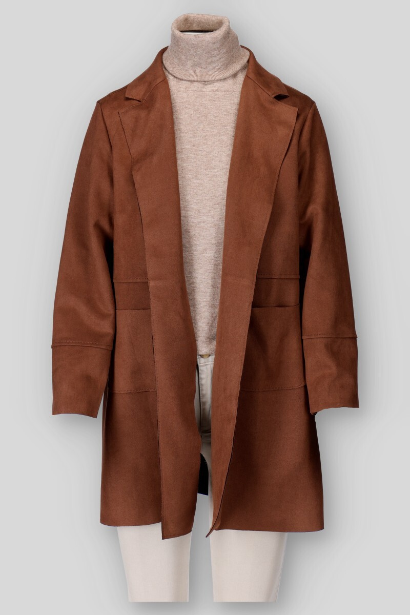 Dámský kardigan imitace broušené kůže s našitými kapsami na přední straně.
