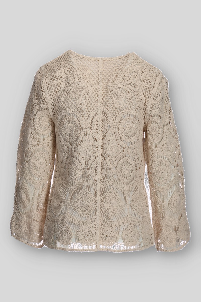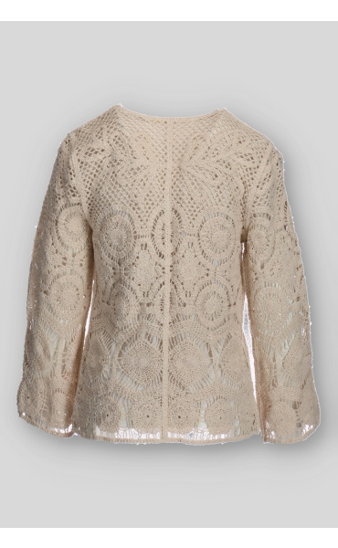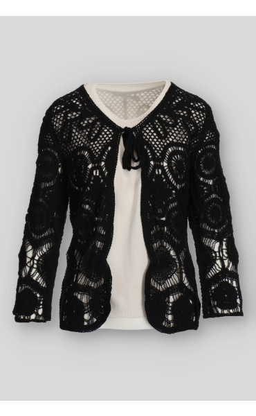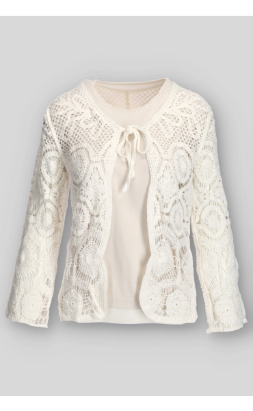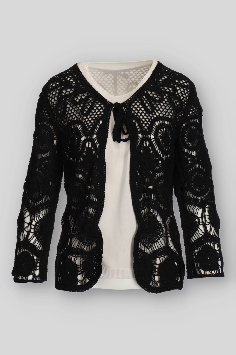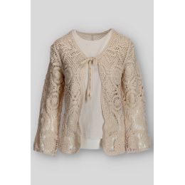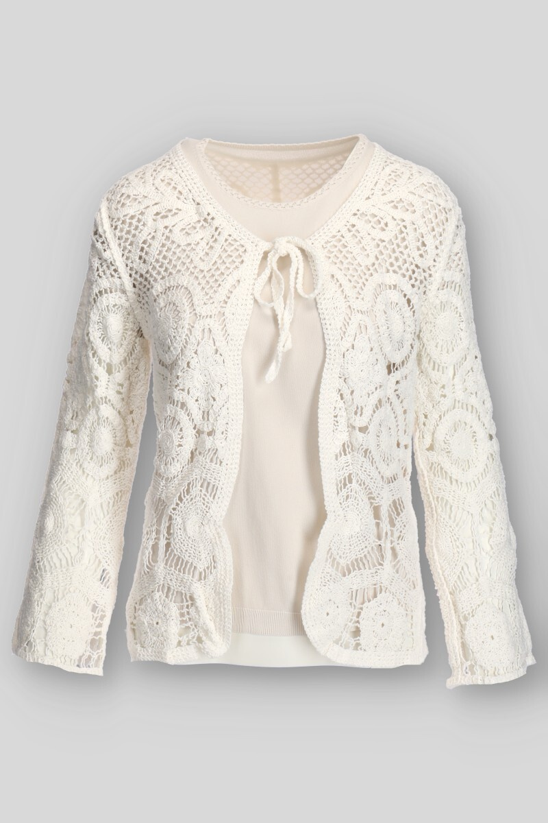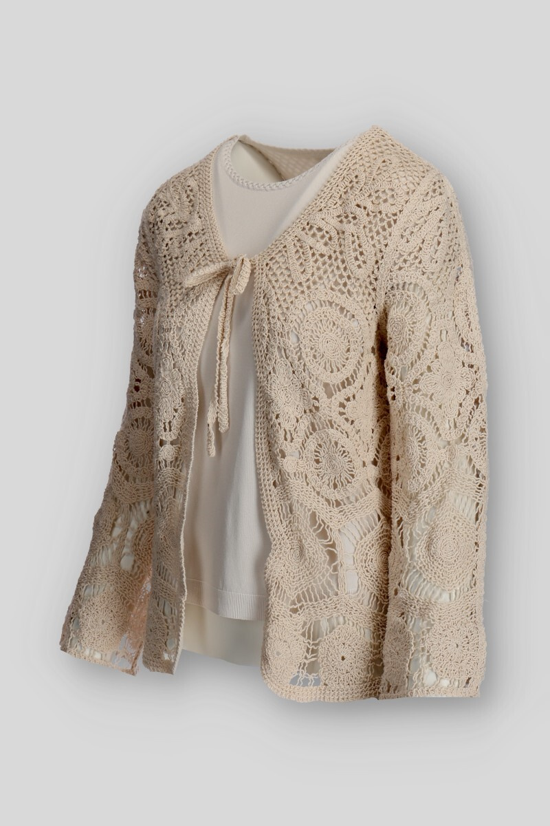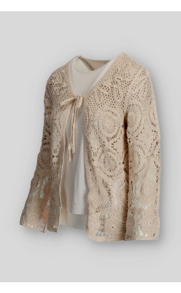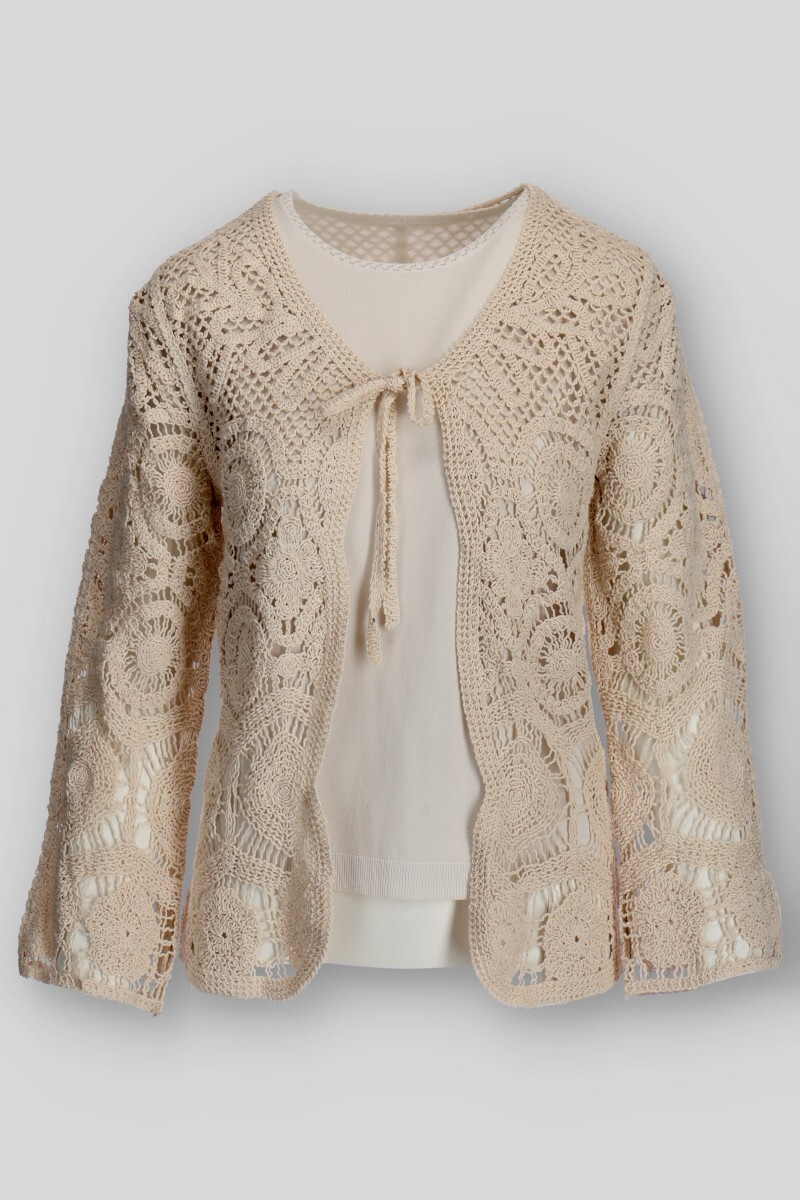 Krátký háčkovaný kardigan v BOHO stylu s vázáním u krku.
