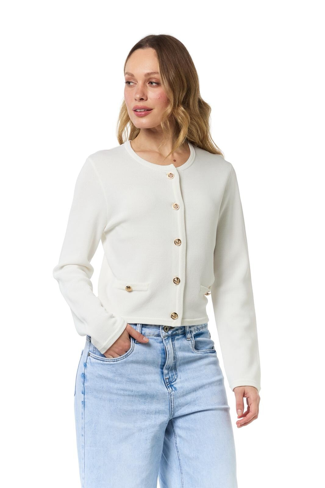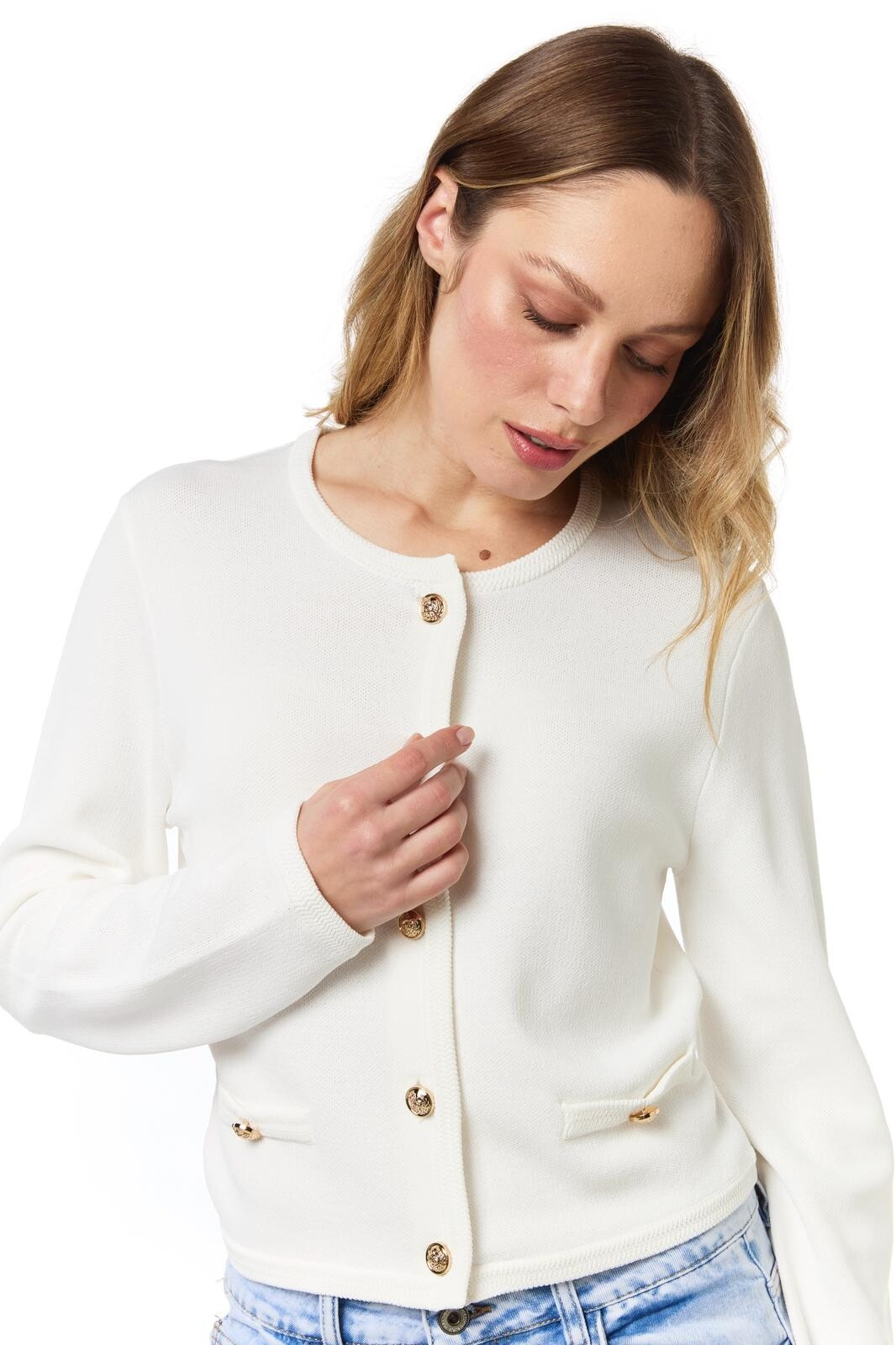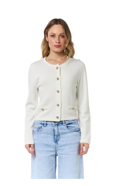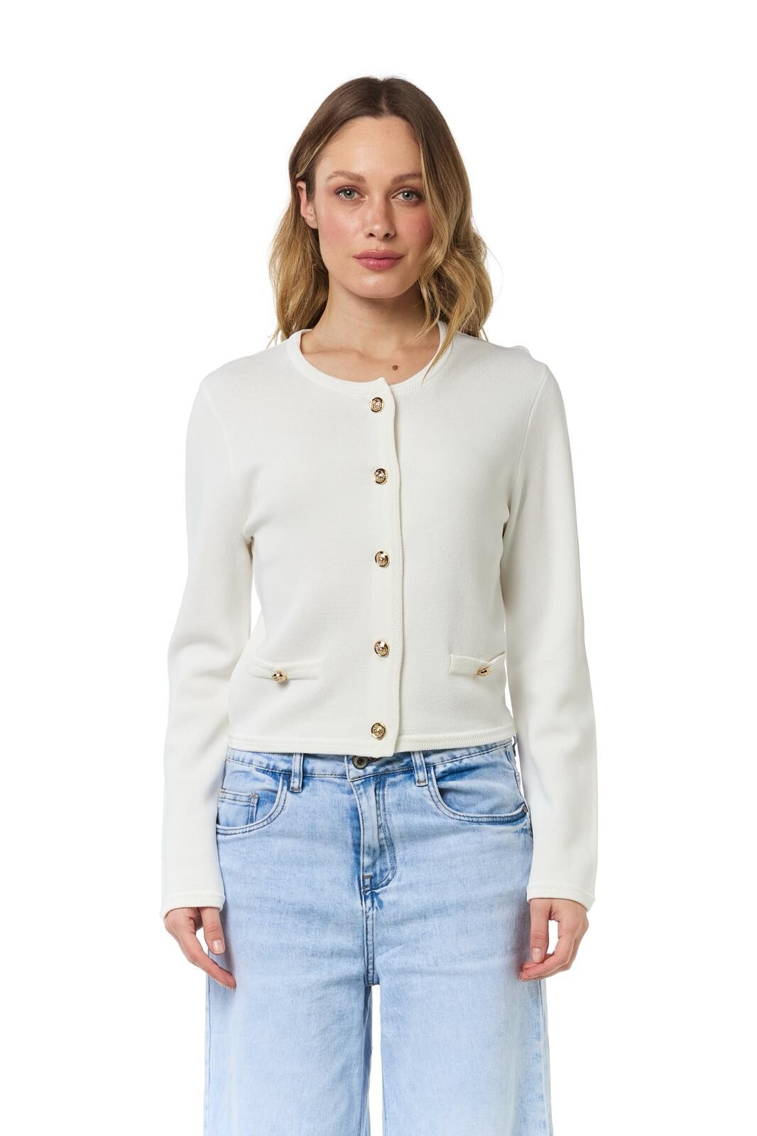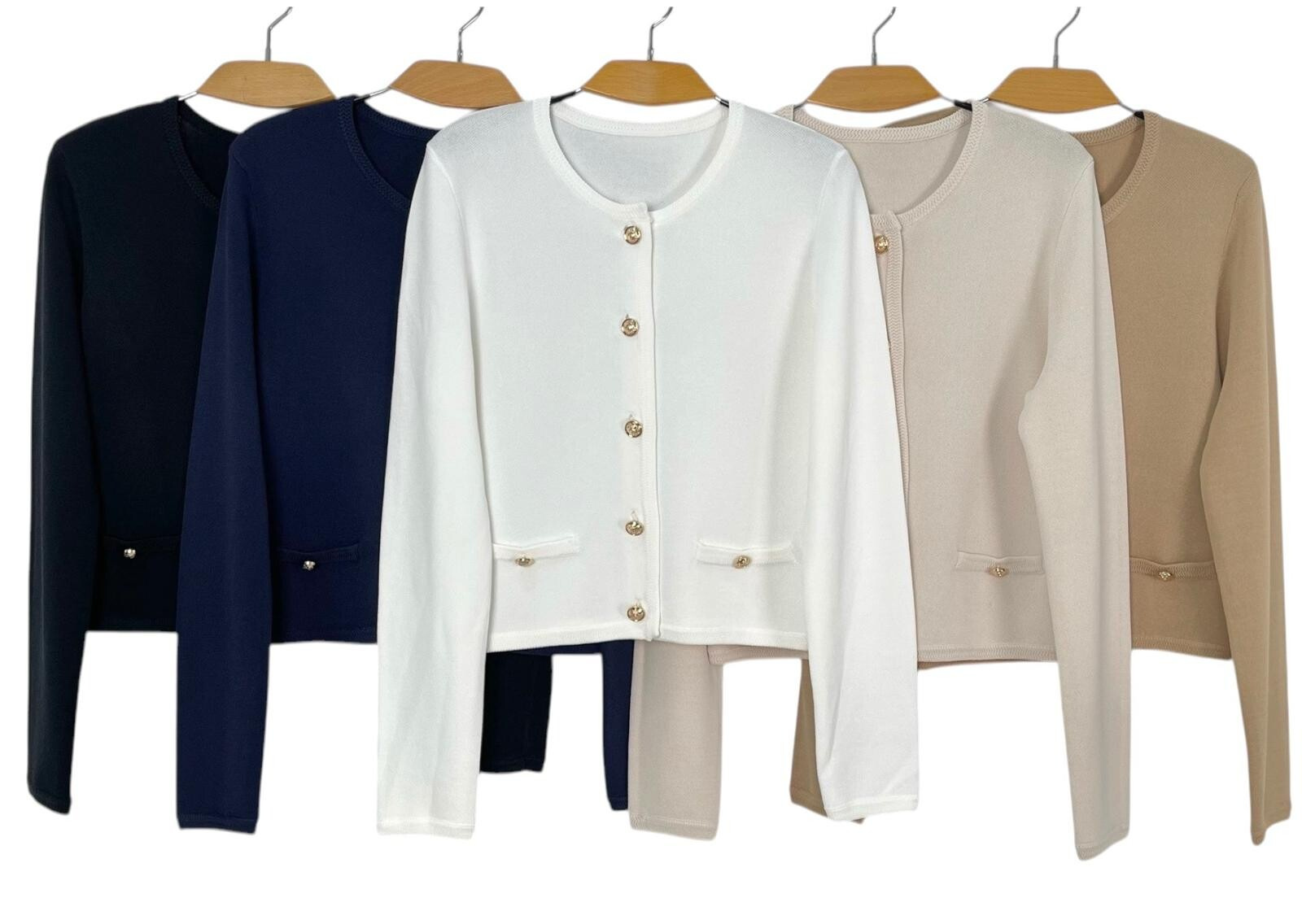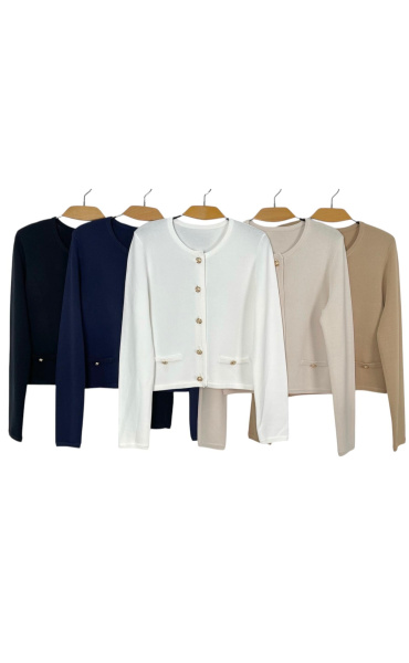 Elegantní sako propínací z úpletového materiálu. Sako má aplikaci zlatých knoflíčku a falešné kapsy na přední straně.