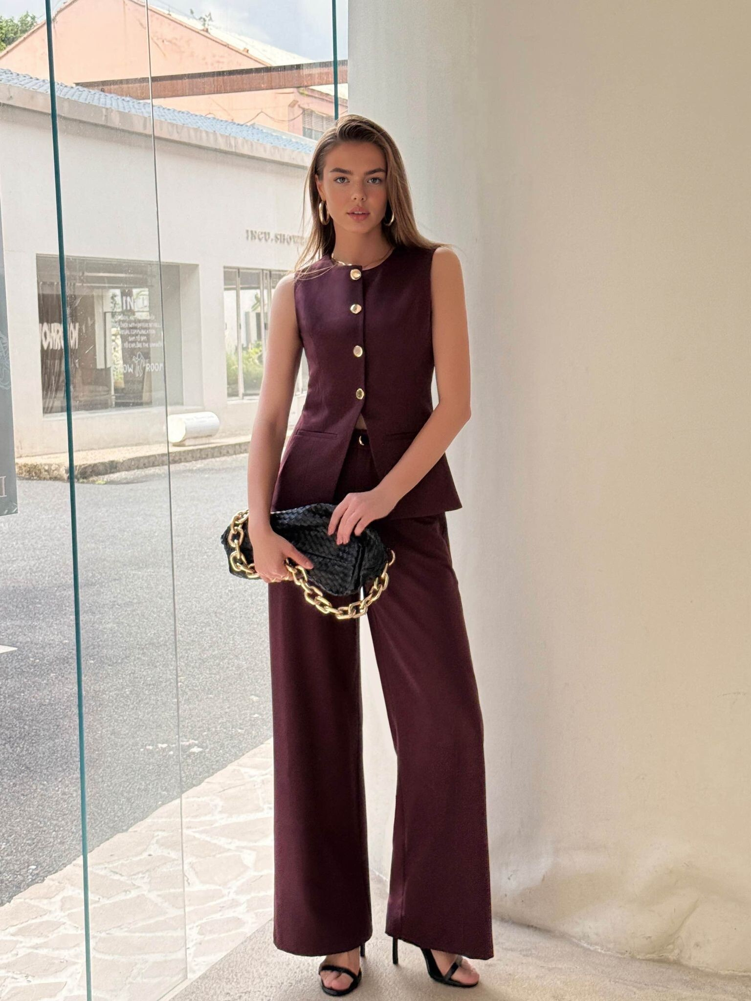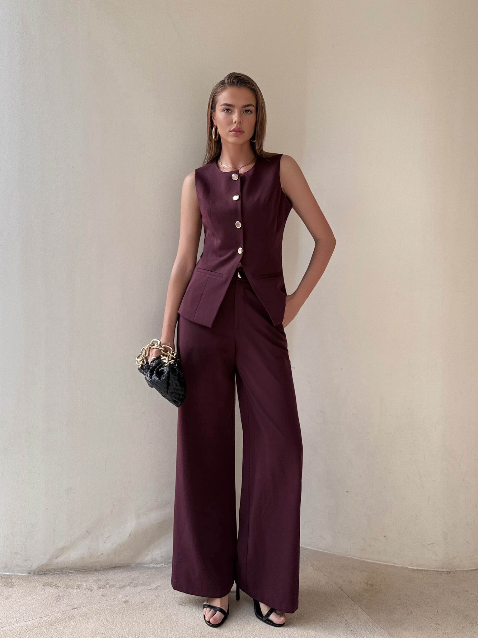 Dámský elegantní komplet, složený z dlouhých kalhot s širokými nohavicemi a vestičkou na zapínání s výstřihem do V.