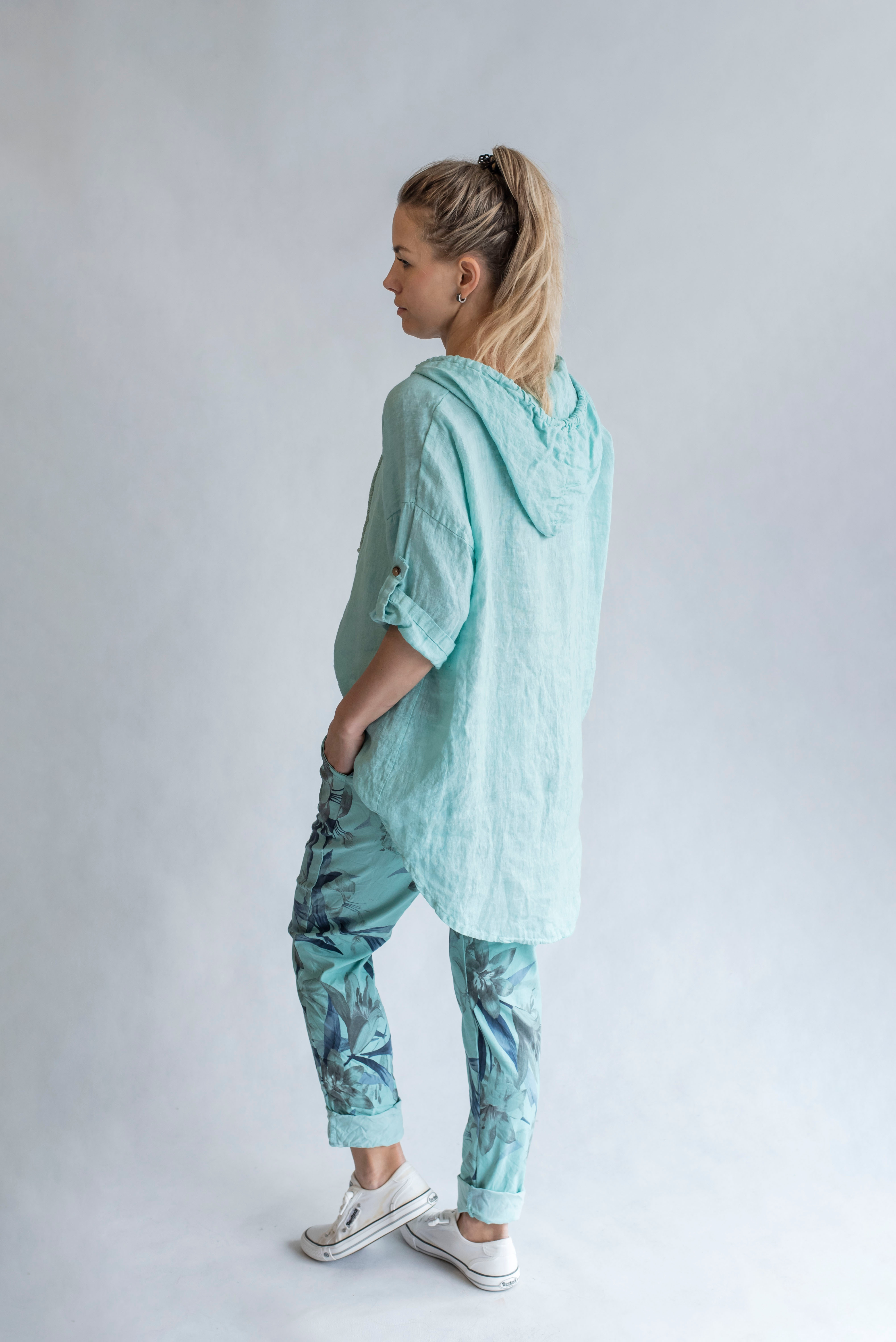 Módní košile s kapucí , krátký rukáv, na rameni knoflík , přední díl kratší, vyrobeno v Itálii
