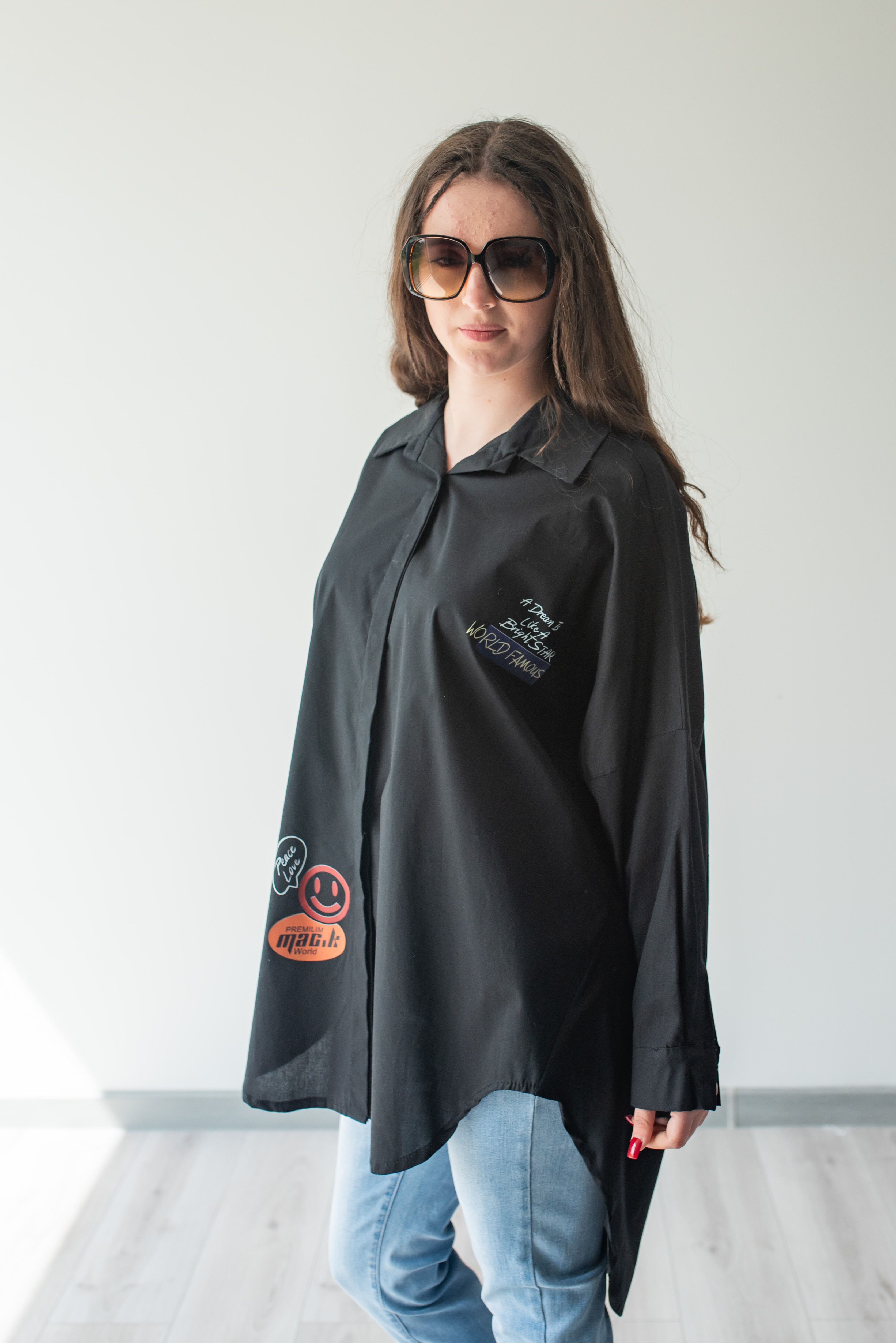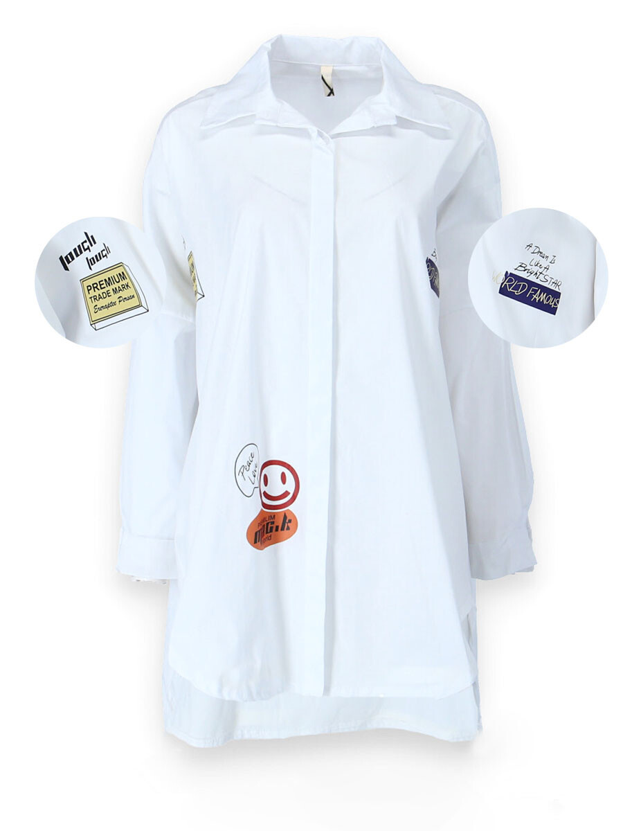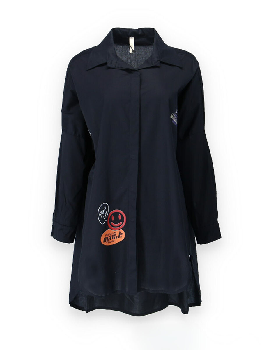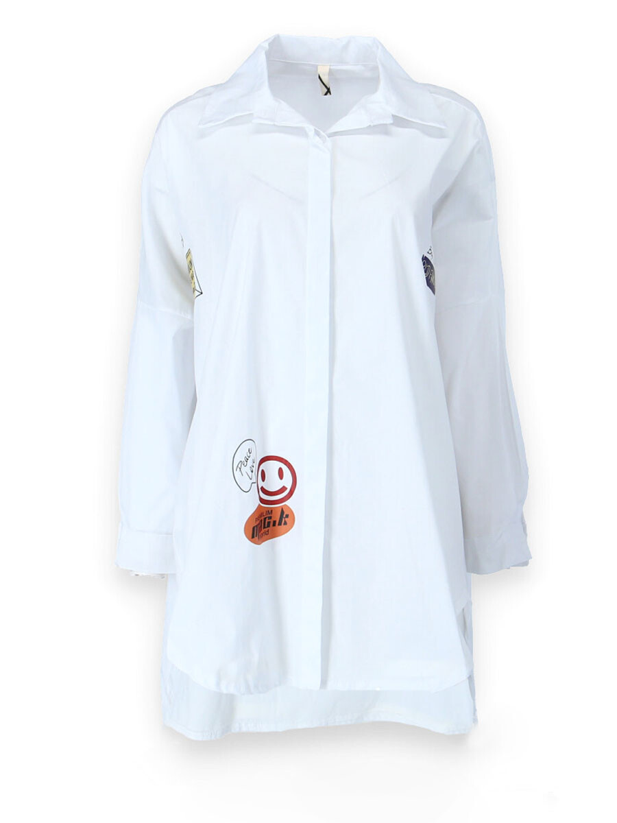 Dámská stylová košile oversize střihu s aplikací. Košile má dlouhý rukáv, je propínací a má prodlouženou zadní délku.
