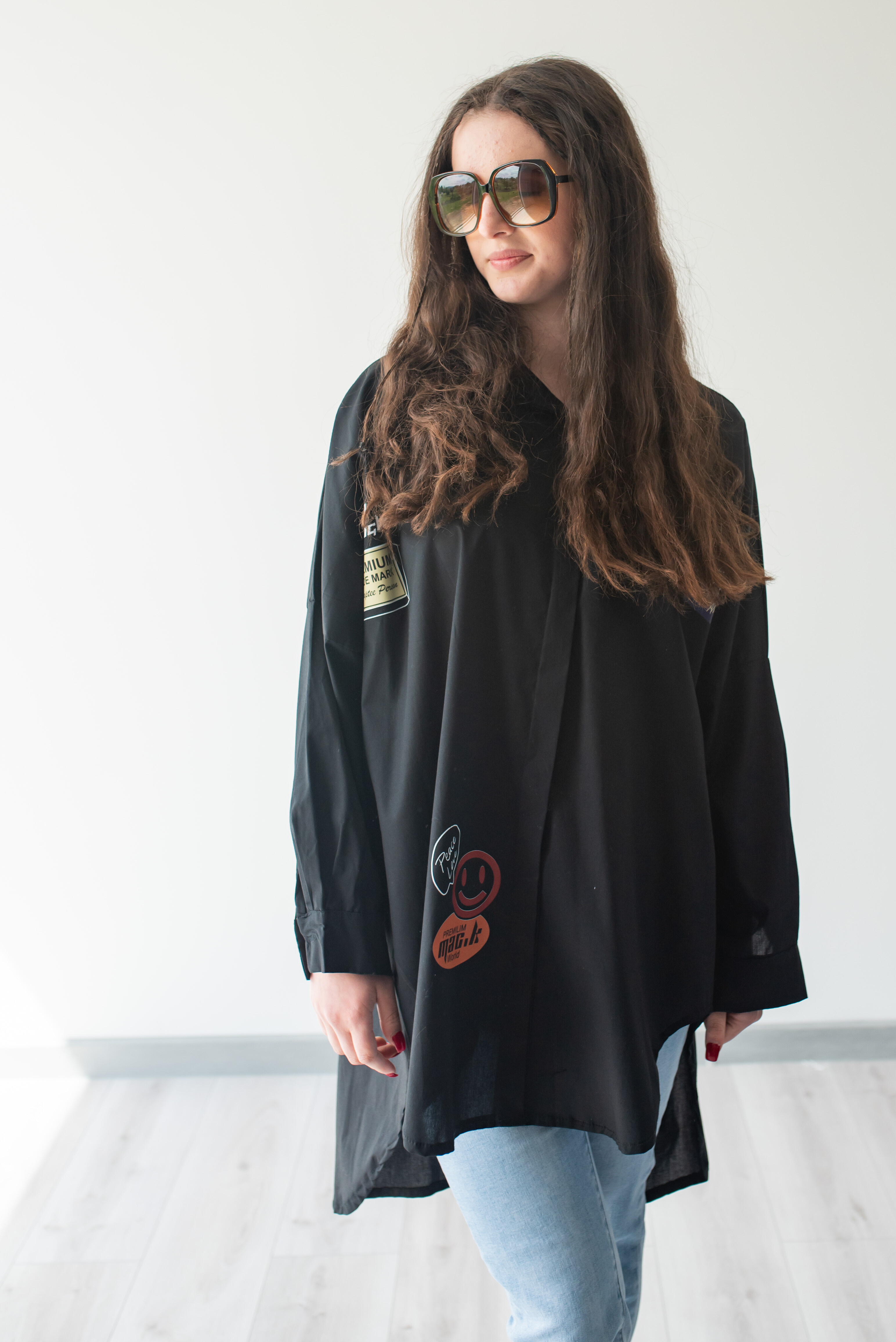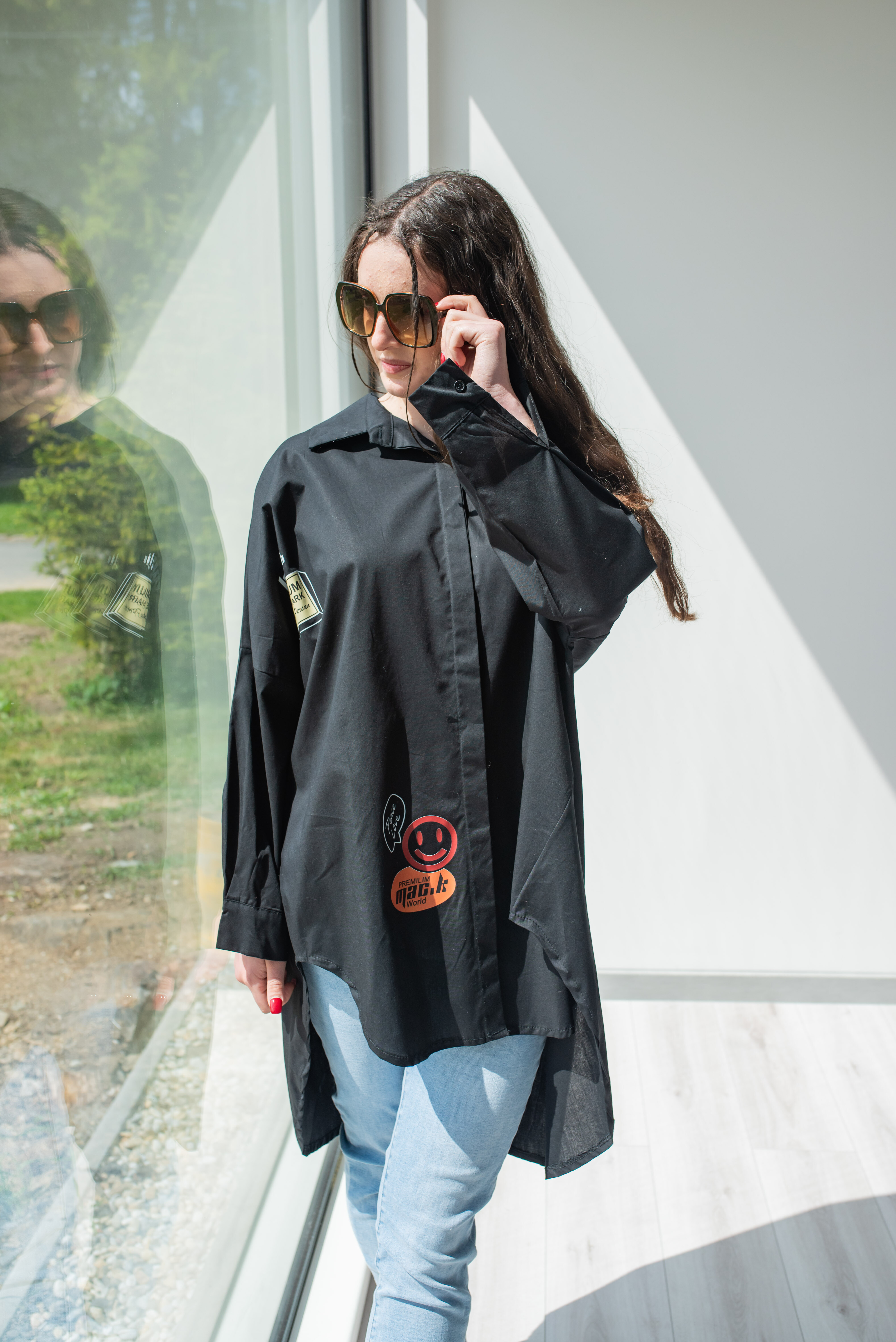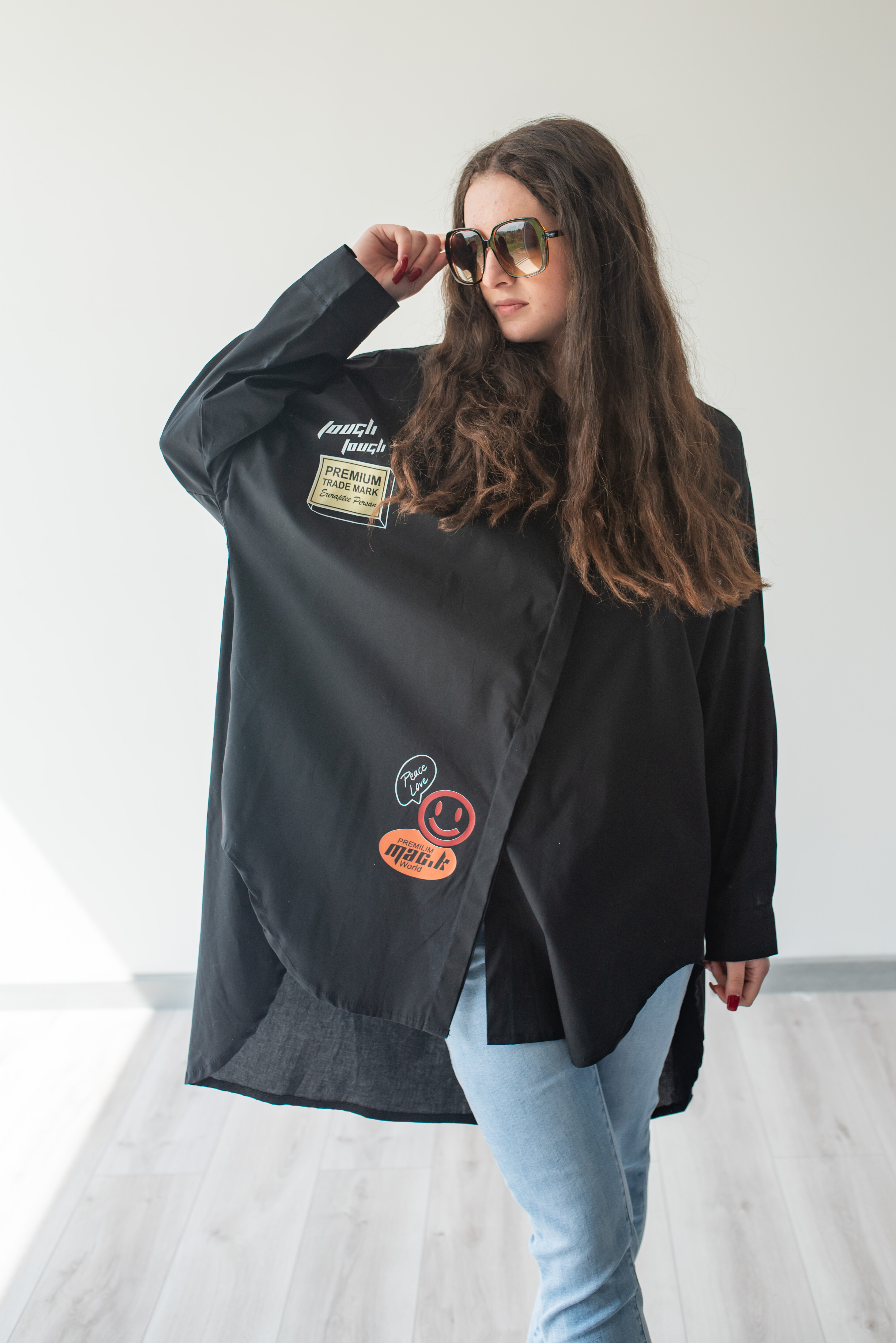 Dámská stylová košile oversize střihu s aplikací. Košile má dlouhý rukáv, je propínací a má prodlouženou zadní délku.