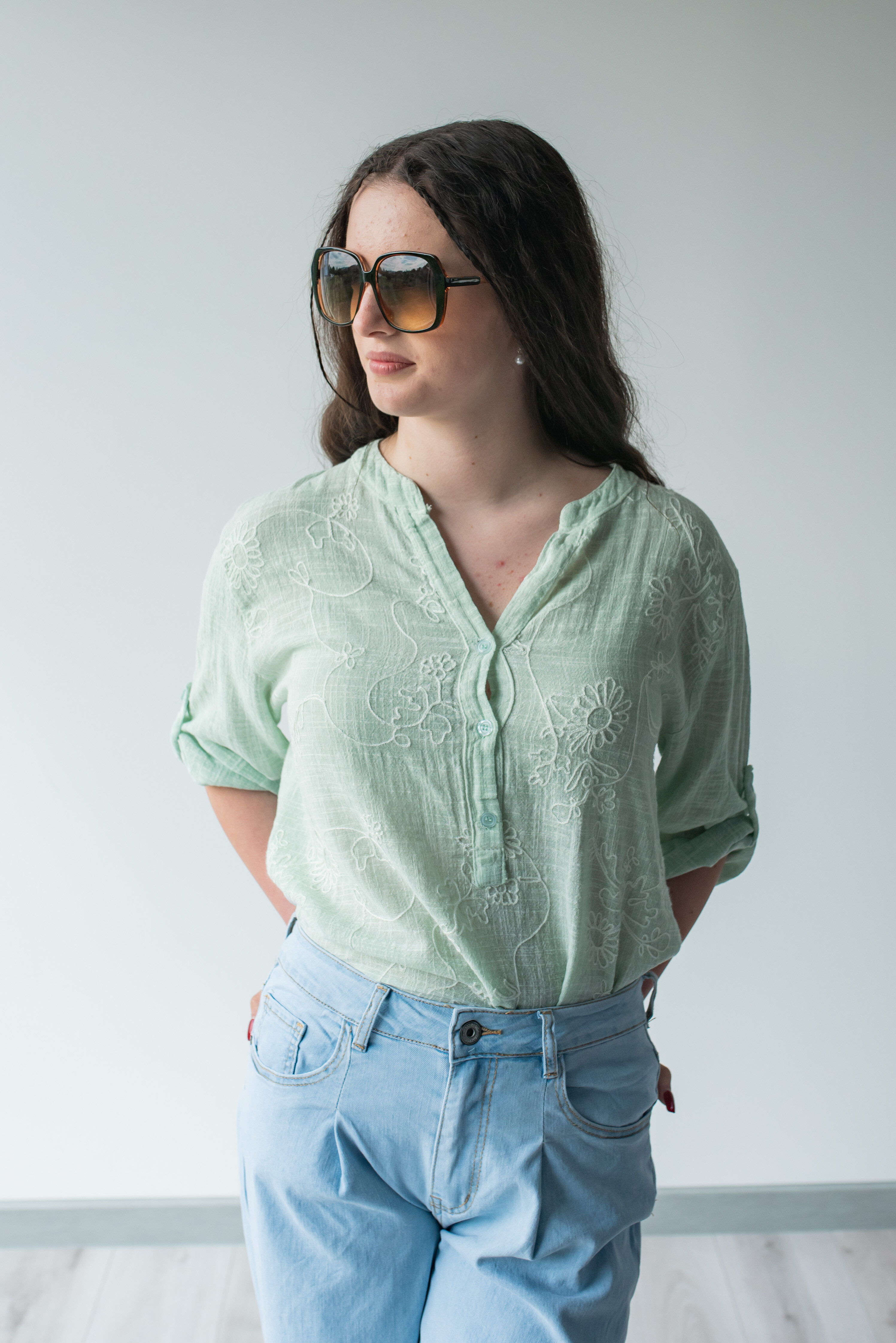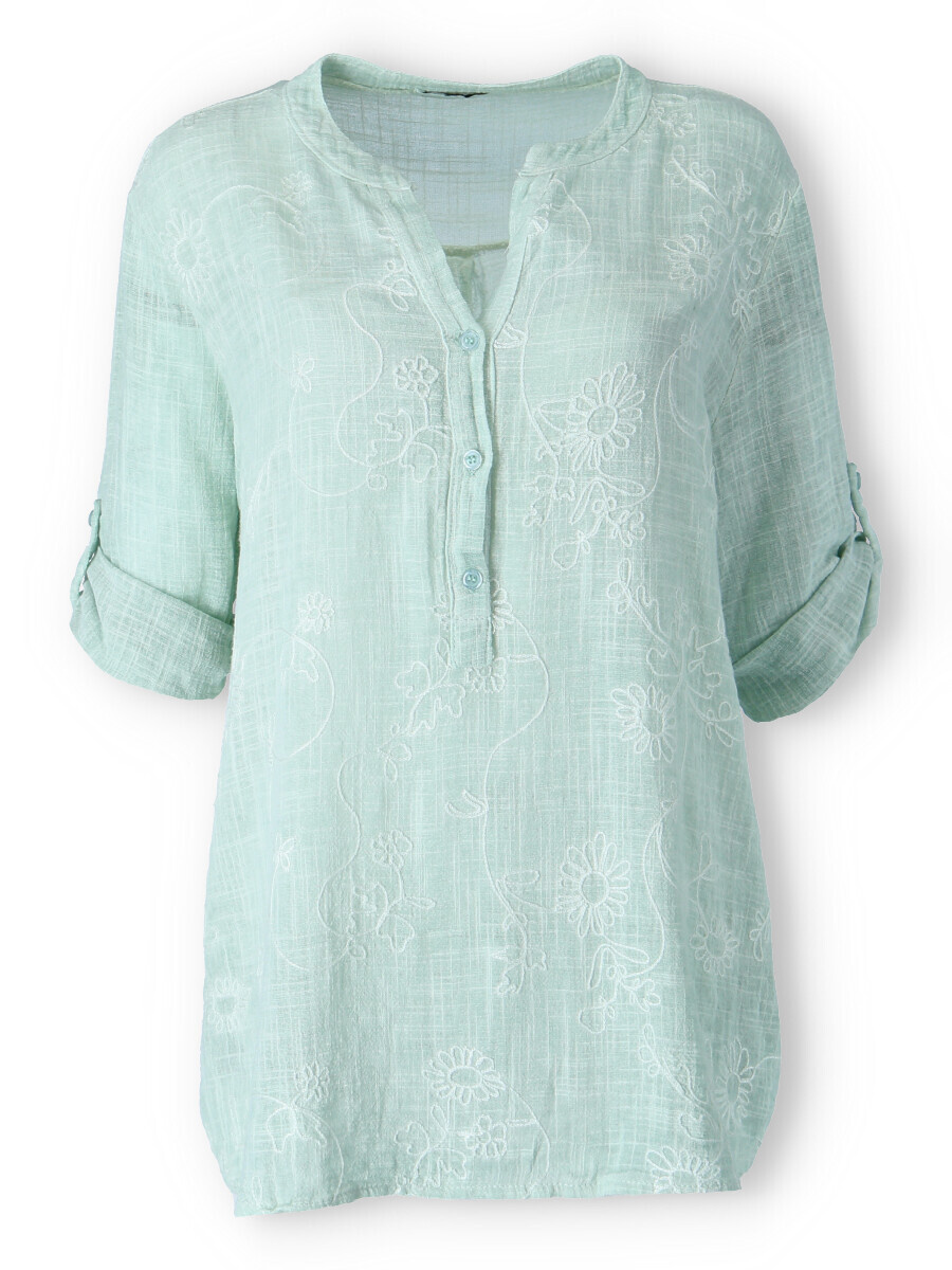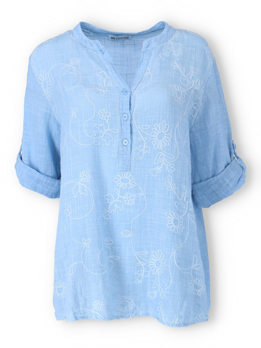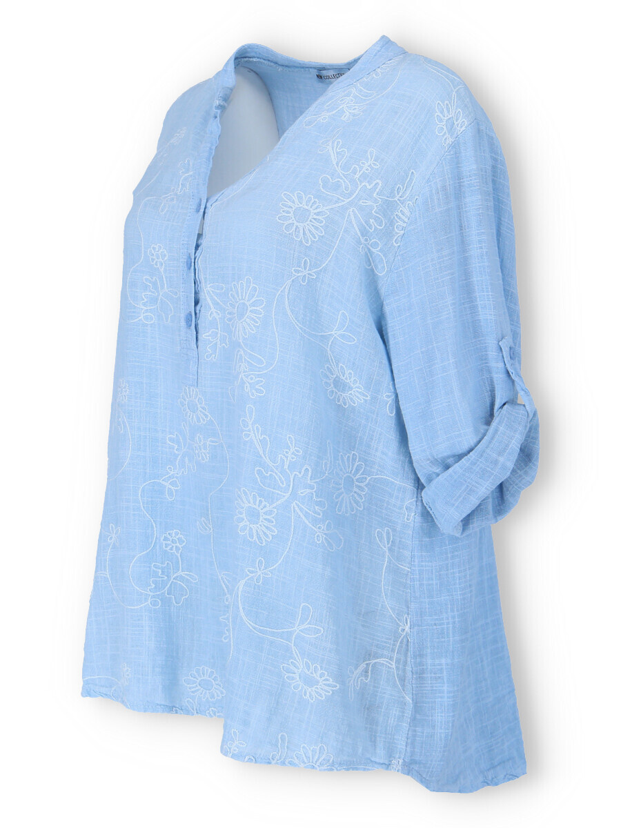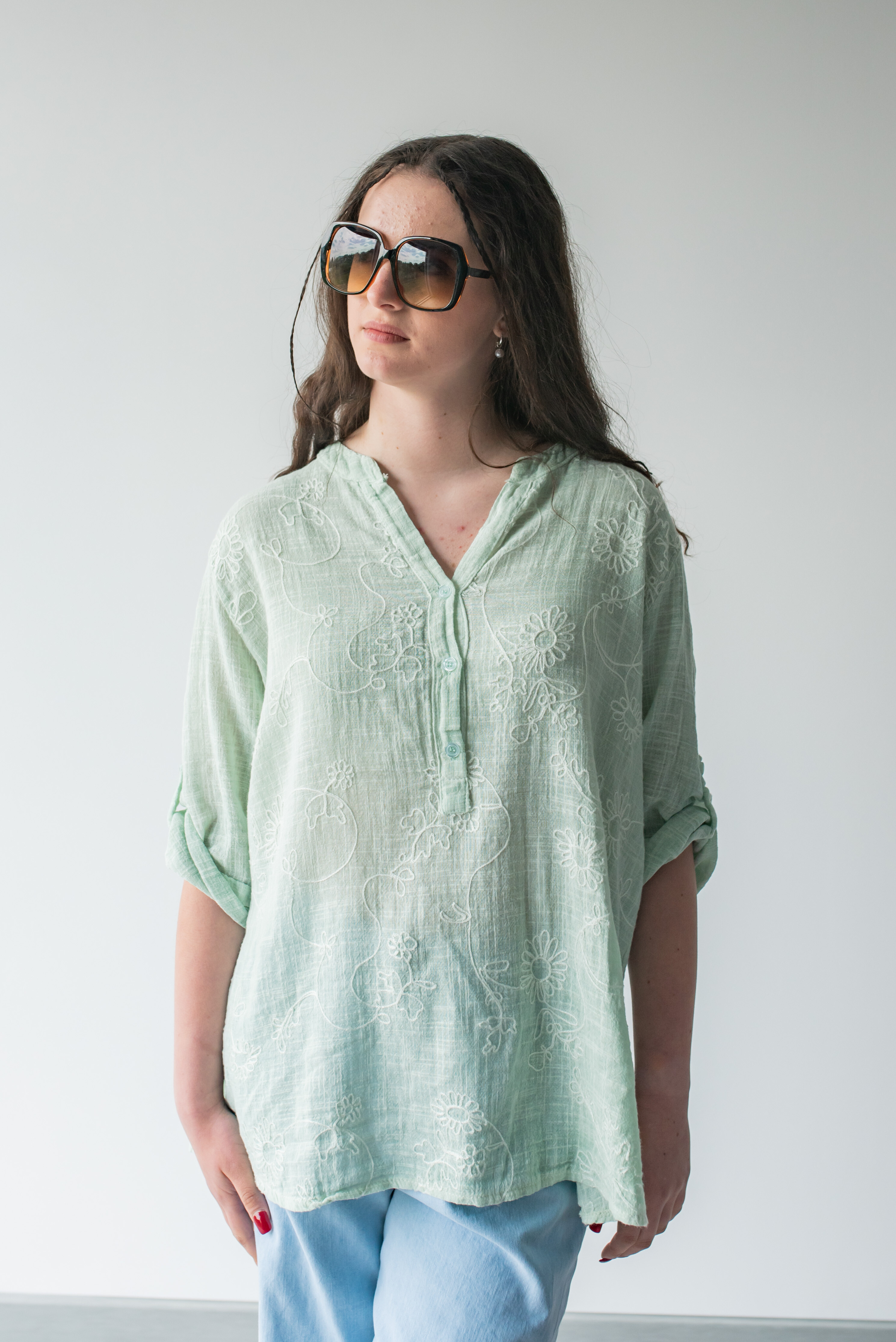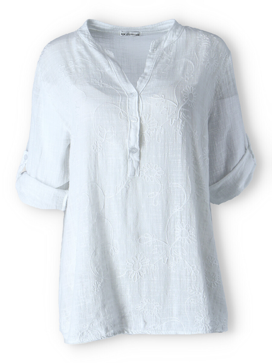 Dámská vyšívaná košile s 3/4 rukávem s regulací. Košile má kulatý výstřih na knoflíčky a prodlouženou zadní délku. Vyrobeno v Itálii.