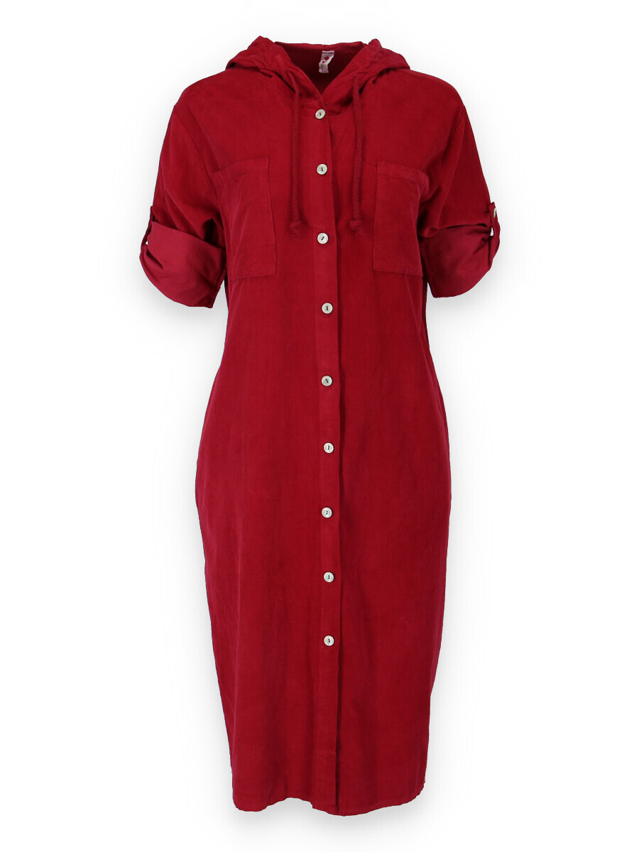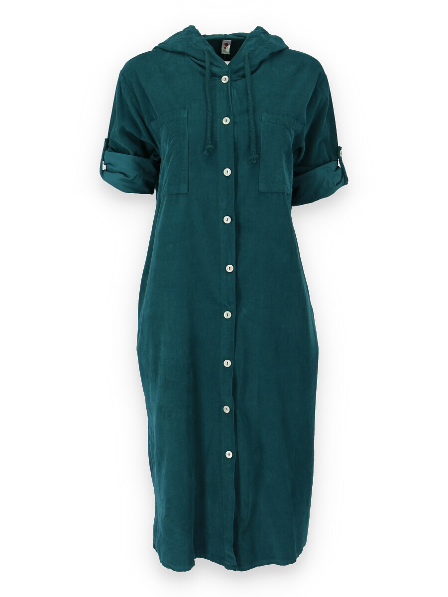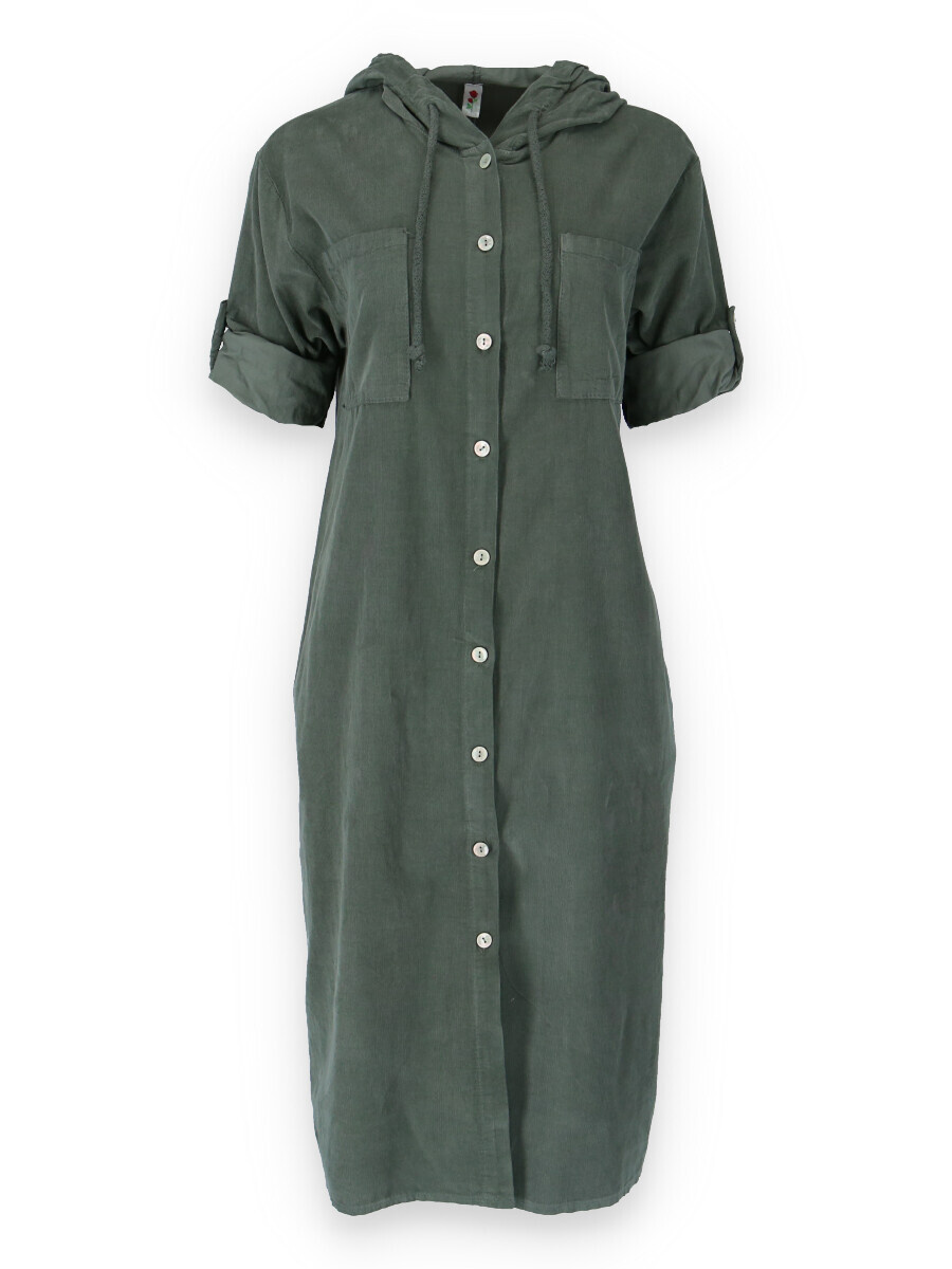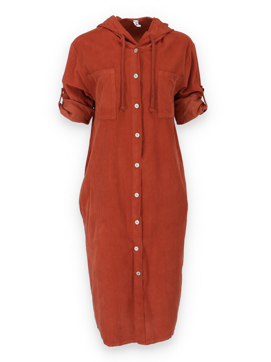 Bavlněná šatovka s kapucí z bavlněného manšestru s dlouhým rukávem. Šatovka je celo propínací, v oblasti hrudníku našité kapsy