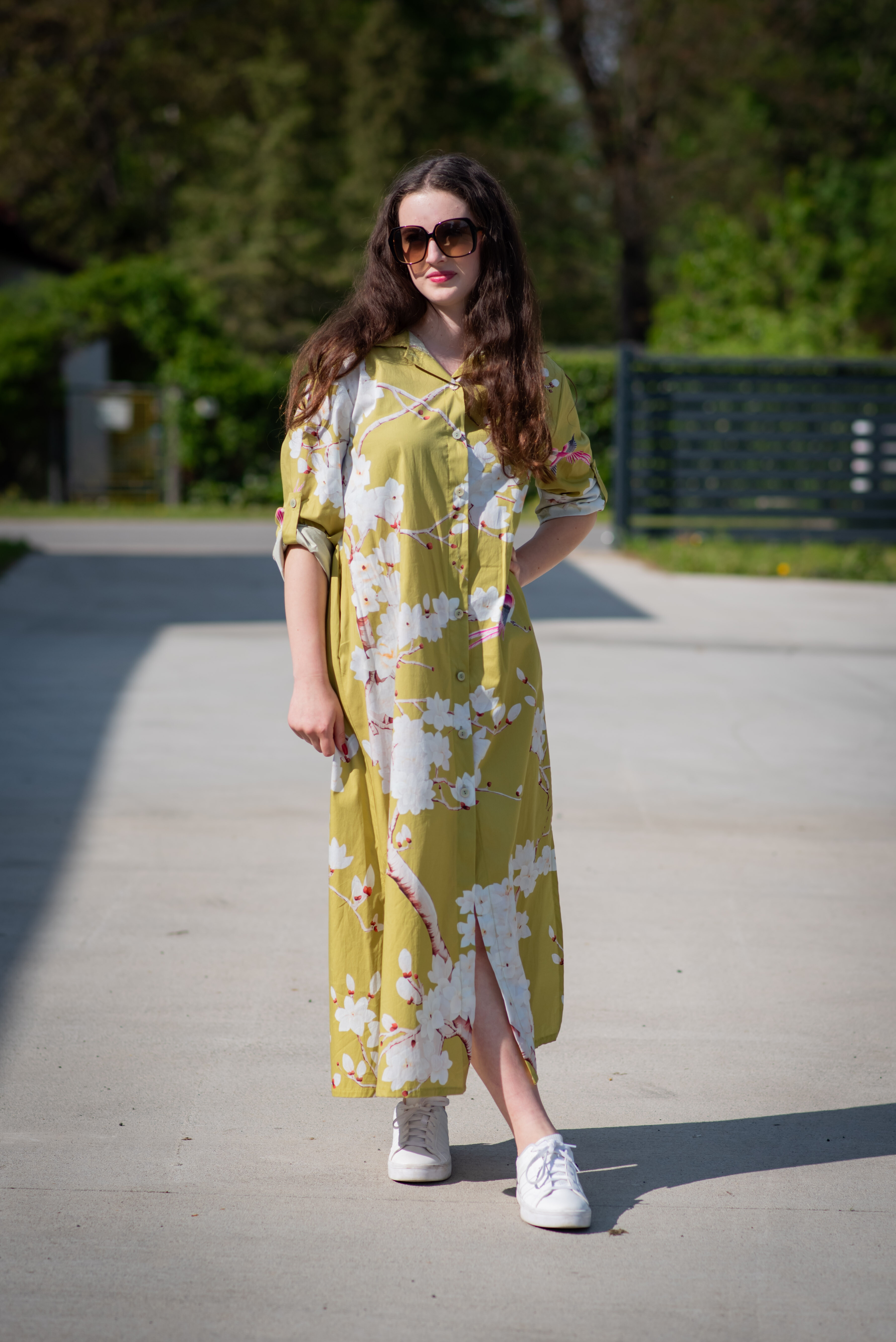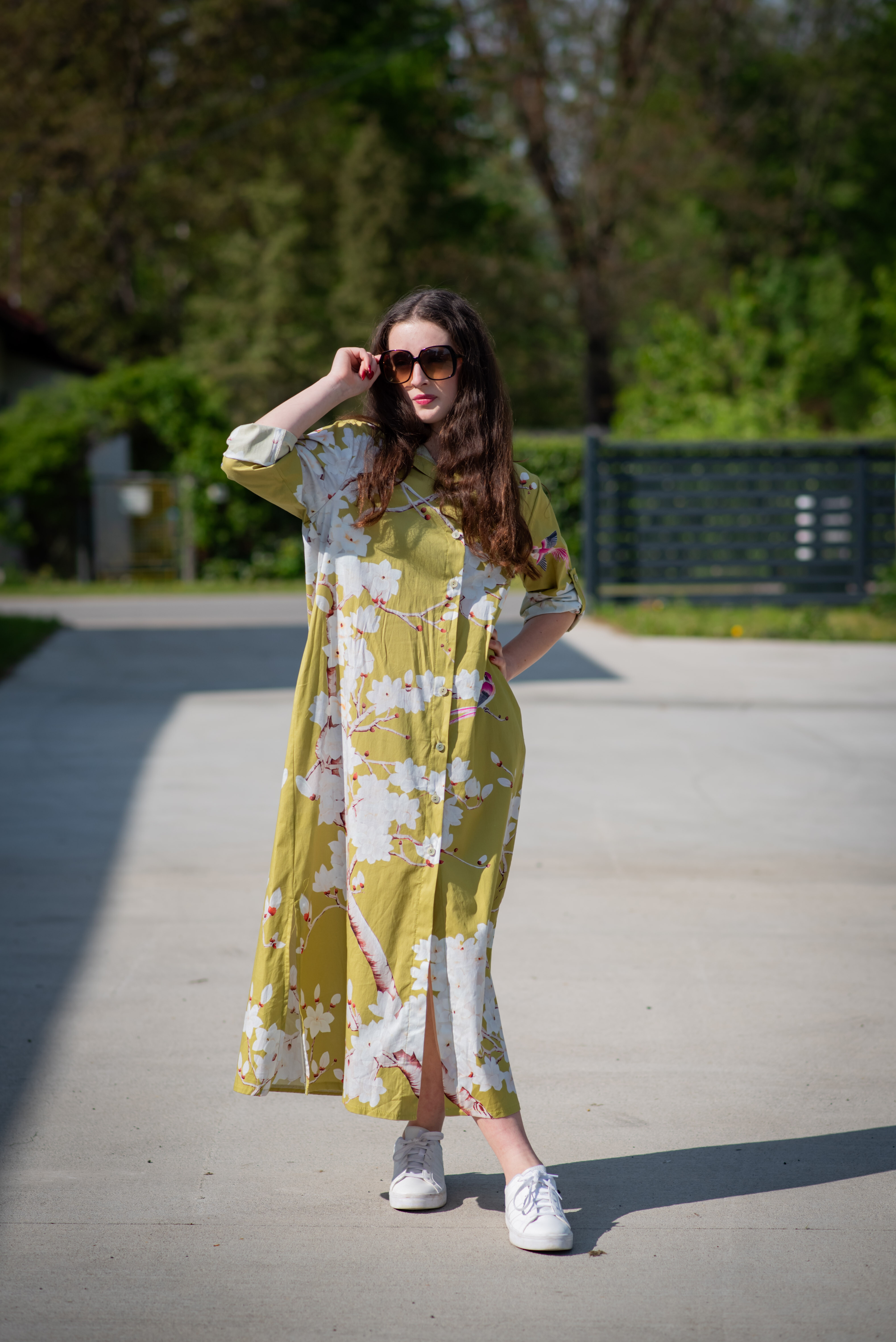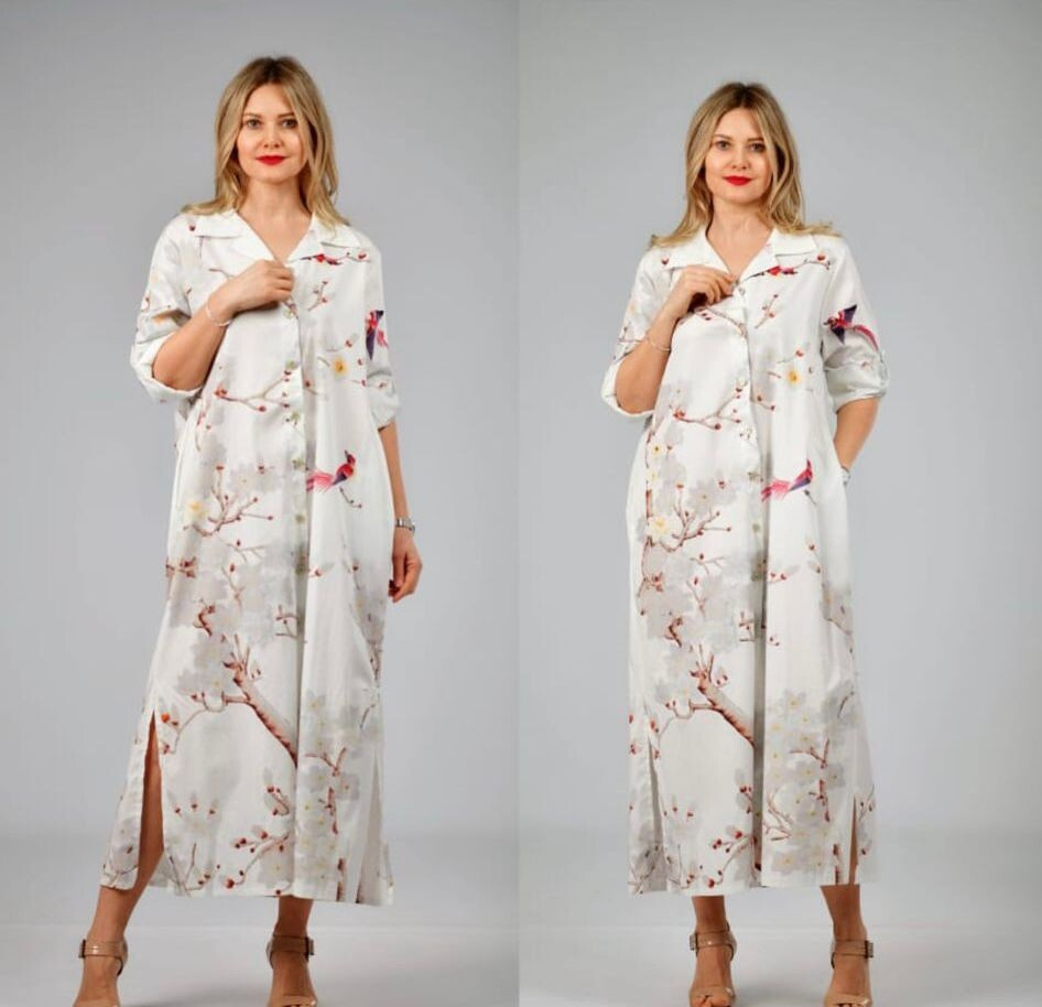 Dlouhé košilové propínací šaty s potiskem. Šaty mají regulaci na rukávu a všité kapsy po stranách. Dovoz Itálie