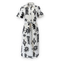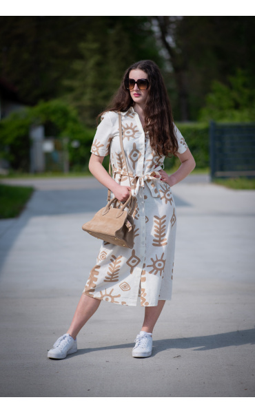 Dlouhé košilové šaty s potiskem. Šaty mají límeček, krátký rukáv, jsou celo propínací a doplněny páskem.