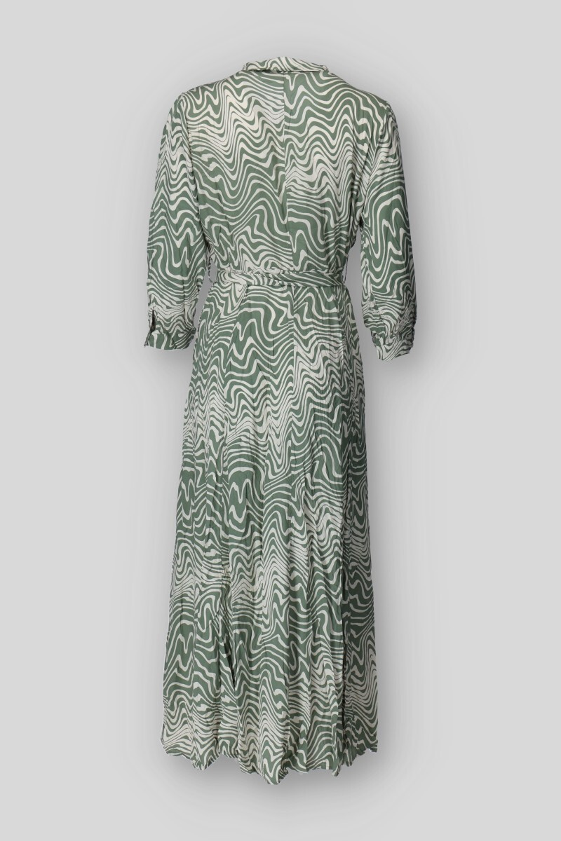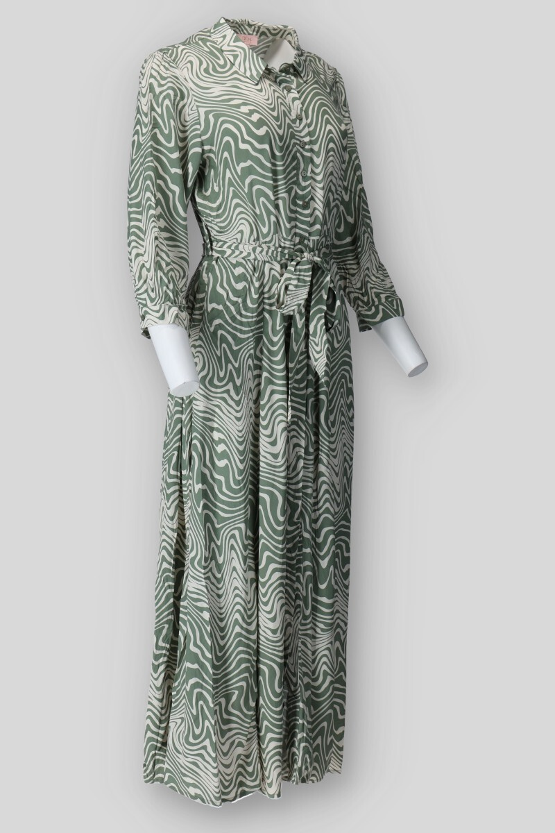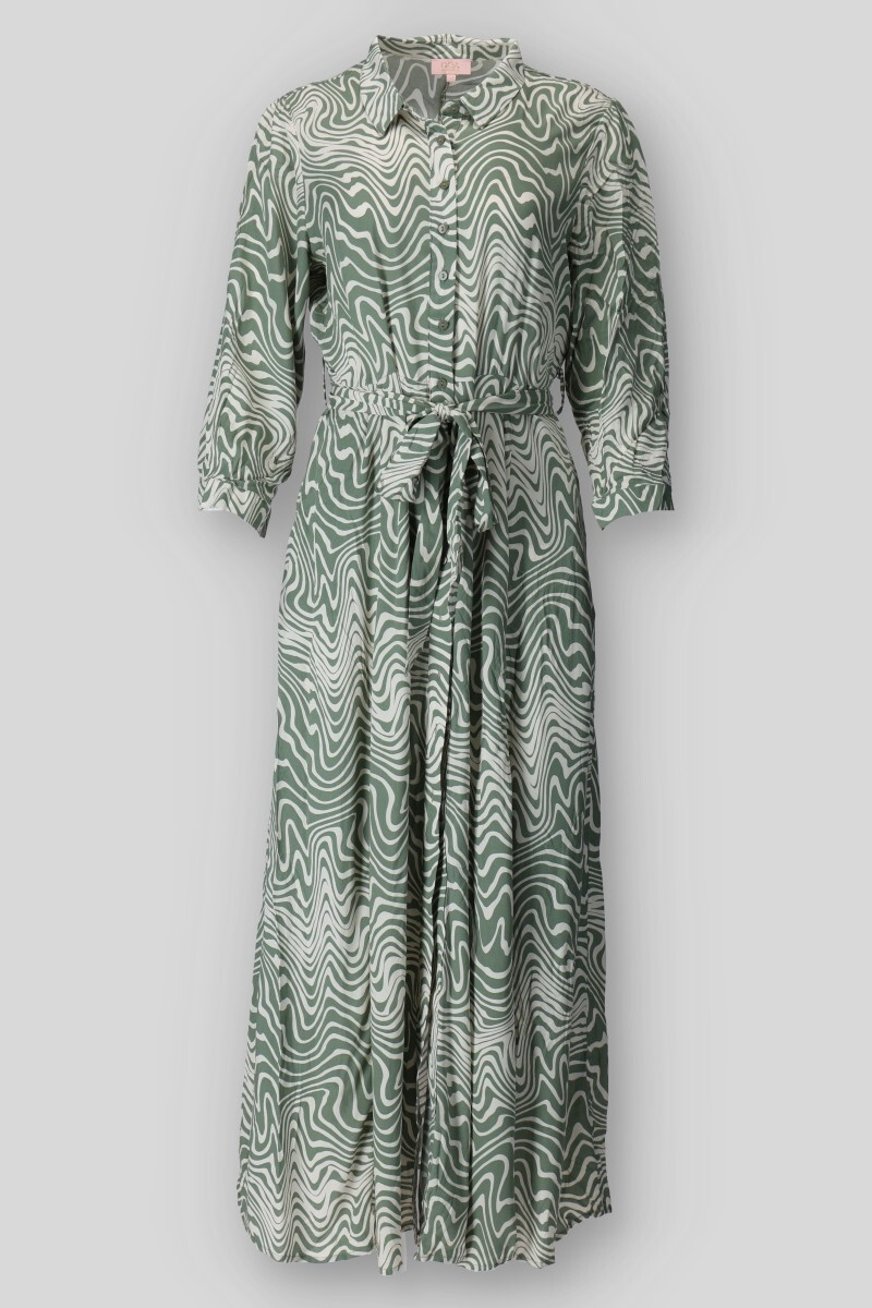 Dlouhé košilové šaty s potiskem. Šaty mají límeček, dlouhý rukáv, jsou celo propínací a doplněny páskem. Všité kapsy po stranách.