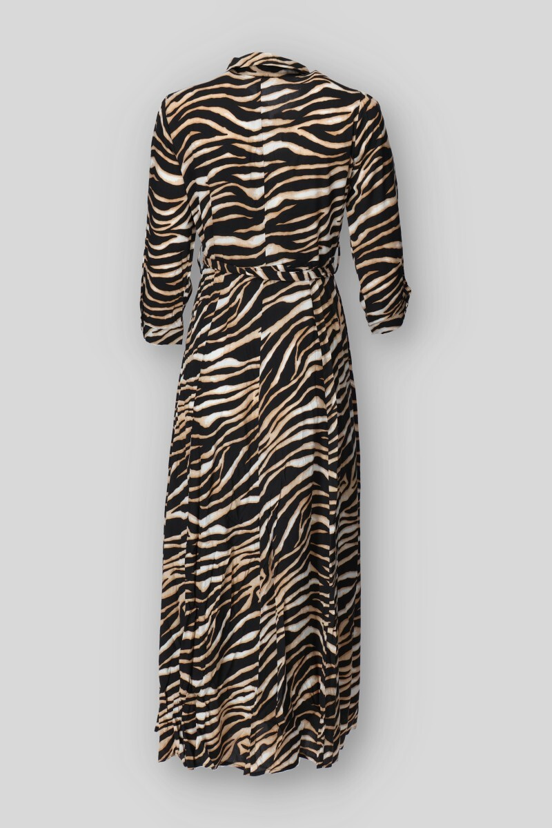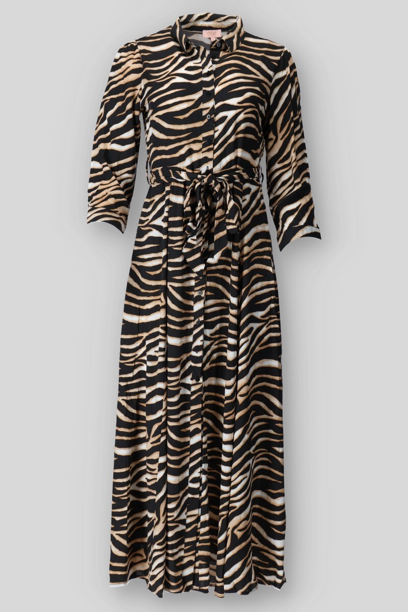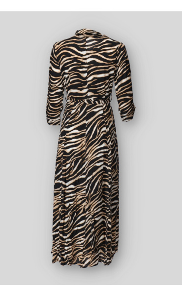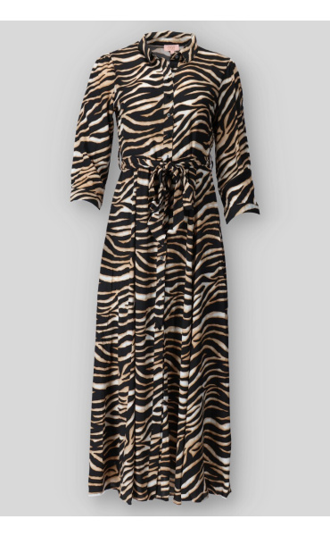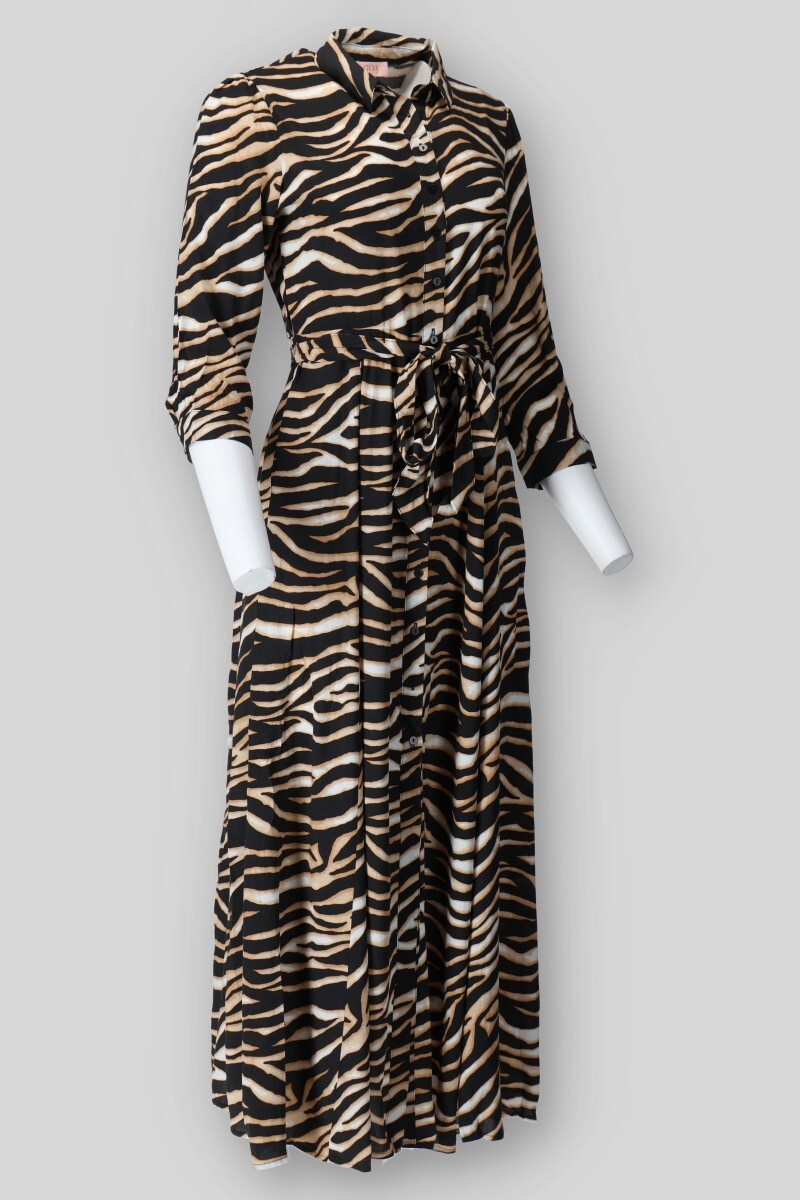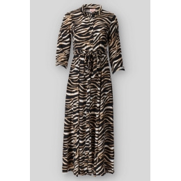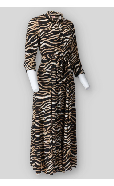 Dlouhé košilové šaty s potiskem. Šaty mají límeček, dlouhý rukáv, jsou celo propínací a doplněny páskem. Všité kapsy po stranách.