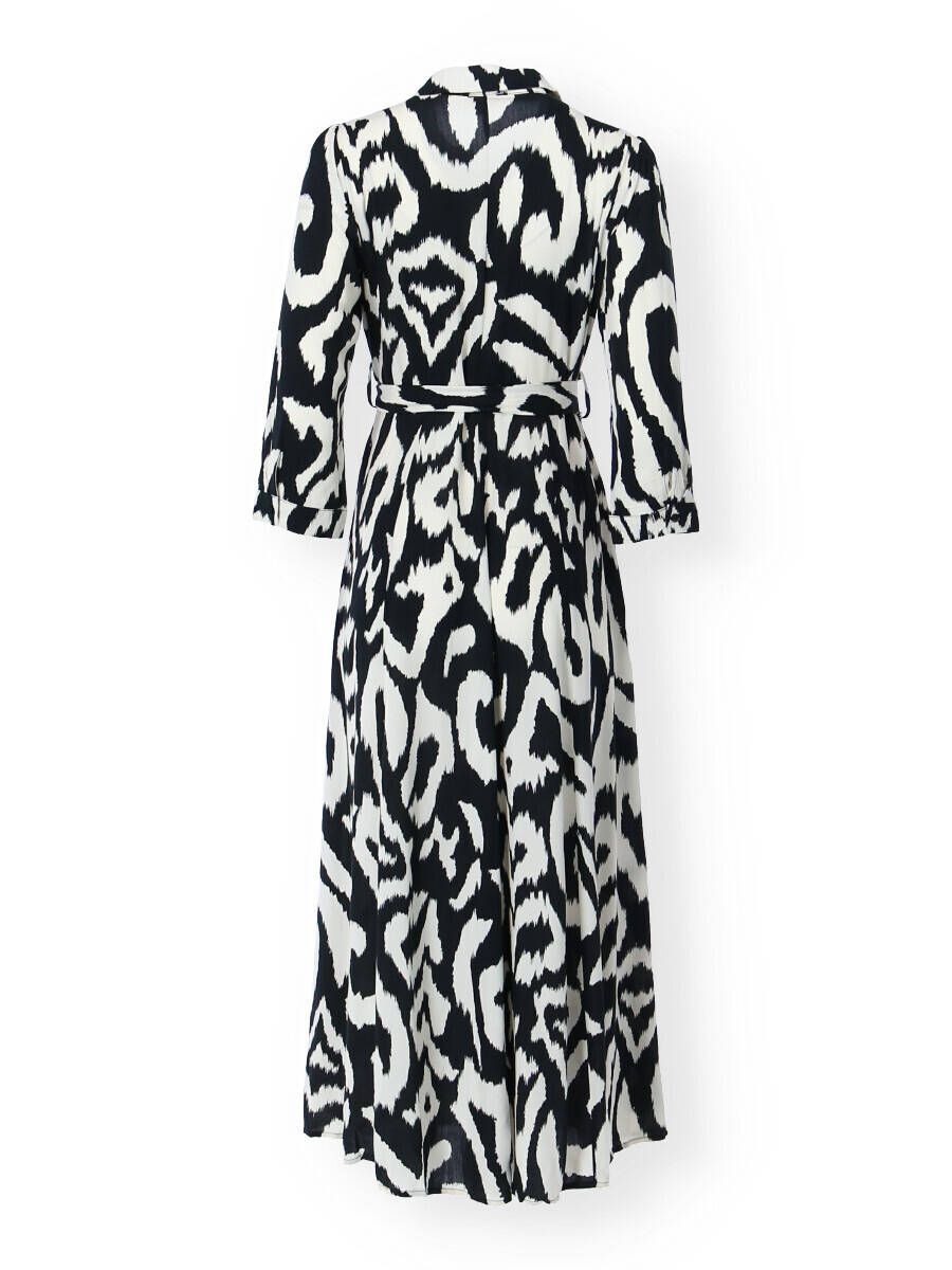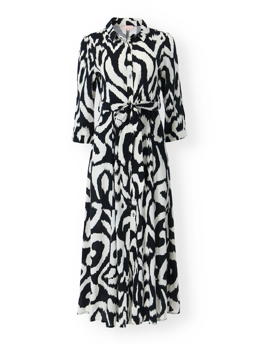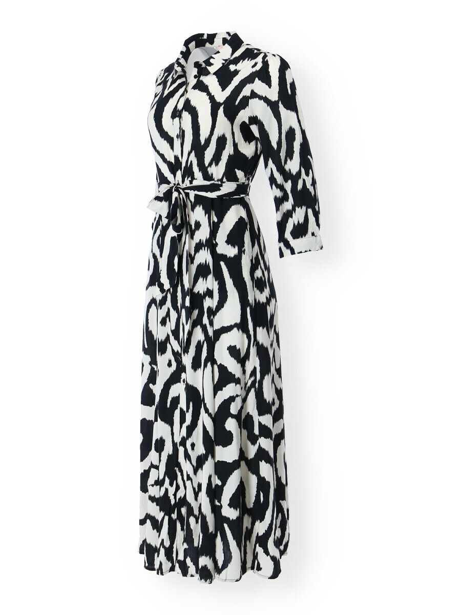 Dlouhé košilové šaty s potiskem. Šaty mají límeček, dlouhý rukáv, jsou celo propínací a doplněny páskem. Všité kapsy po stranách.