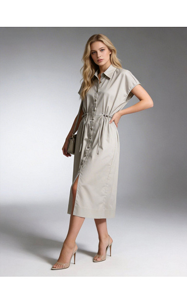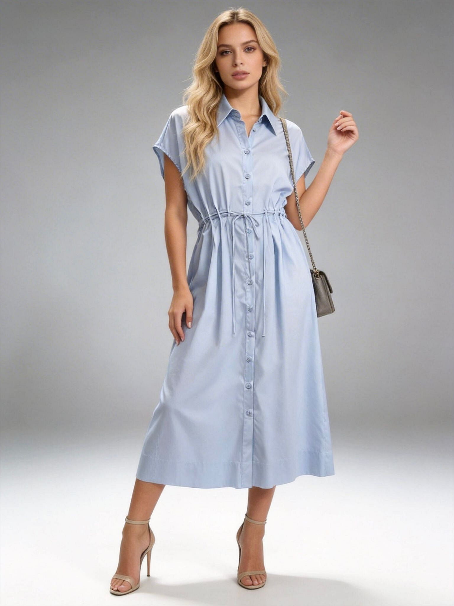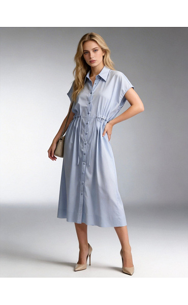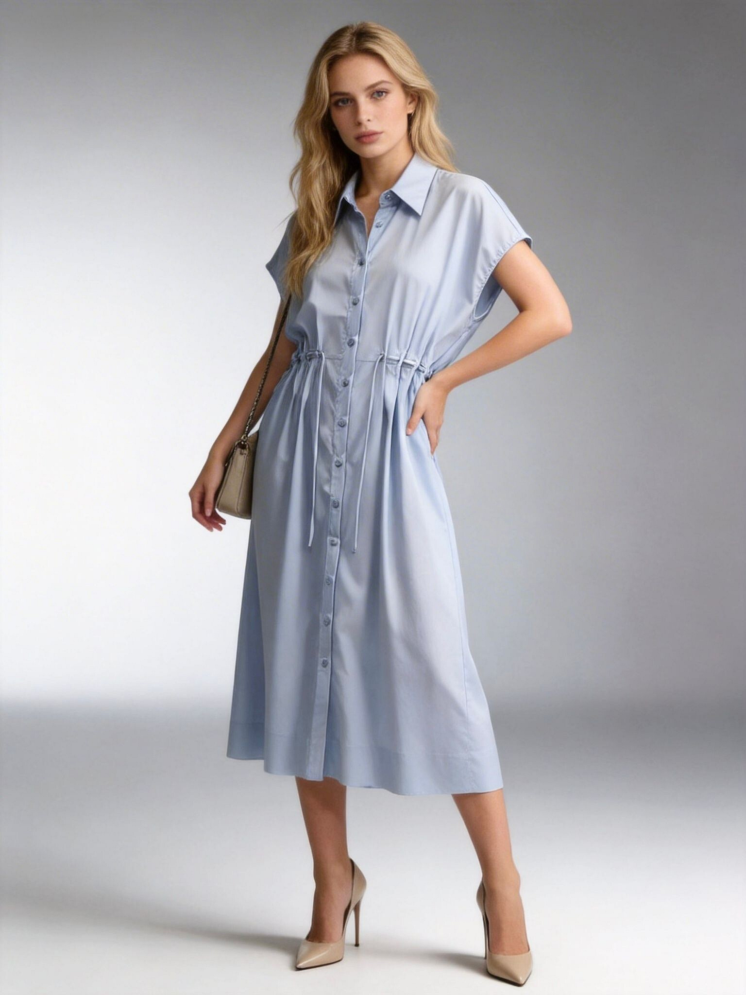 Dámské košilové propínací šaty s regulací na šňůrku v pase. Šaty jsou v pase nařasené a mají krátký rukáv.