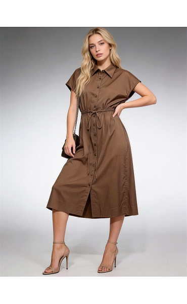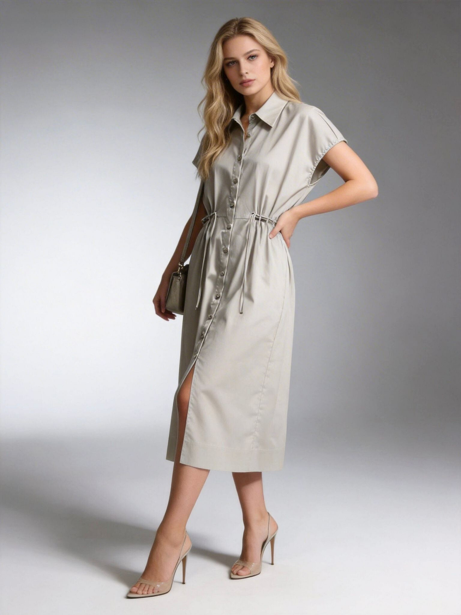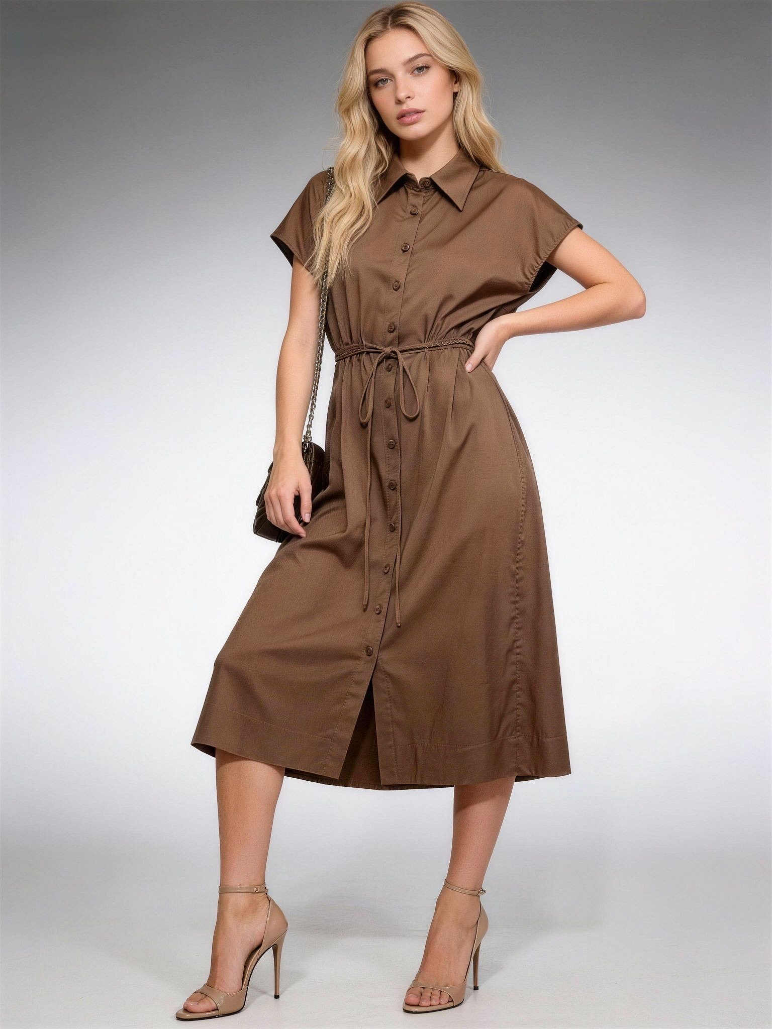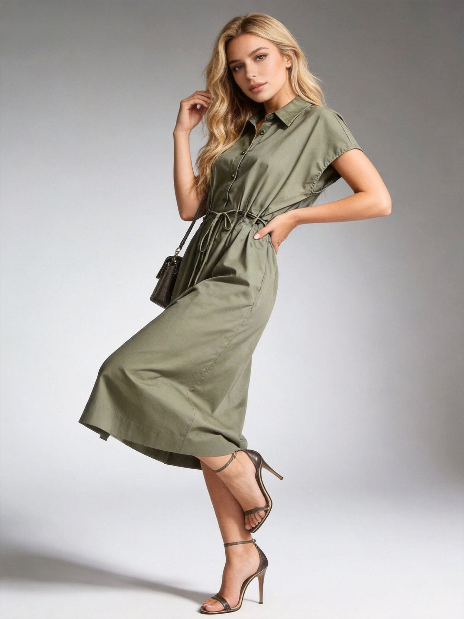 Dámské košilové propínací šaty s regulací na šňůrku v pase. Šaty jsou v pase nařasené a mají krátký rukáv.