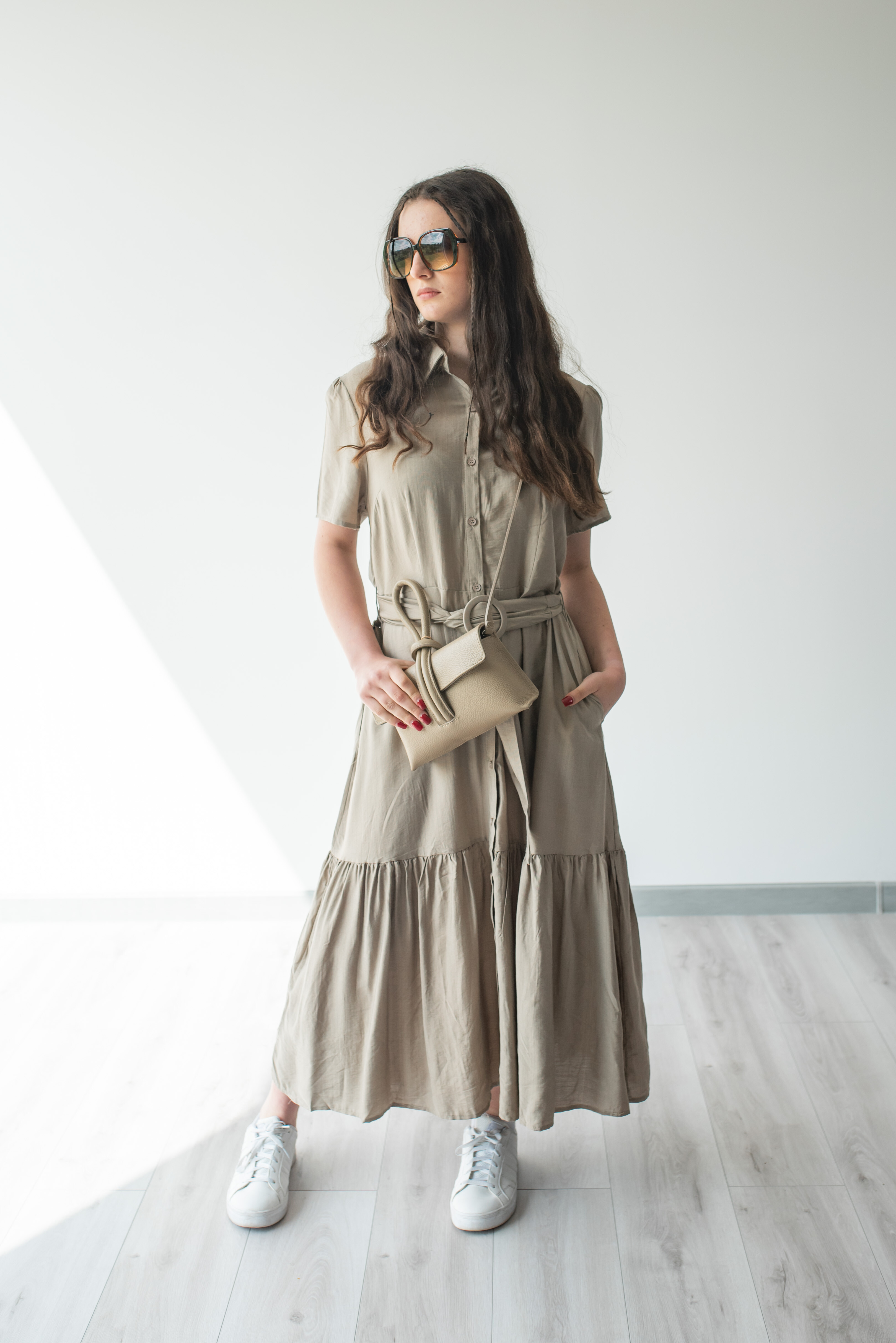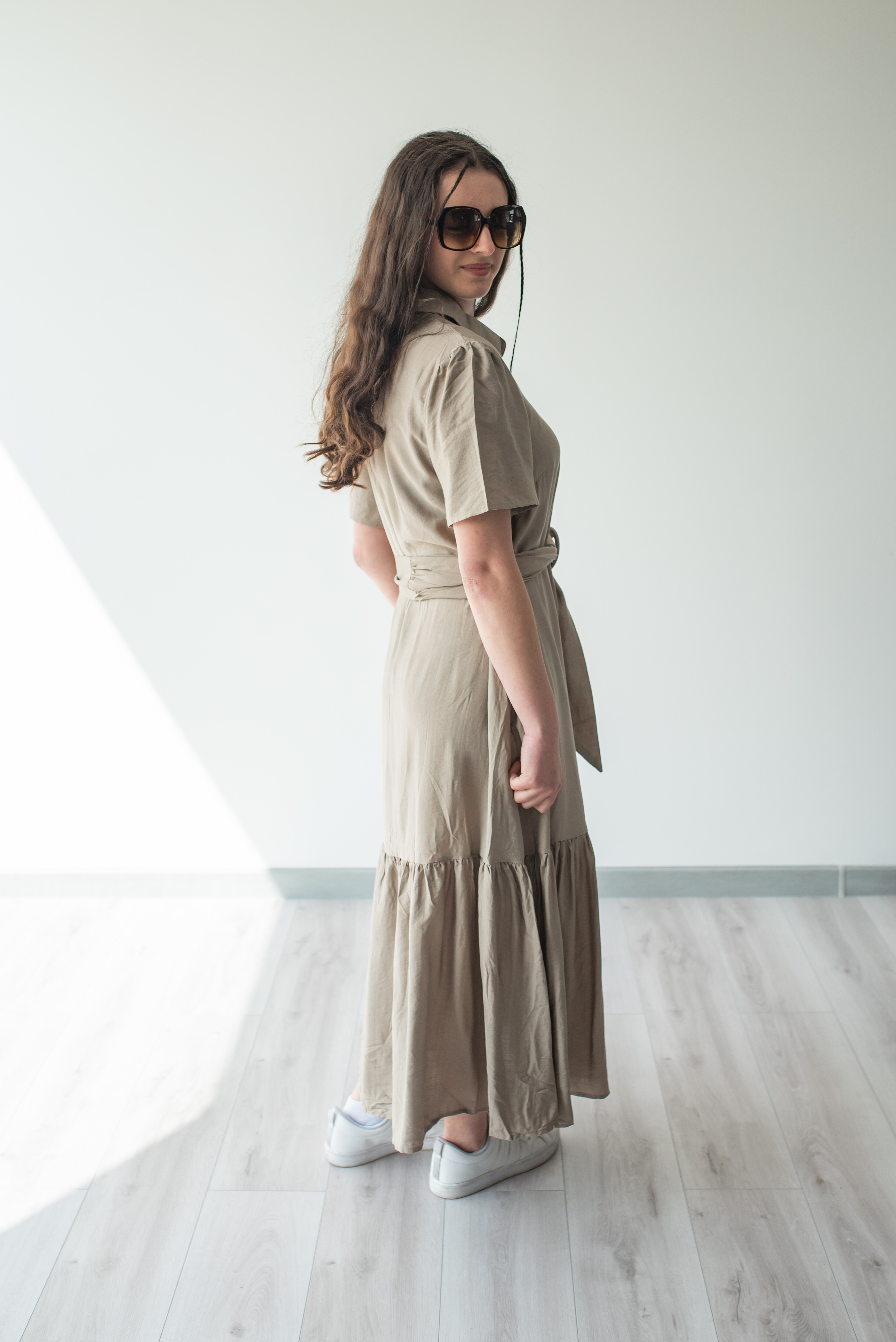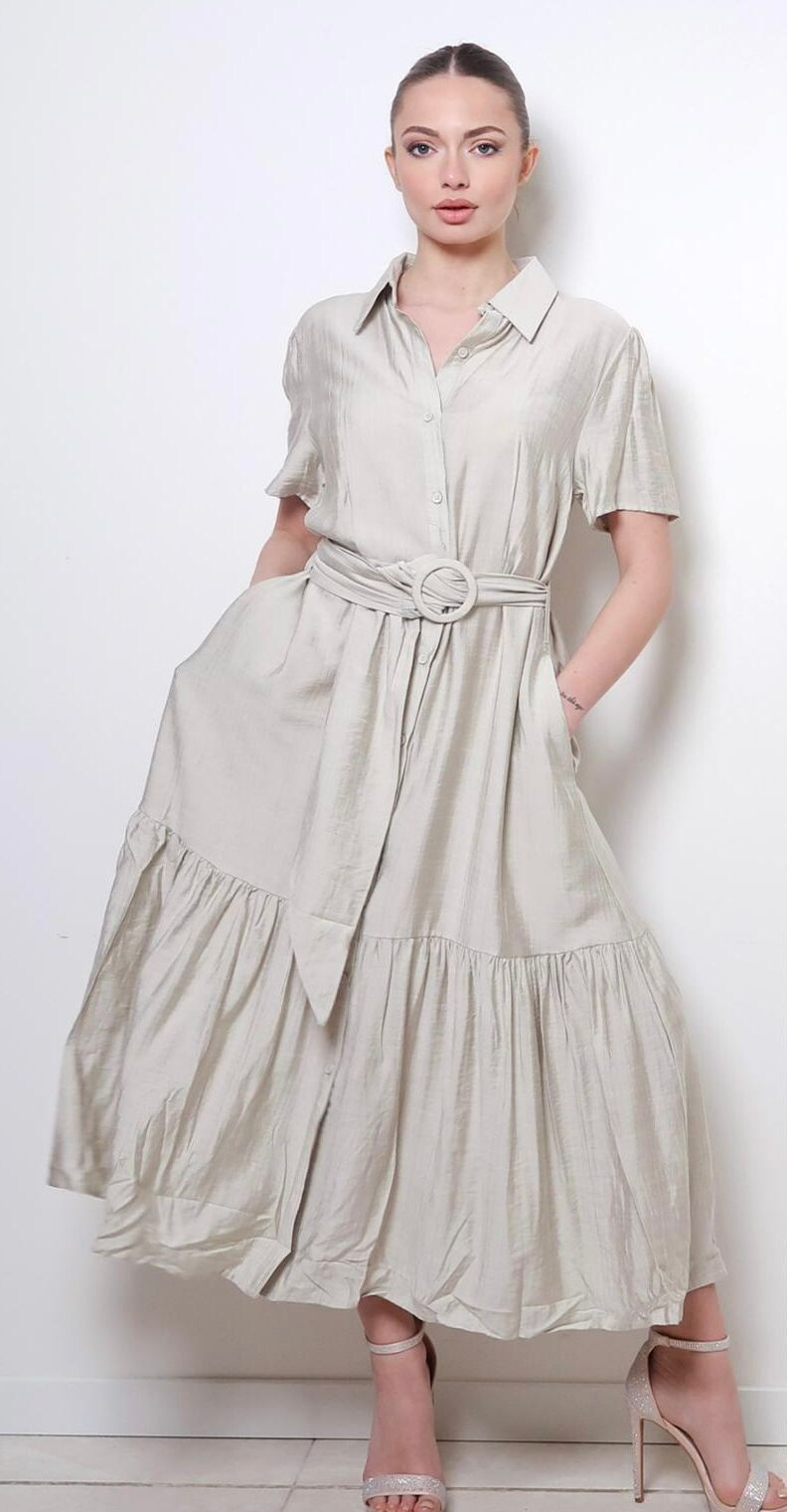 Dámské dlouhé košilové šaty s volánem. Šaty jsou doplněny páskem, mají krátký rukáv, jsou propínací a po stranách mají všité kapsy. Dovezeno z Itálie.