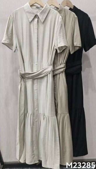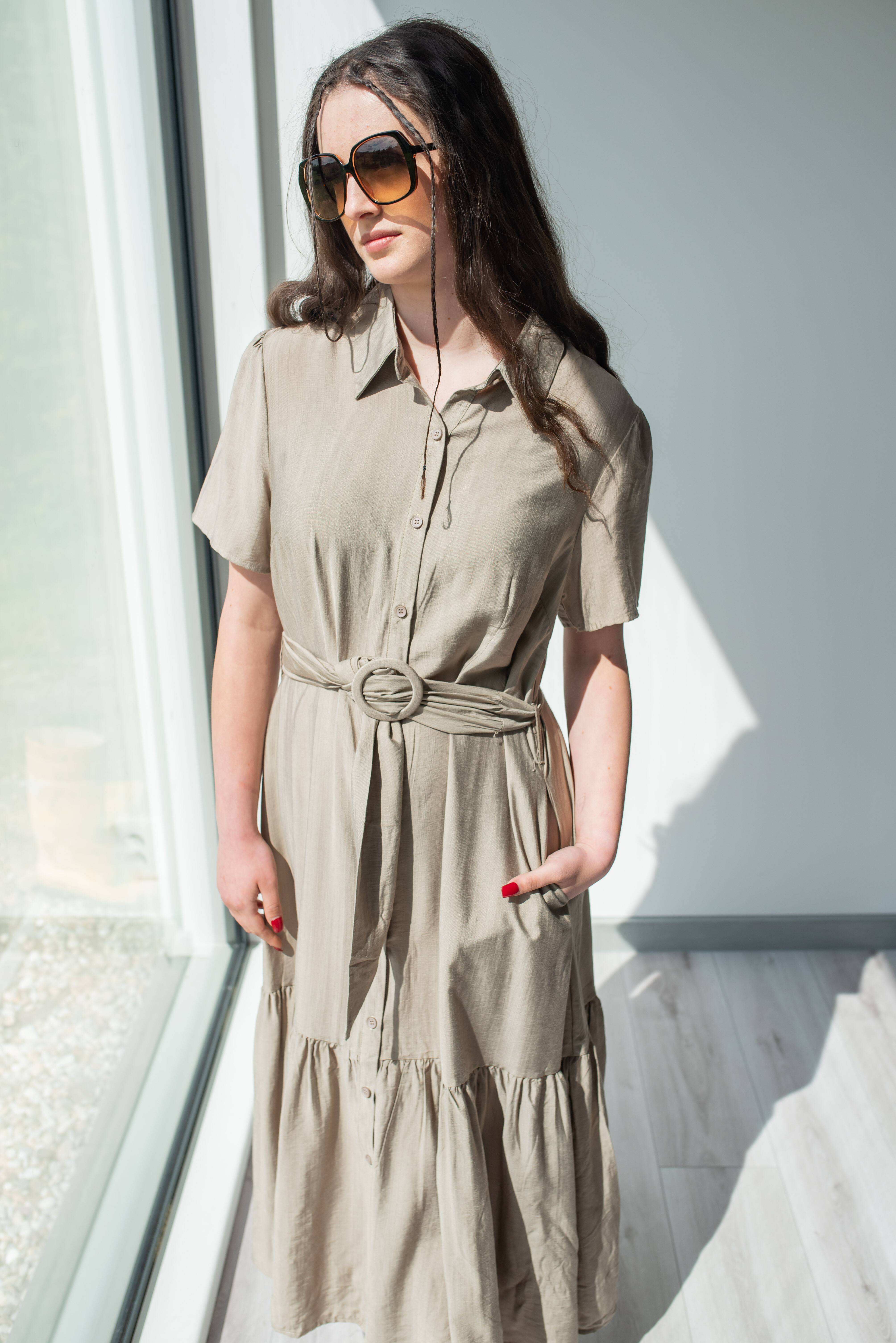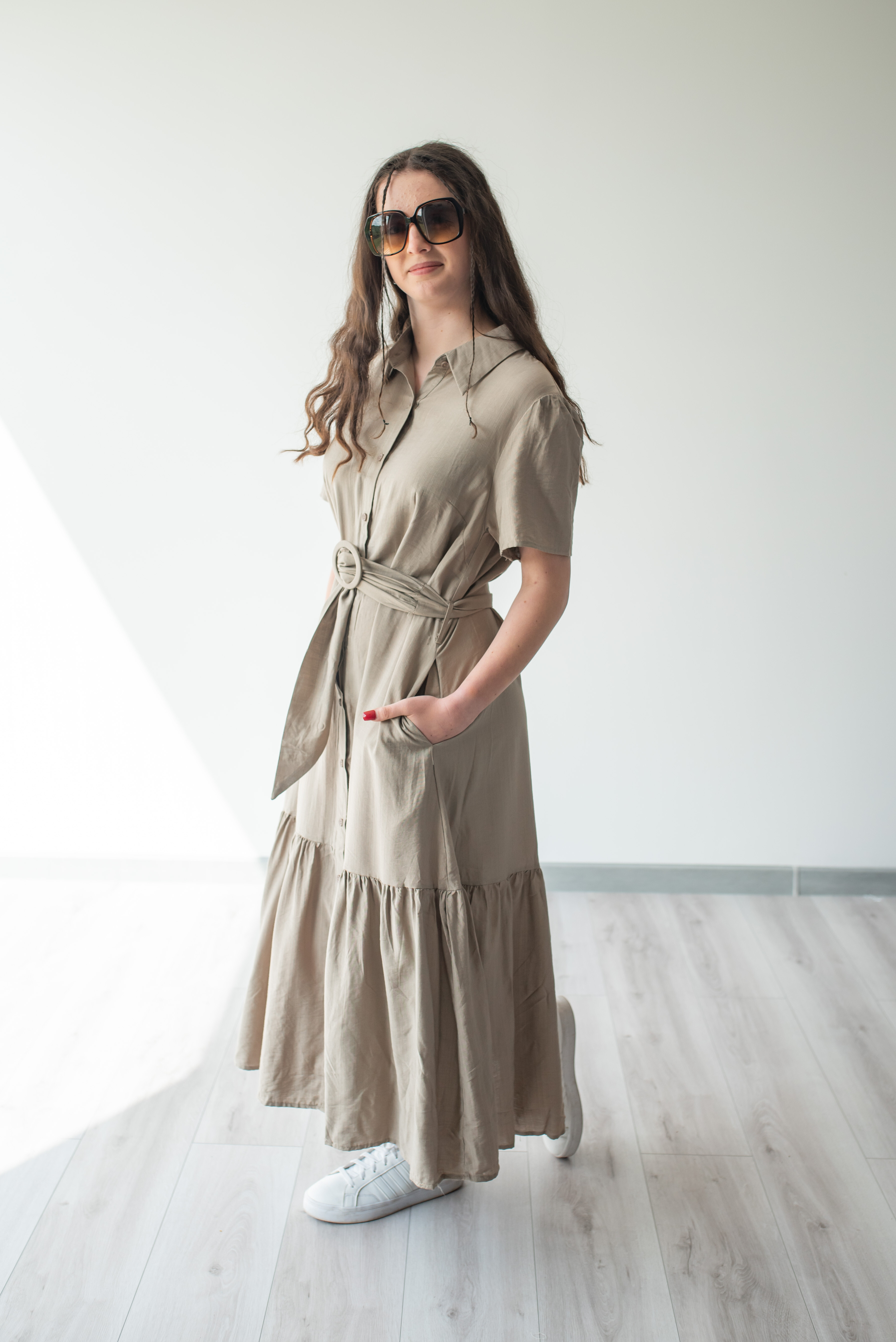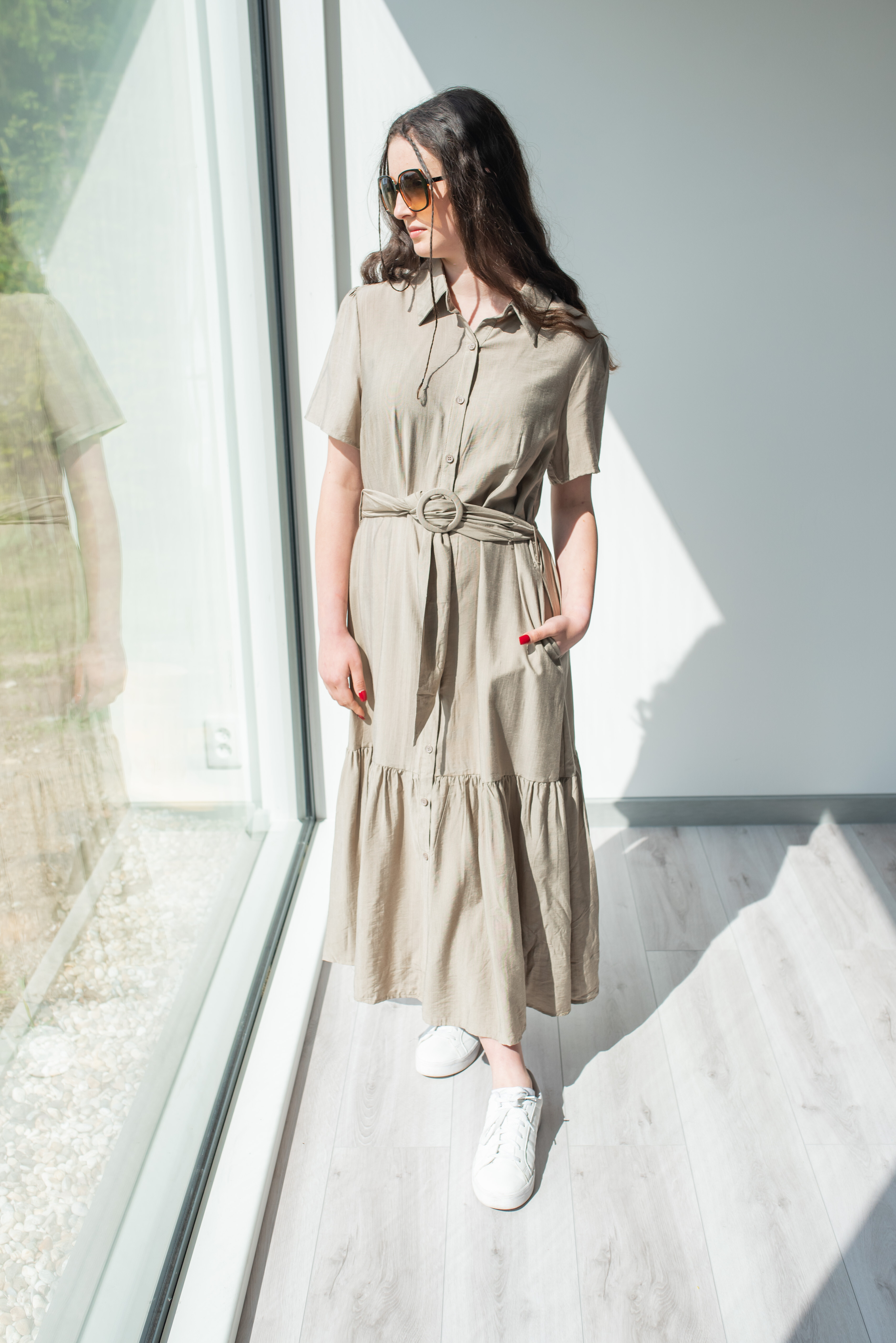 Dámské dlouhé košilové šaty s volánem. Šaty jsou doplněny páskem, mají krátký rukáv, jsou propínací a po stranách mají všité kapsy. Dovezeno z Itálie.