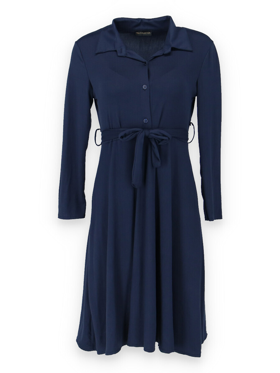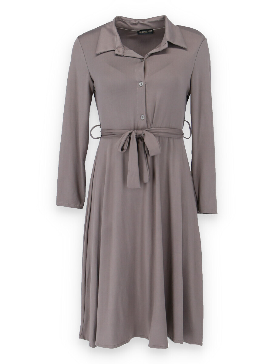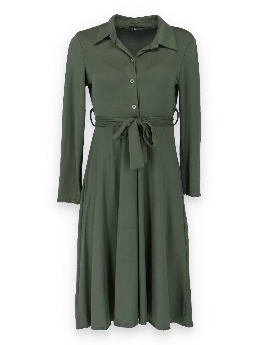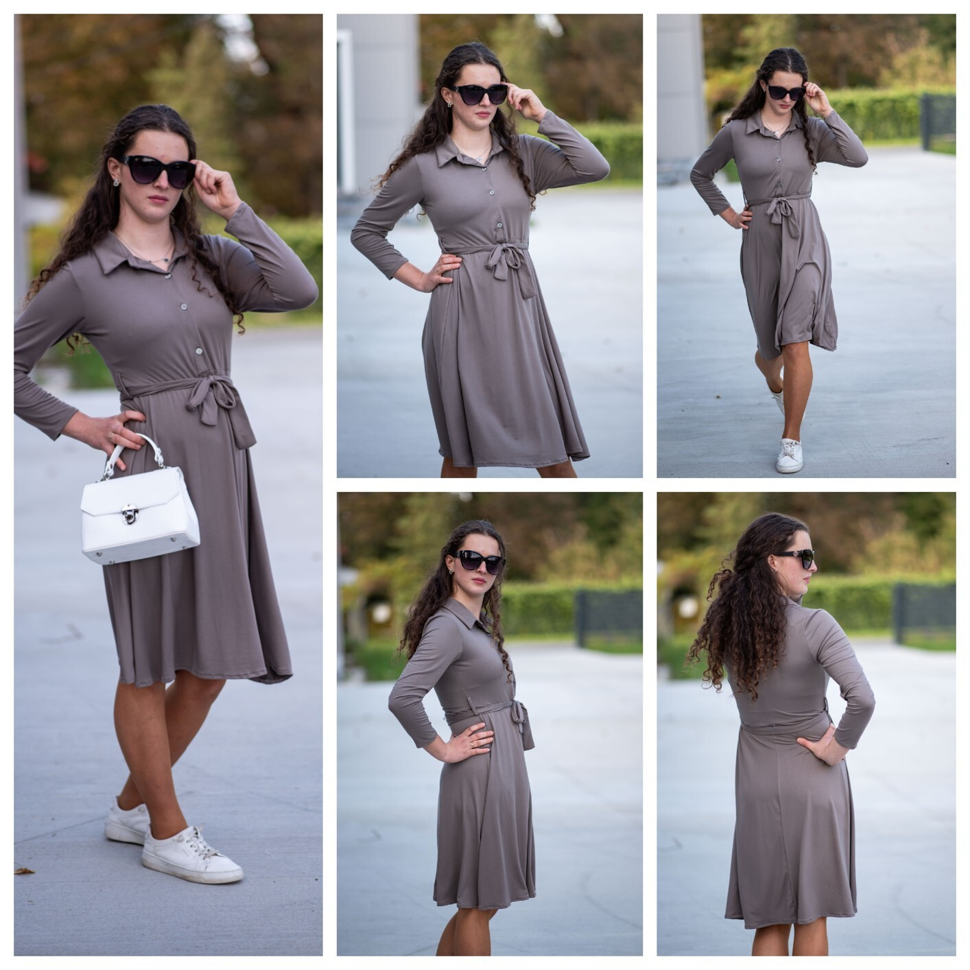 Košilové šaty střední délky, jsou doplněny páskem, propínání do pasu.