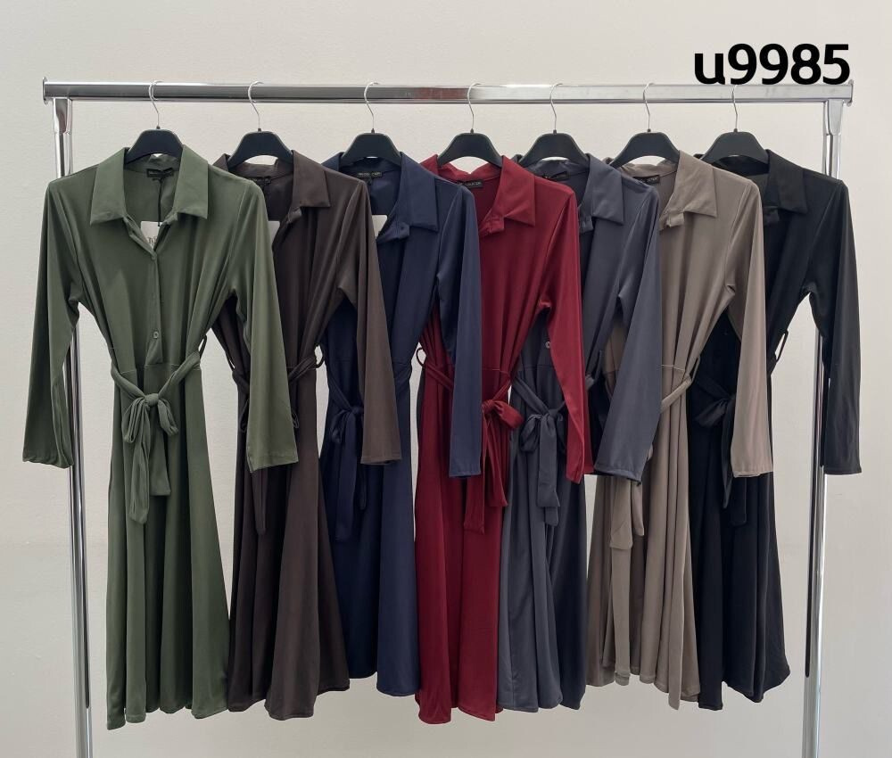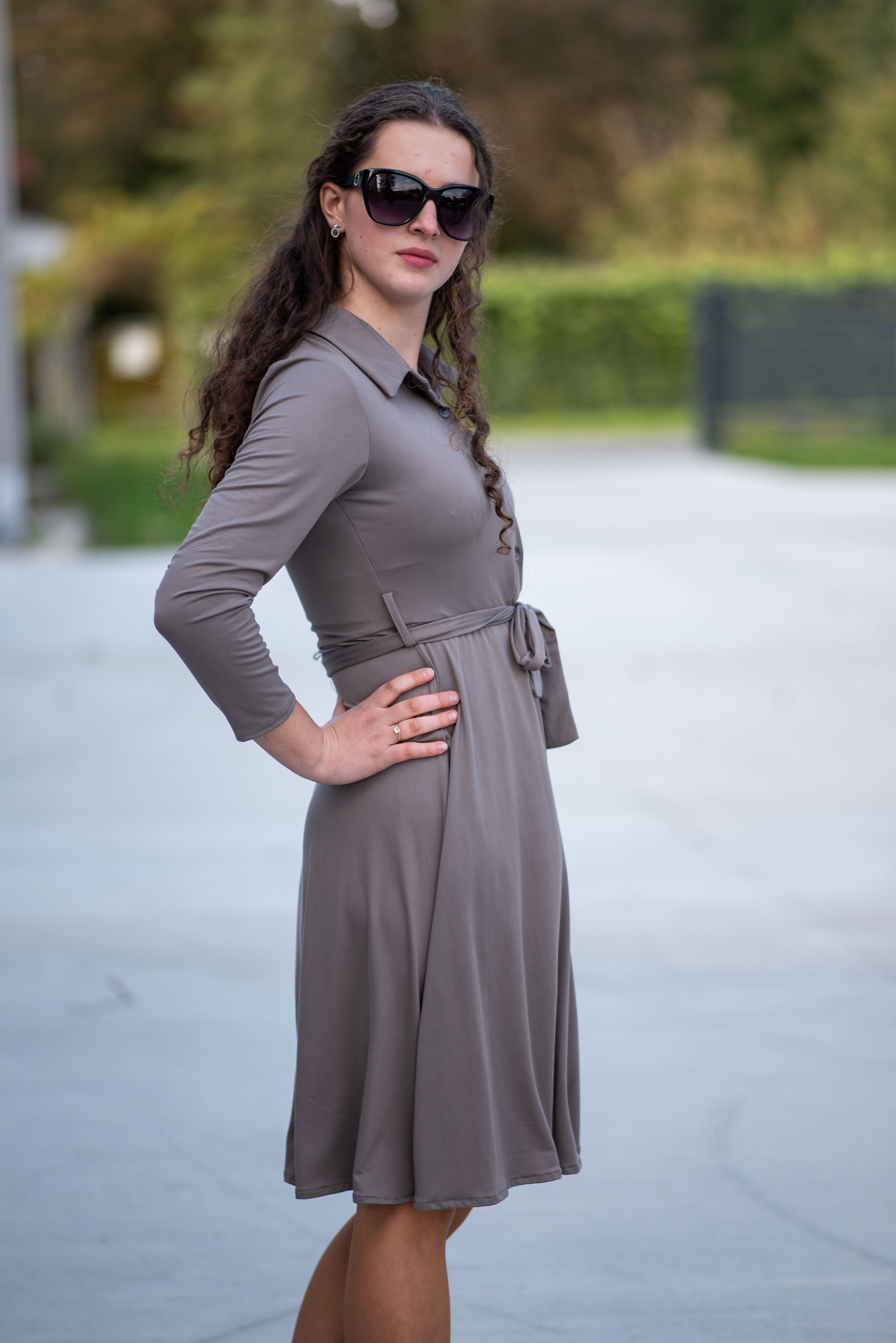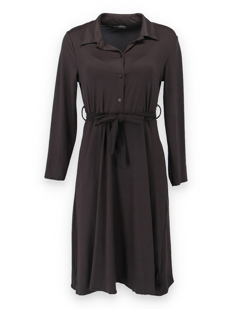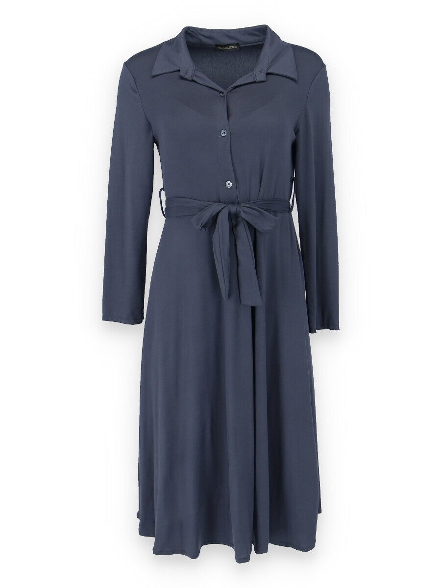 Košilové šaty střední délky, jsou doplněny páskem, propínání do pasu.