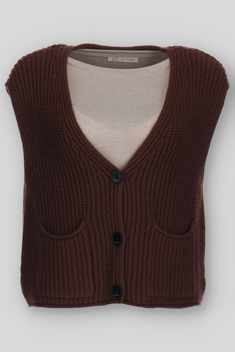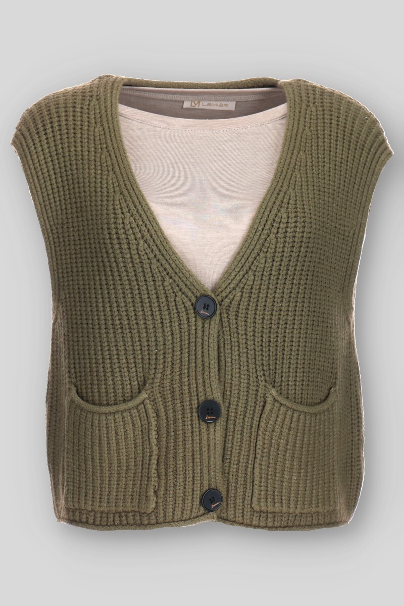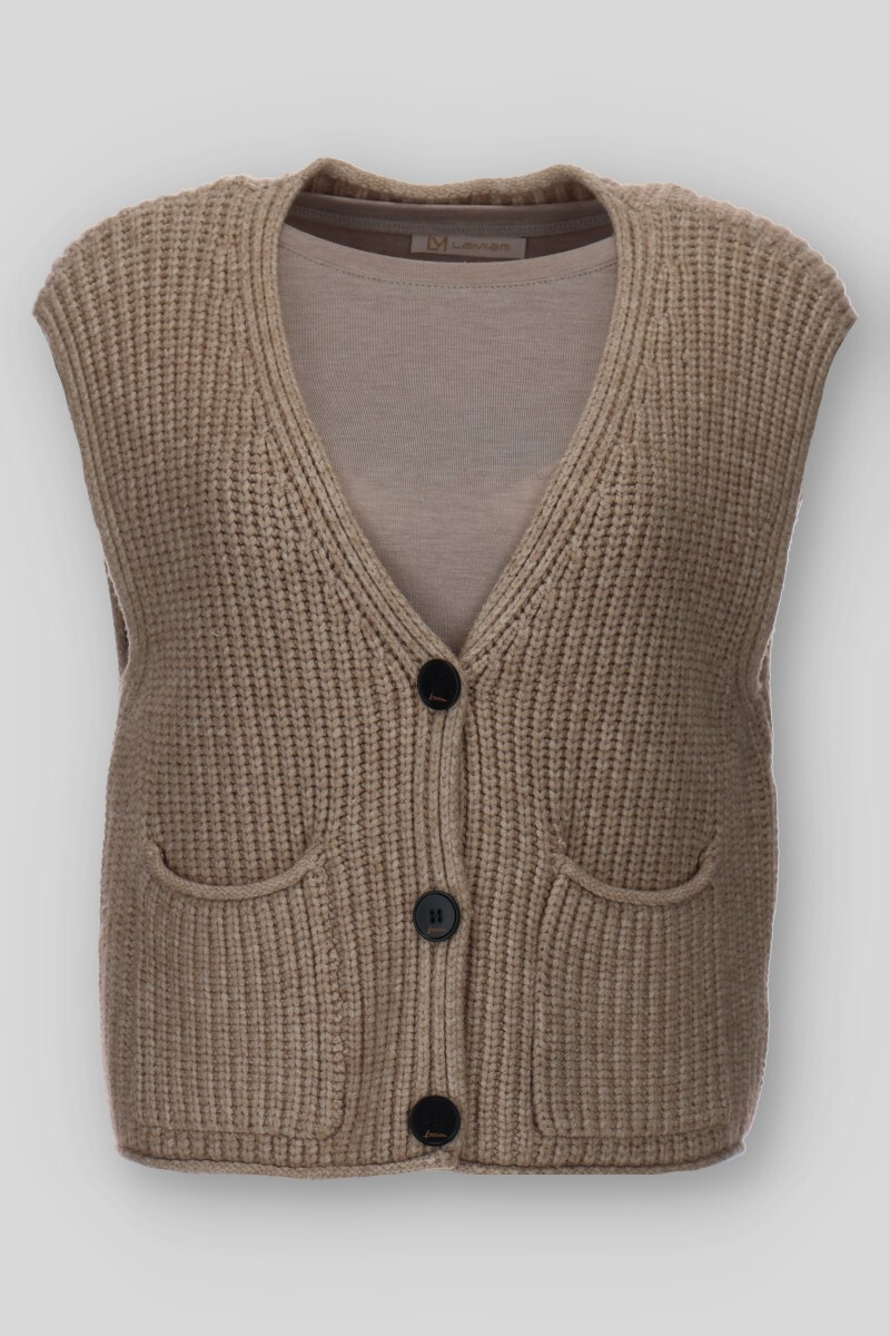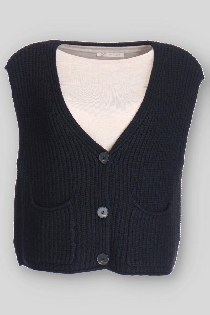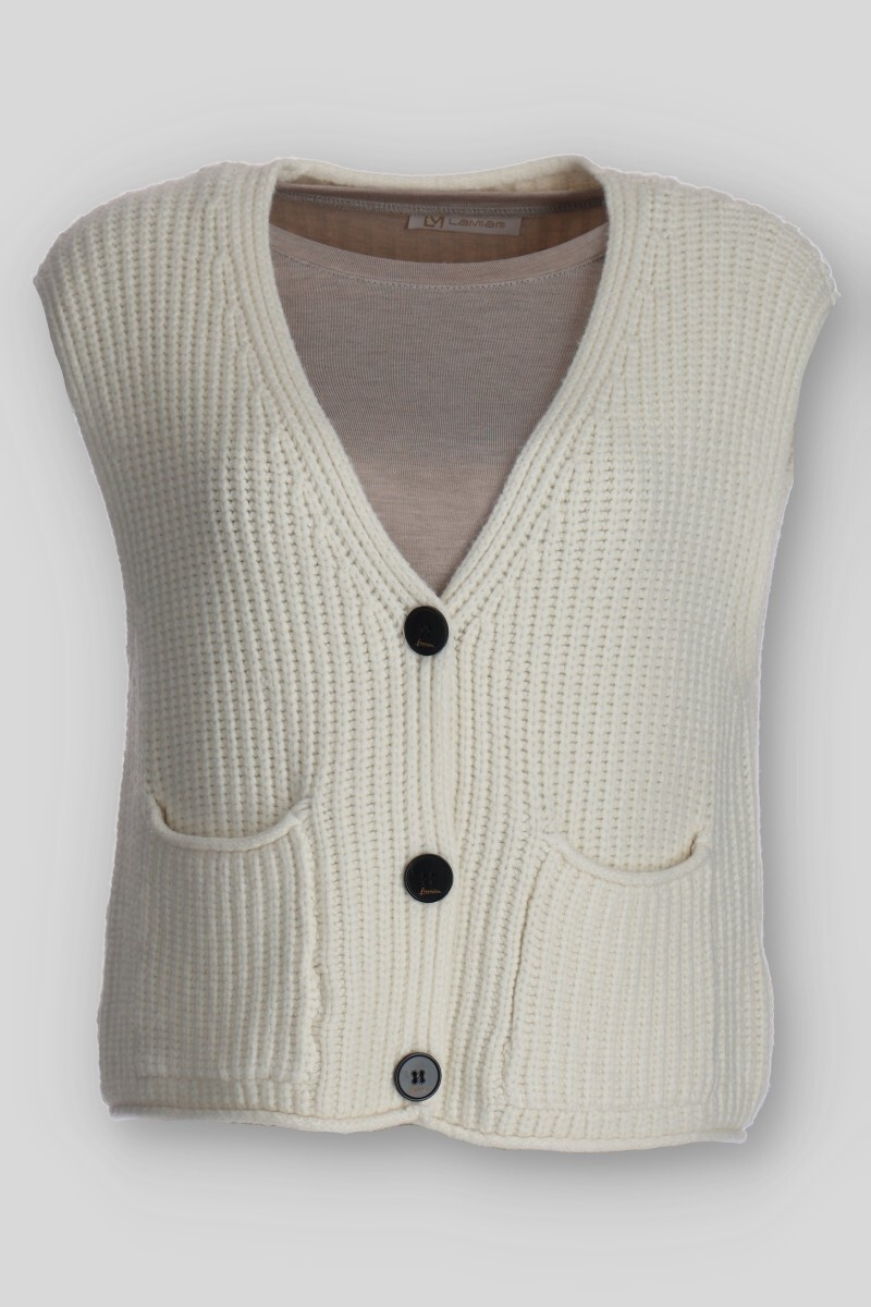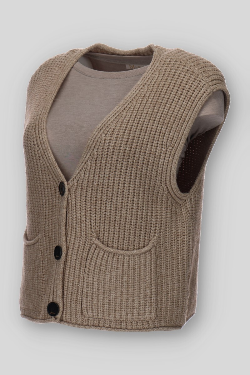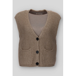 Krátká vesta z hrubého úpletu. Vesta má zapínání na knoflíky a na přední straně našité kapsy. Vyrobeno v Itálii