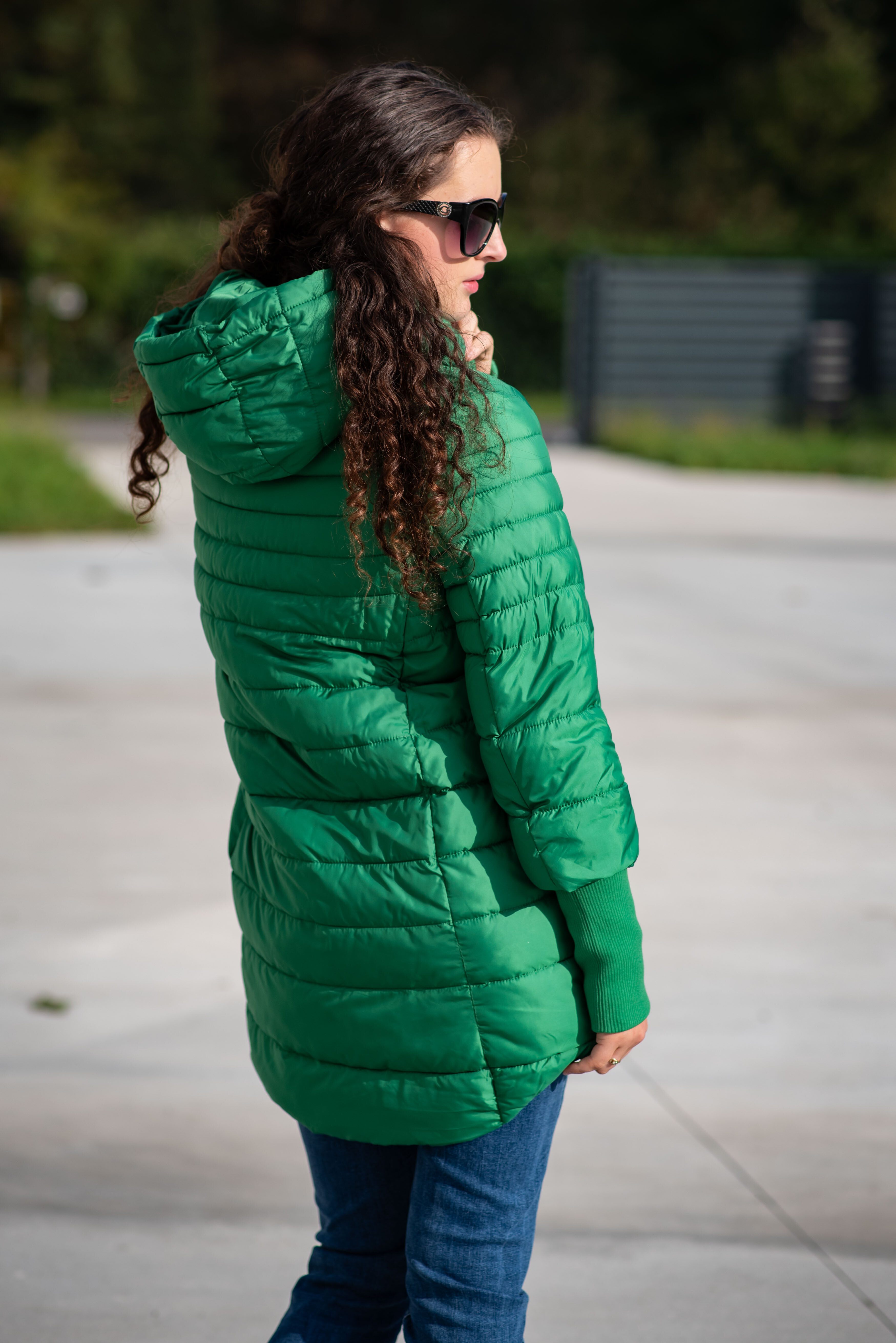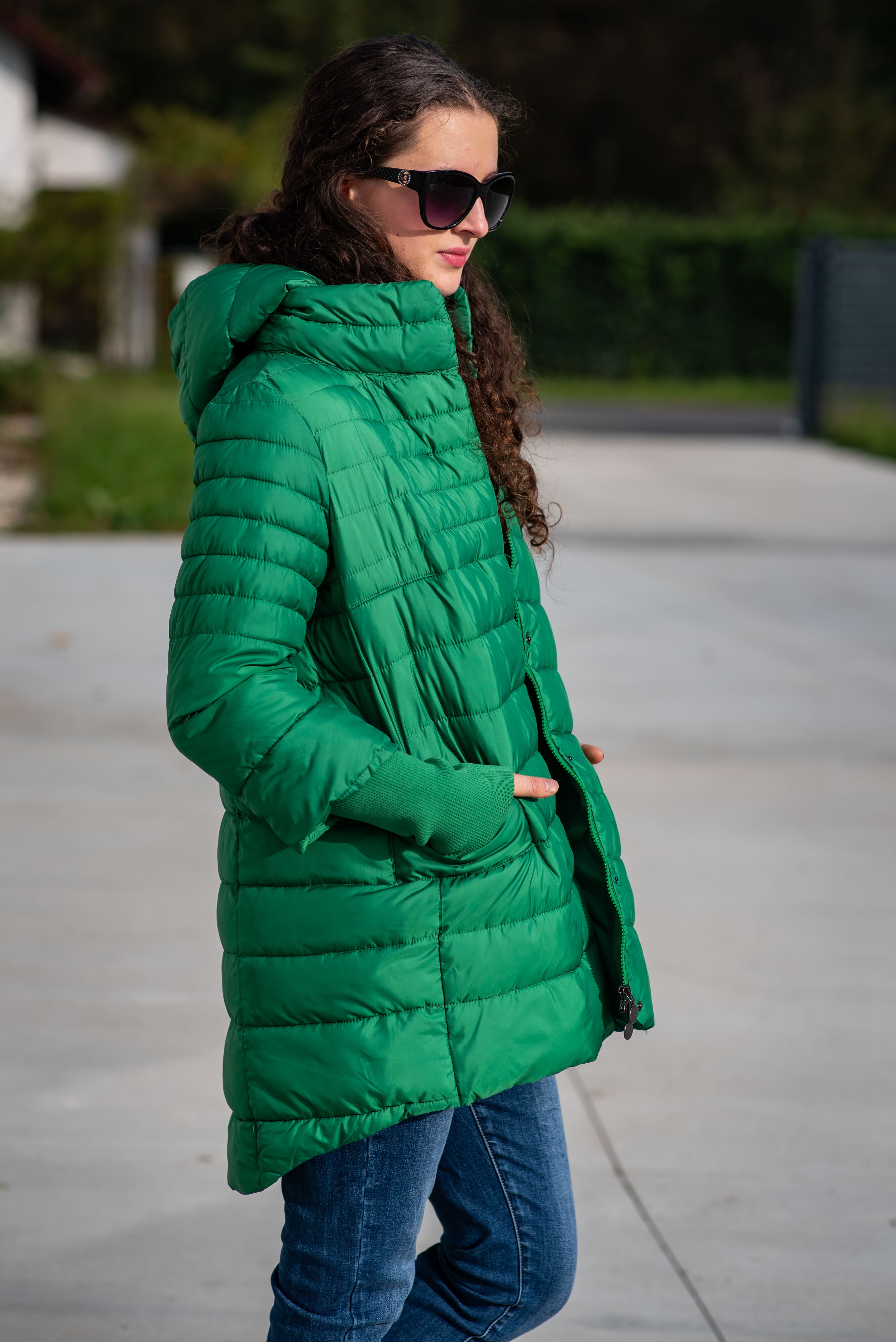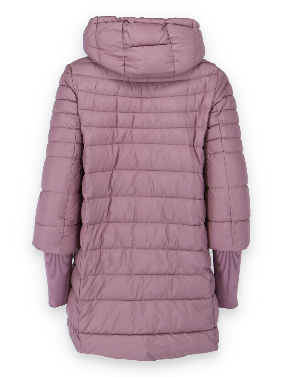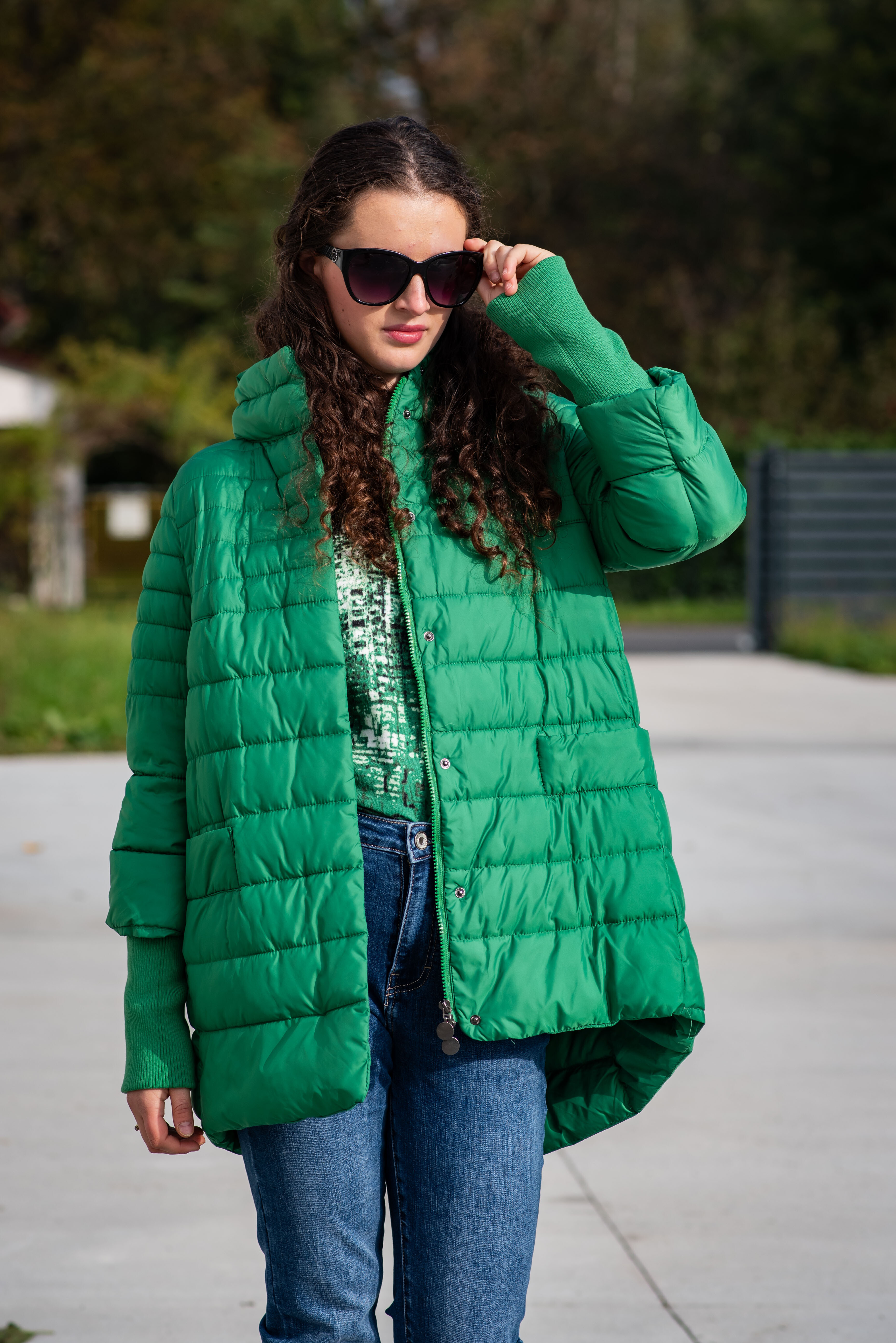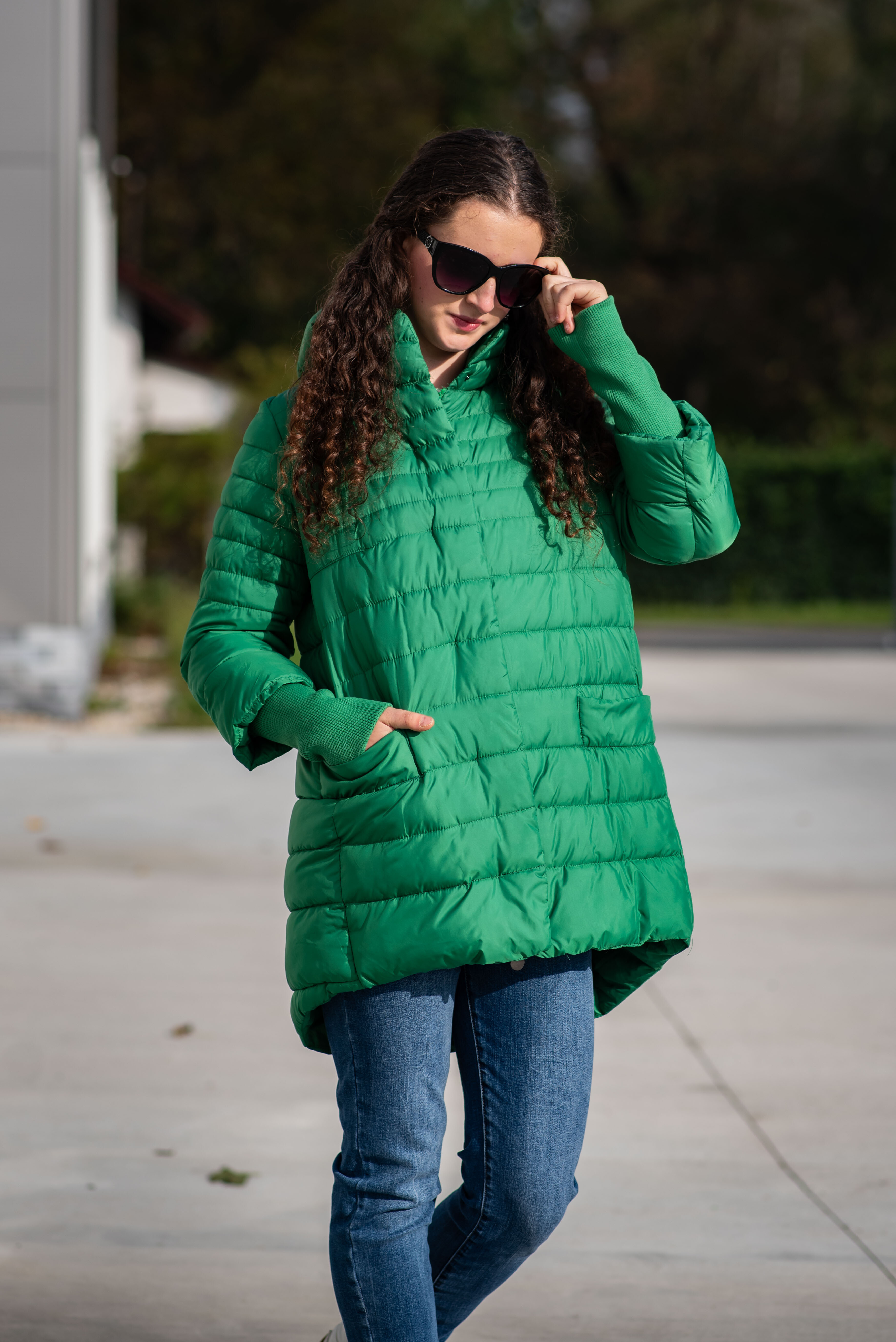 Krátká stylová bunda s kapucí, 3/4rukáv - zbývající délka doplněna úpletem.
