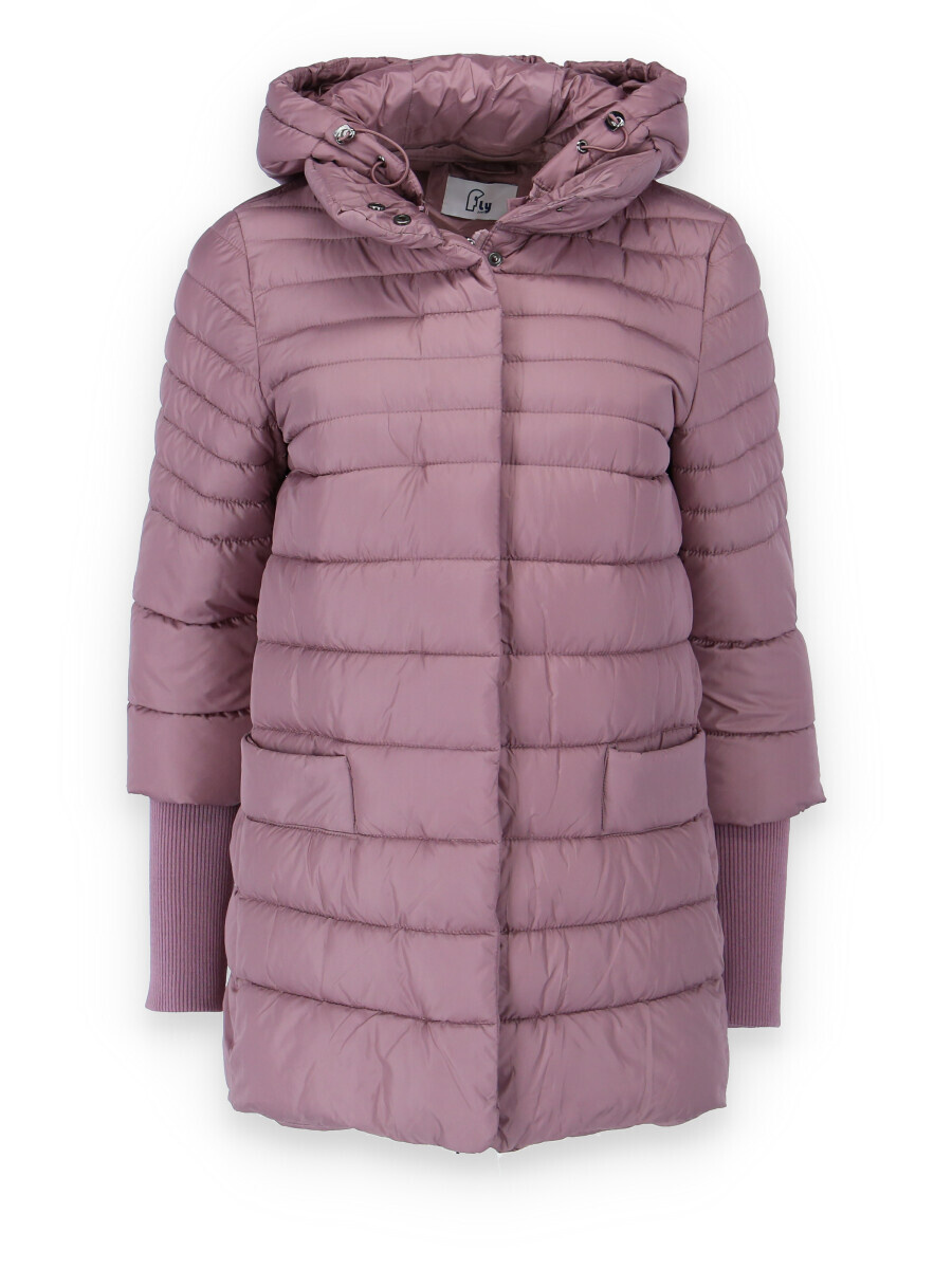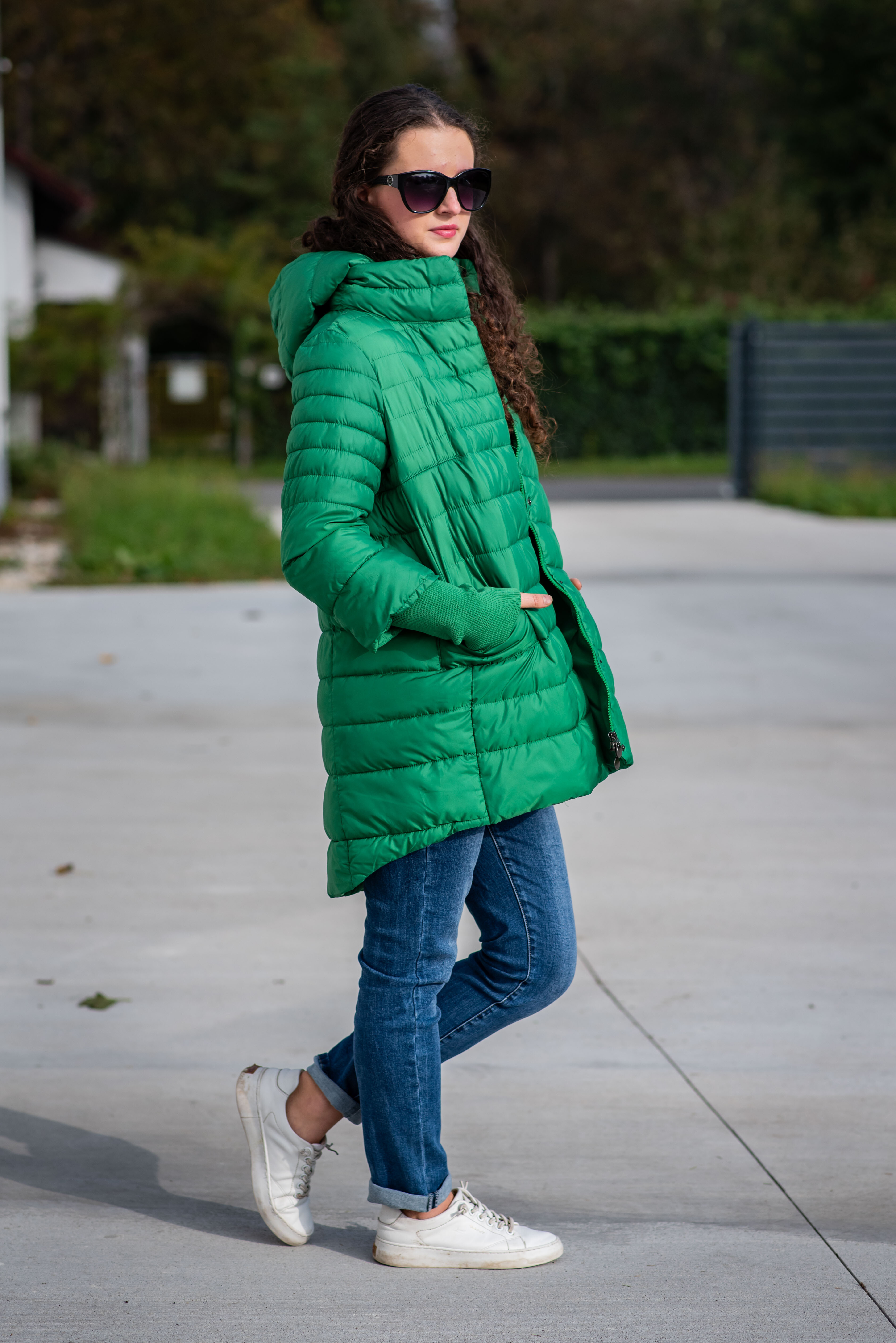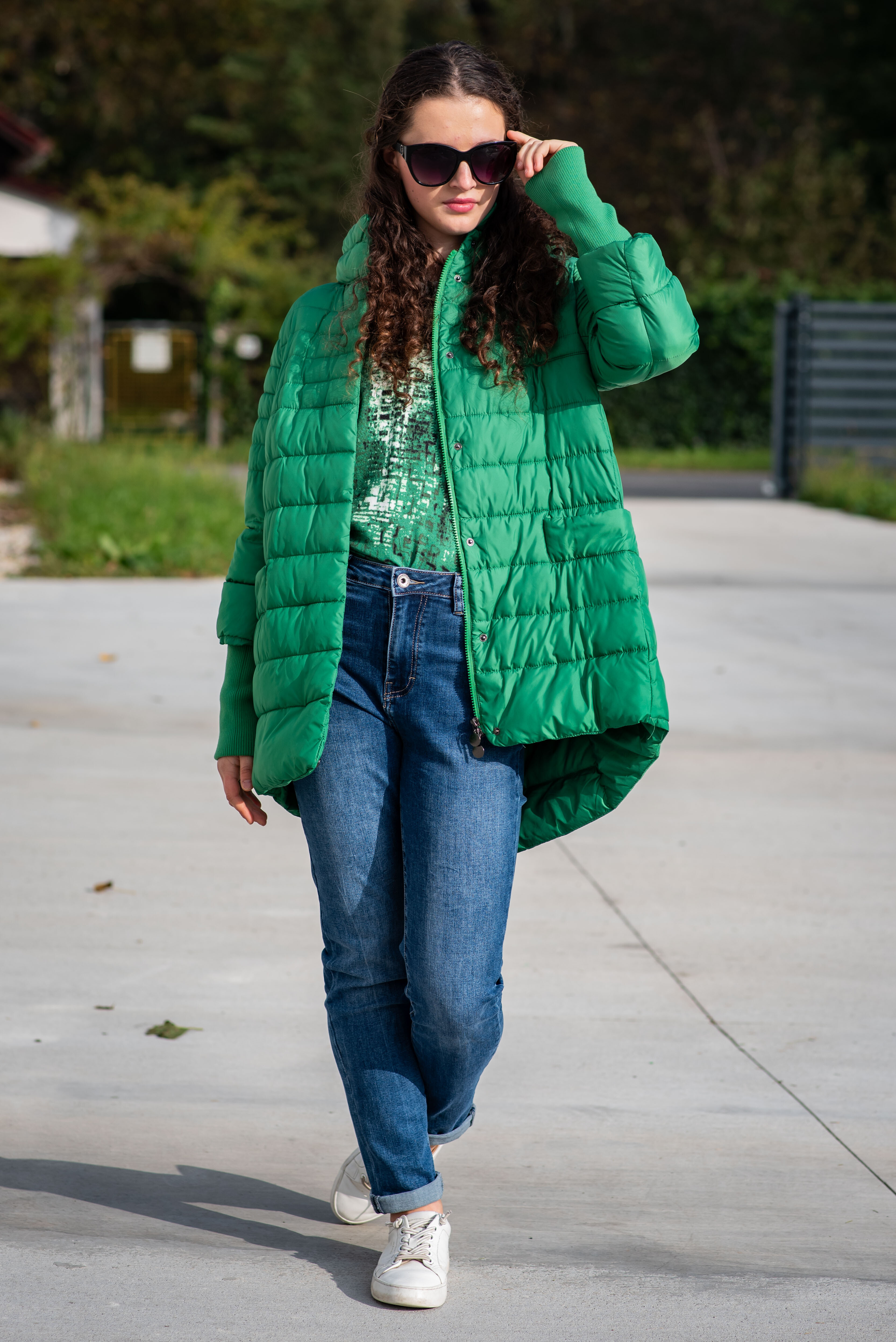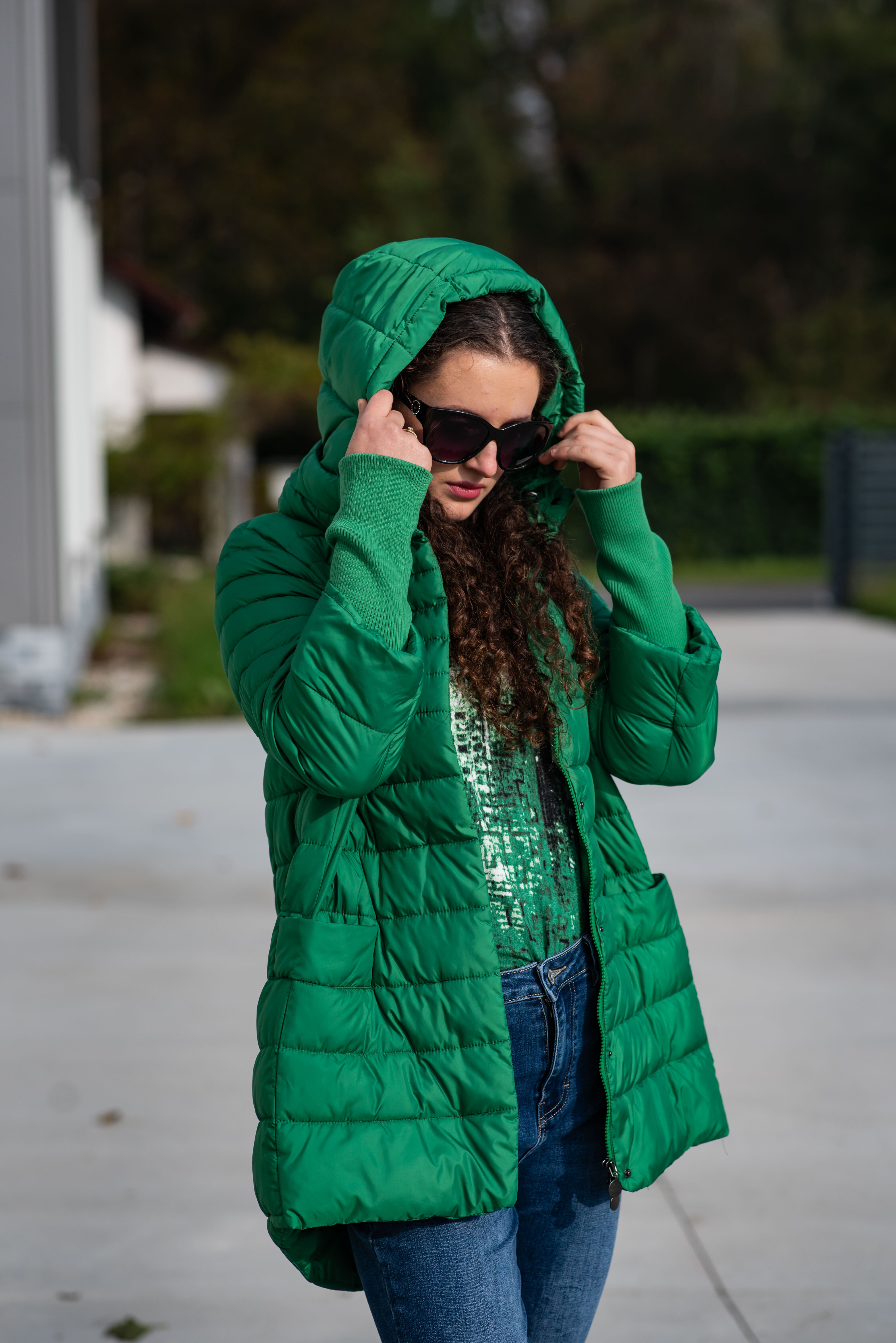Krátká stylová bunda s kapucí, 3/4rukáv - zbývající délka doplněna úpletem.