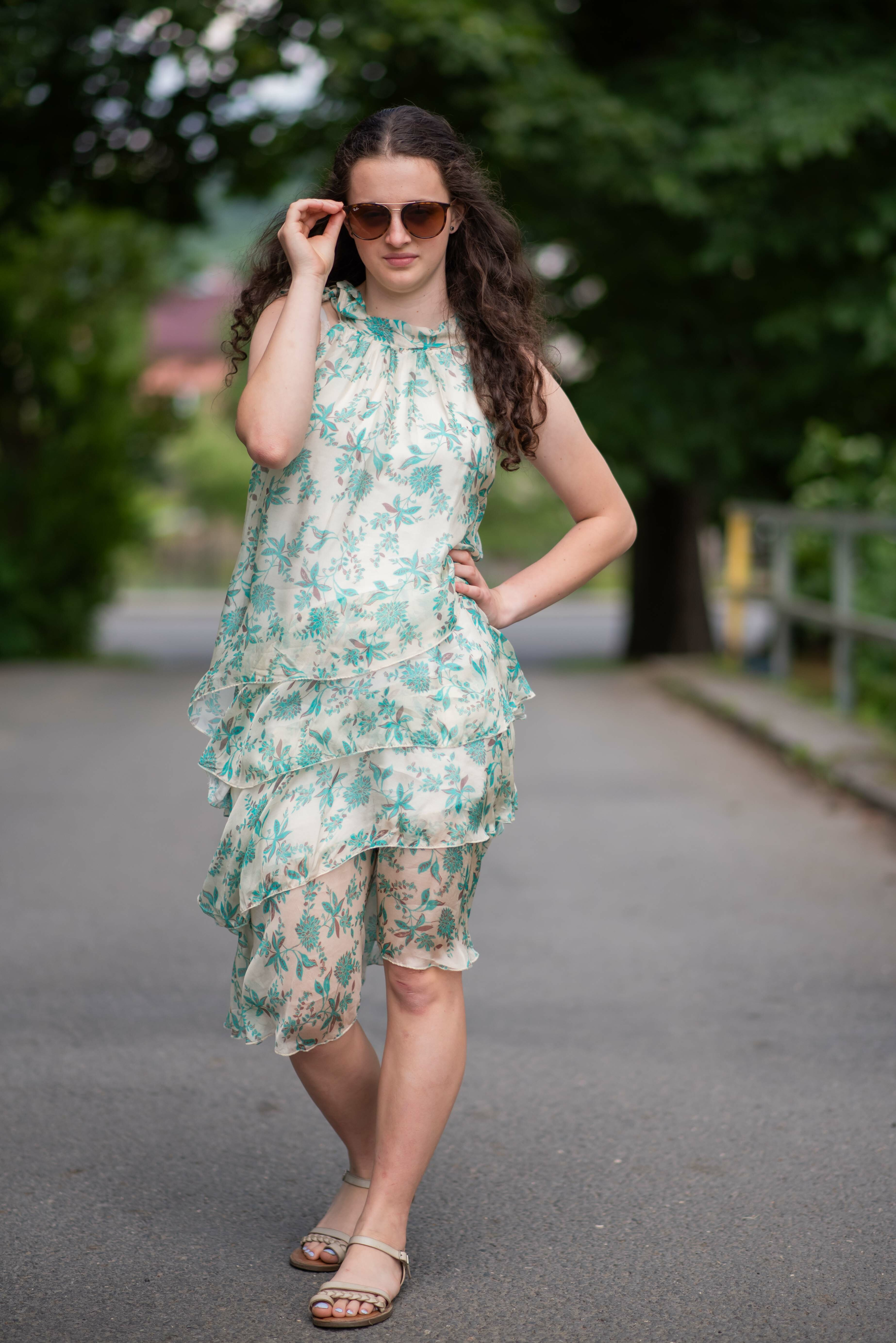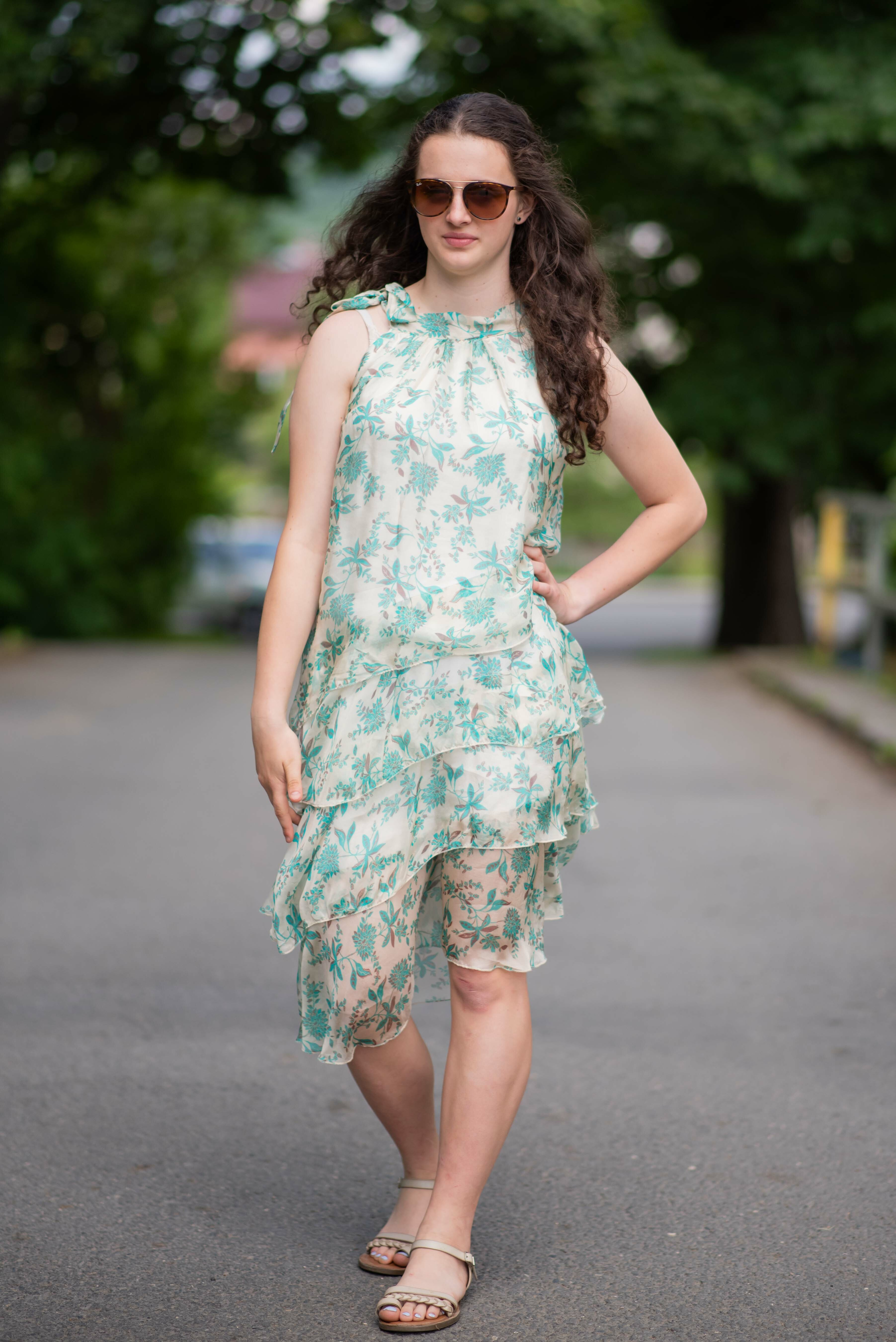 Módní hedvábné šaty volánového kaskádovitého střihu v midi délce. Šaty jsou bez rukávu se stojáčkem na uvázání kolem krku.