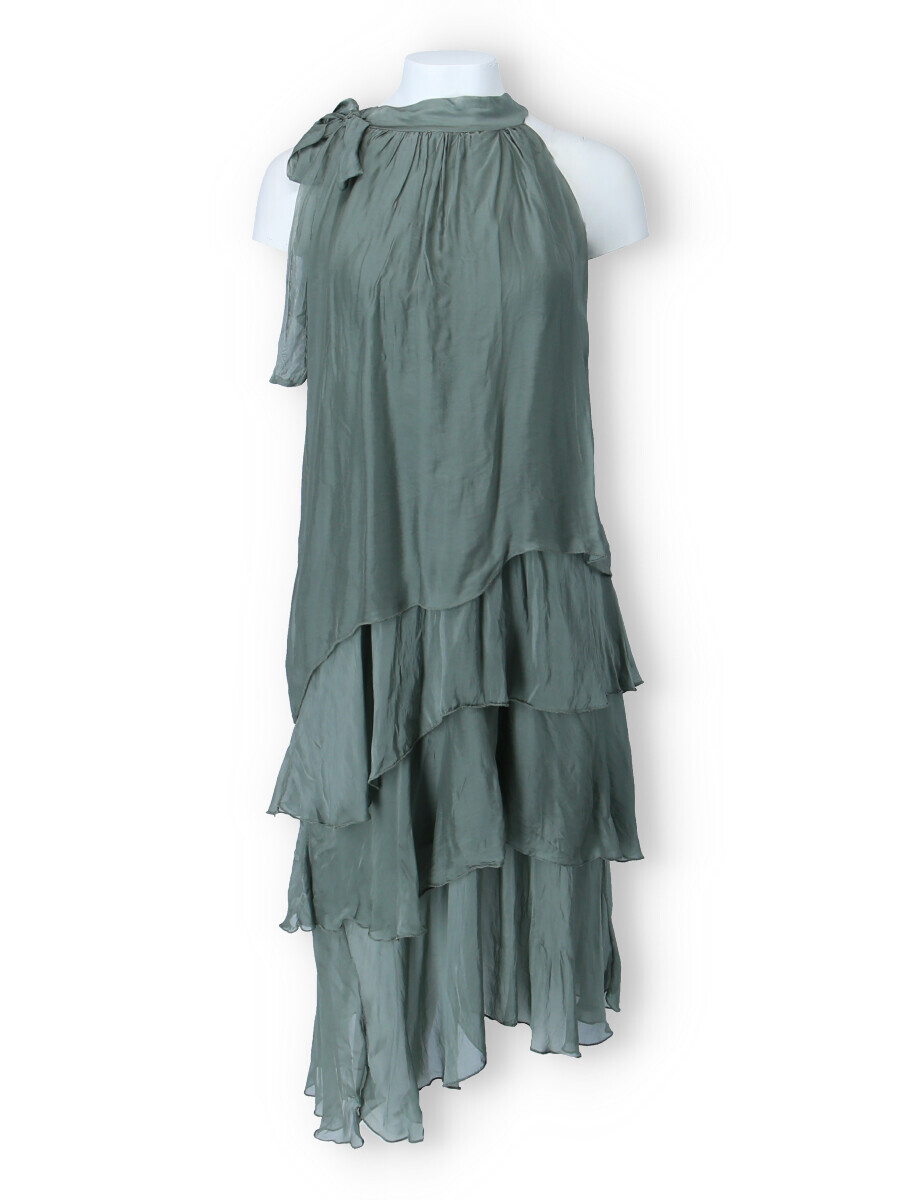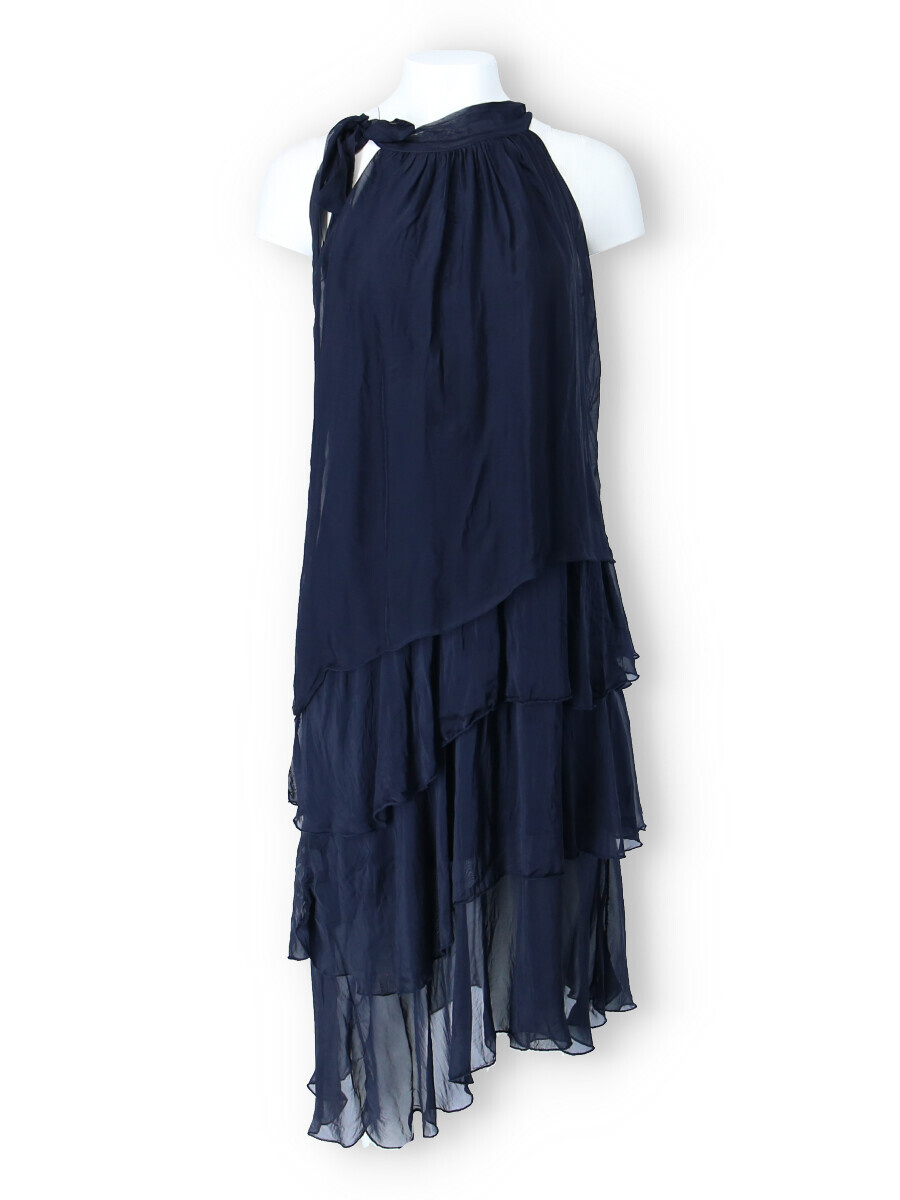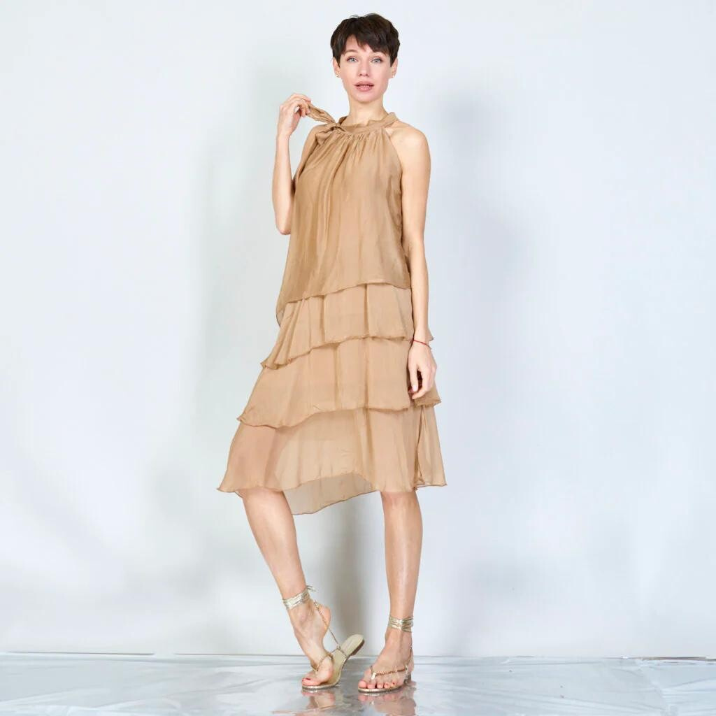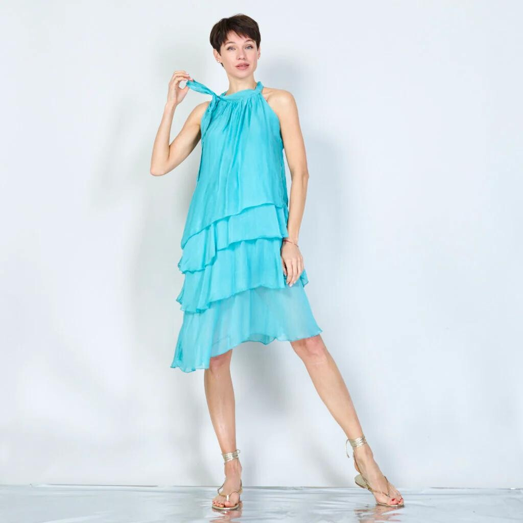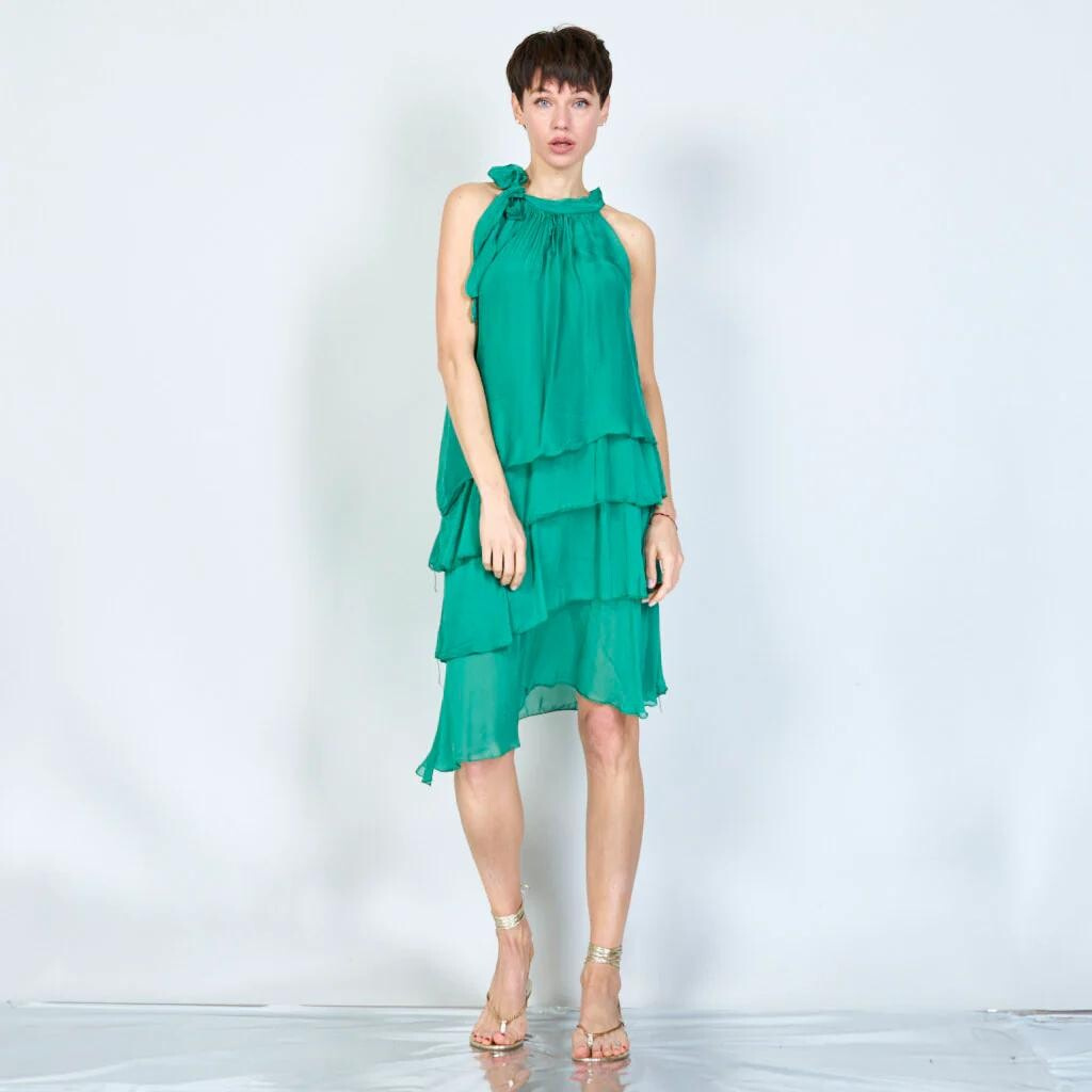 Módní hedvábné šaty volánového kaskádovitého střihu v midi délce. Šaty jsou bez rukávu se stojáčkem na uvázání kolem krku.