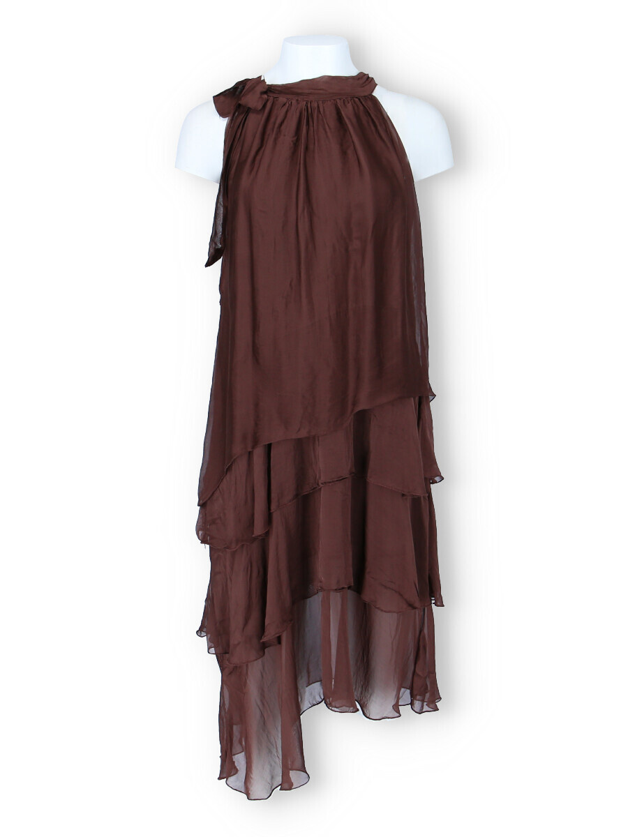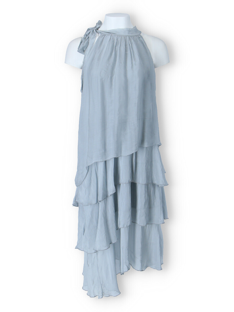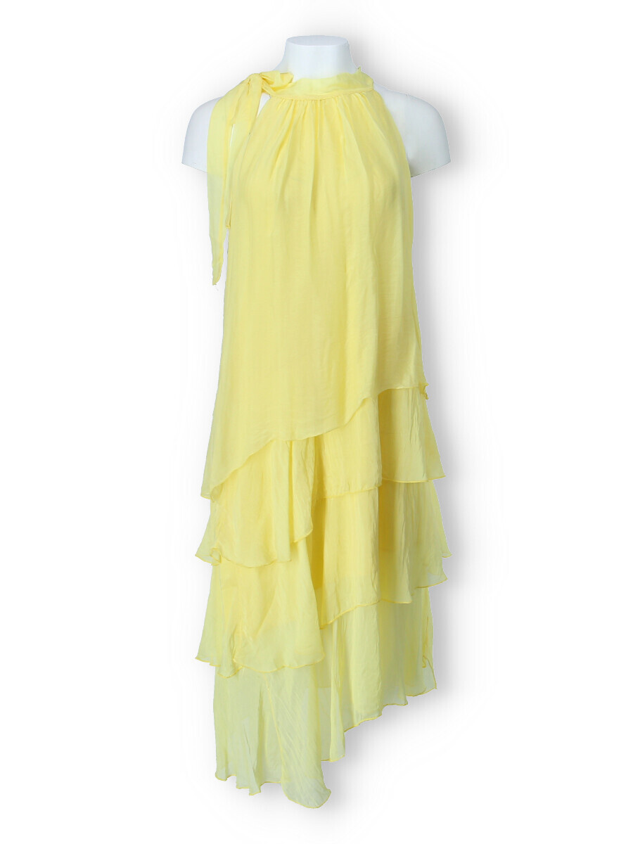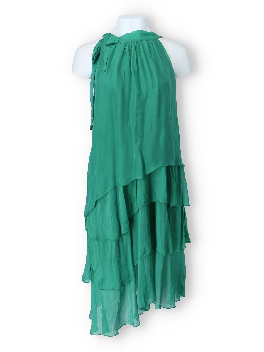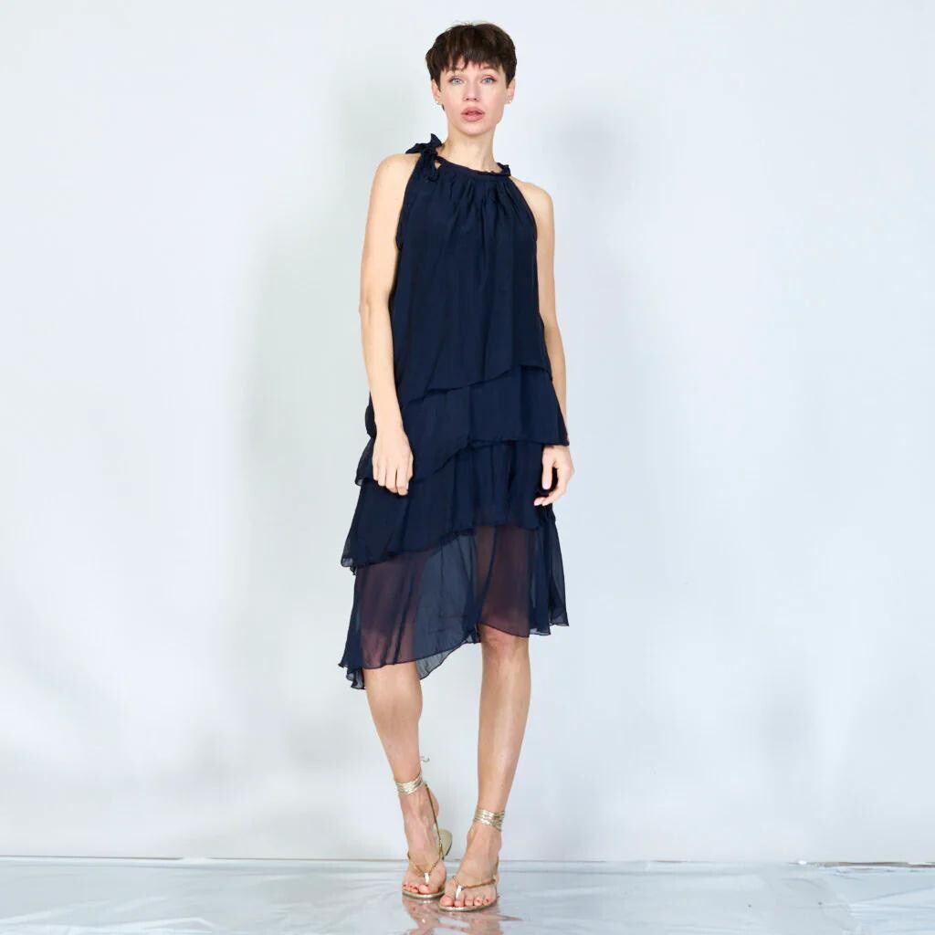 Módní hedvábné šaty volánového kaskádovitého střihu v midi délce. Šaty jsou bez rukávu se stojáčkem na uvázání kolem krku.