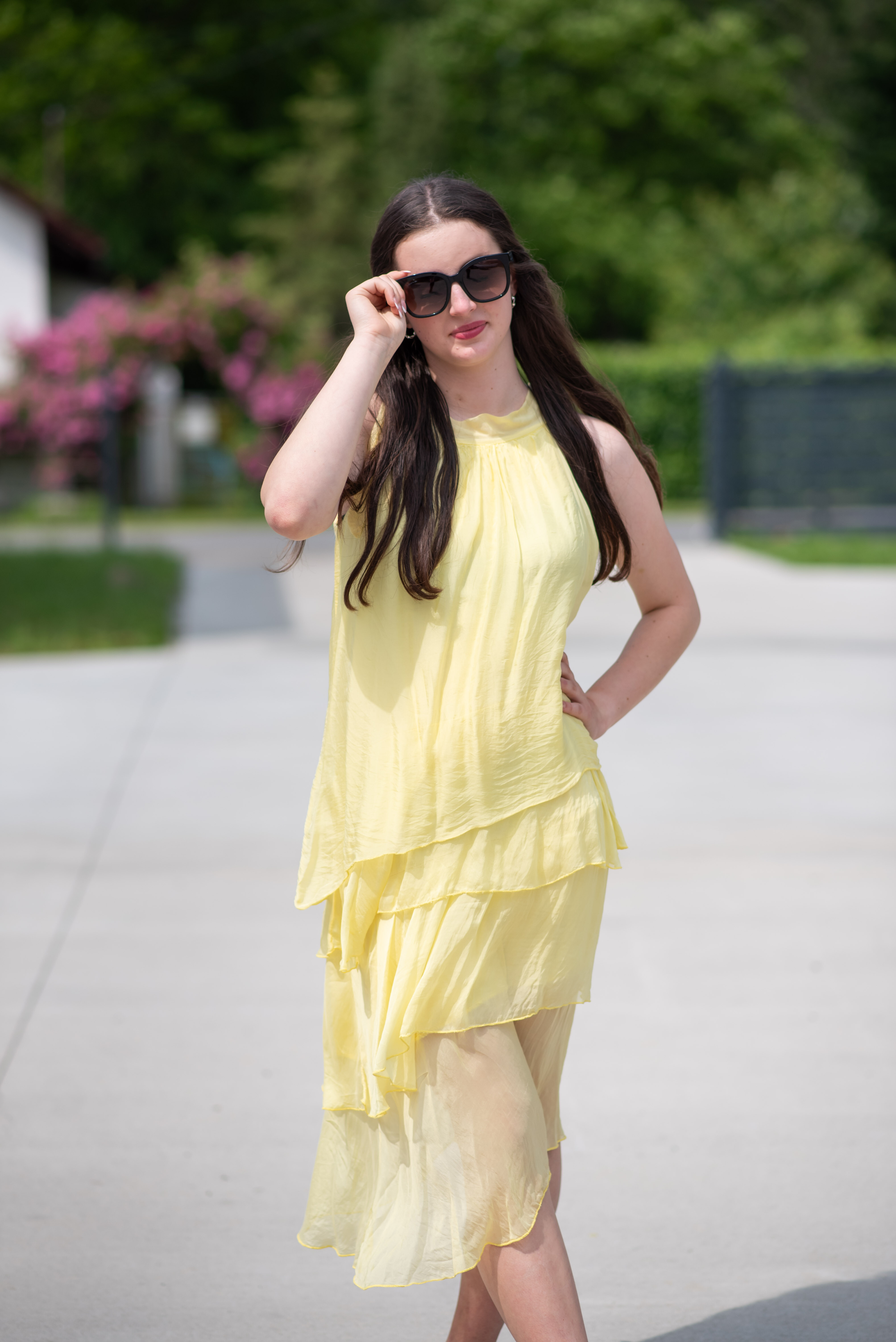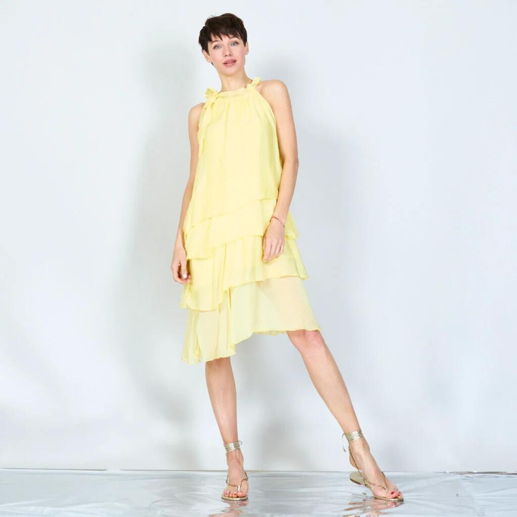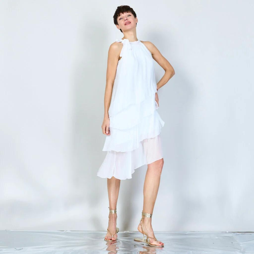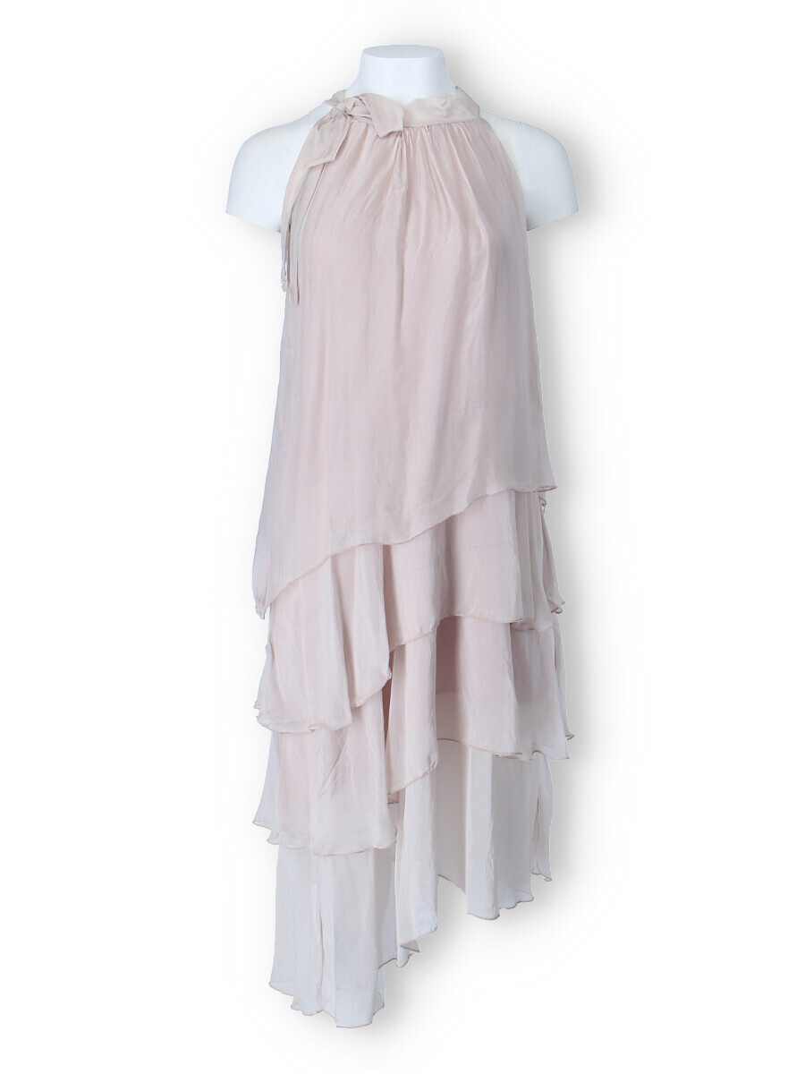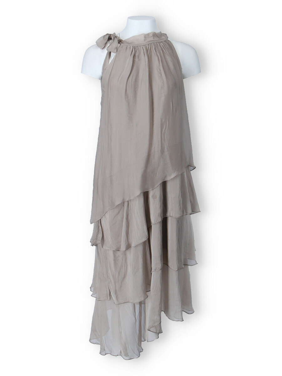 Módní hedvábné šaty volánového kaskádovitého střihu v midi délce. Šaty jsou bez rukávu se stojáčkem na uvázání kolem krku.
