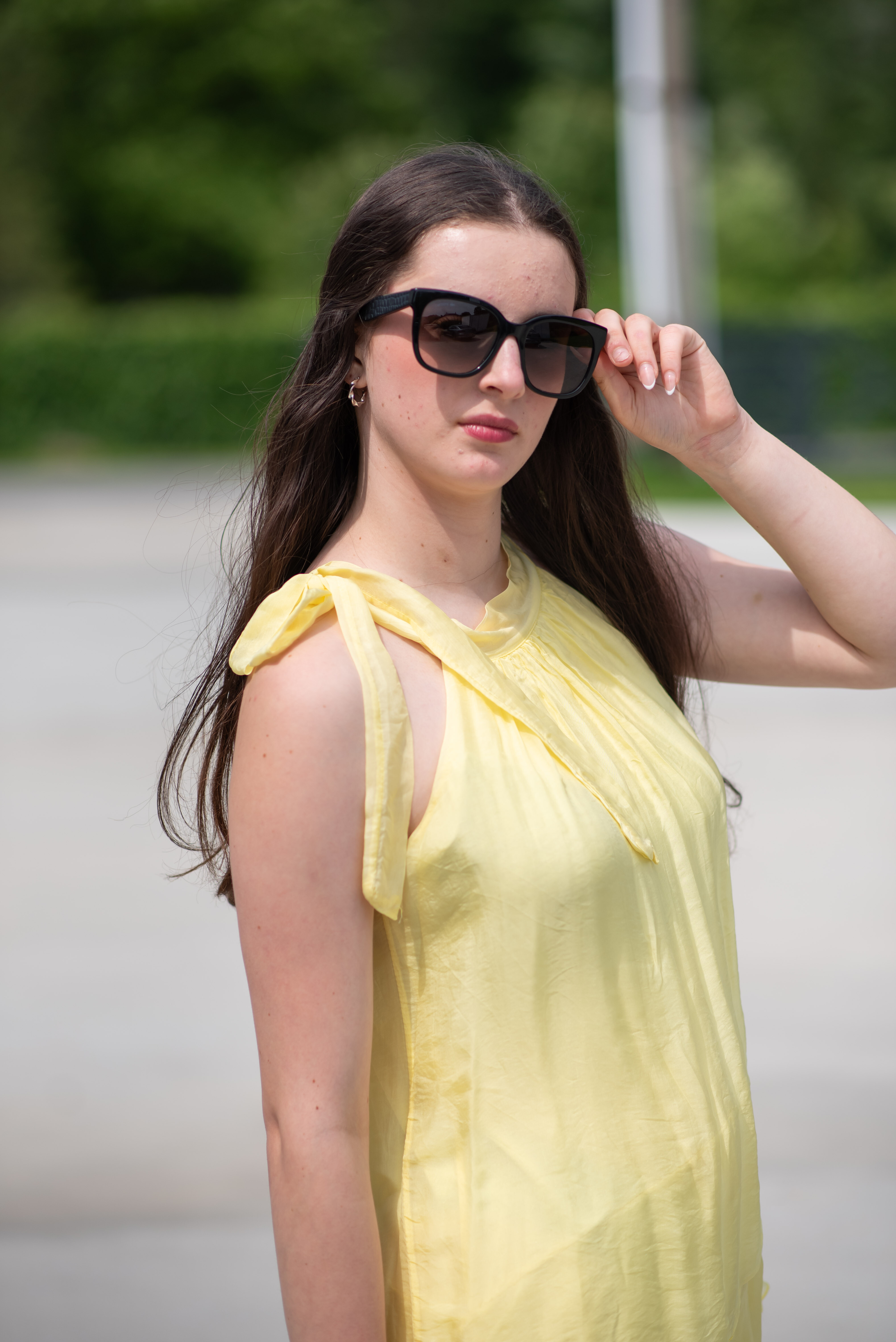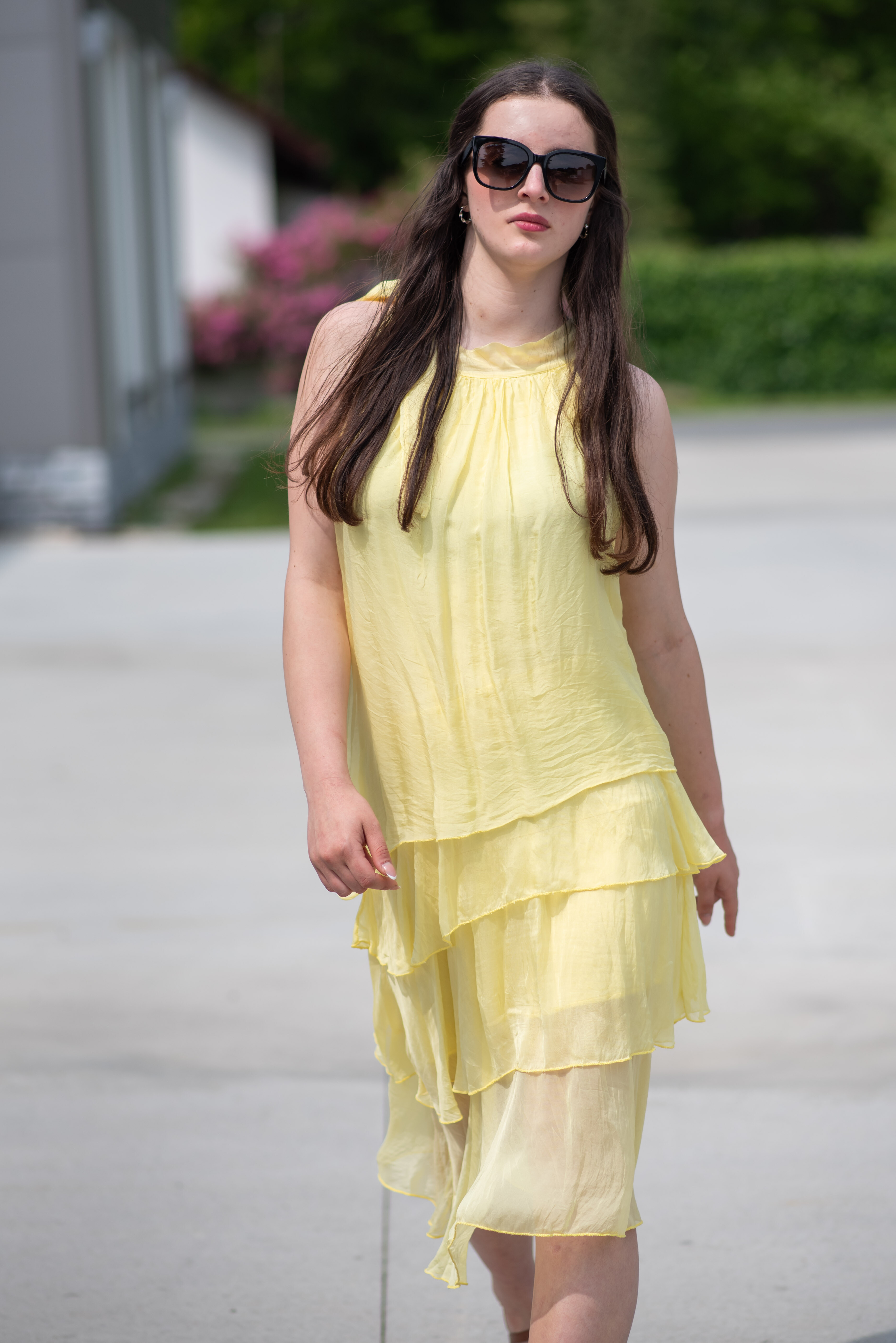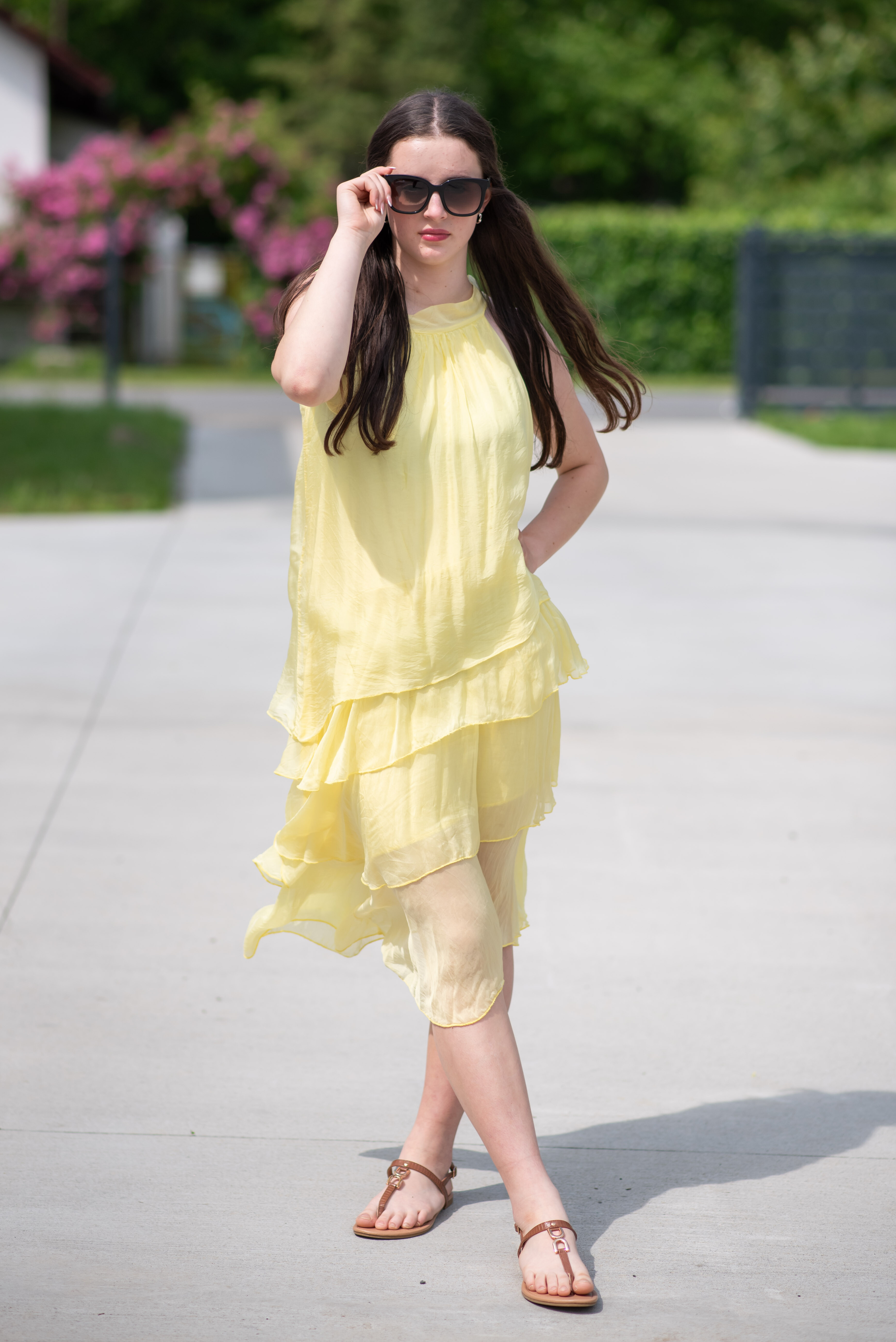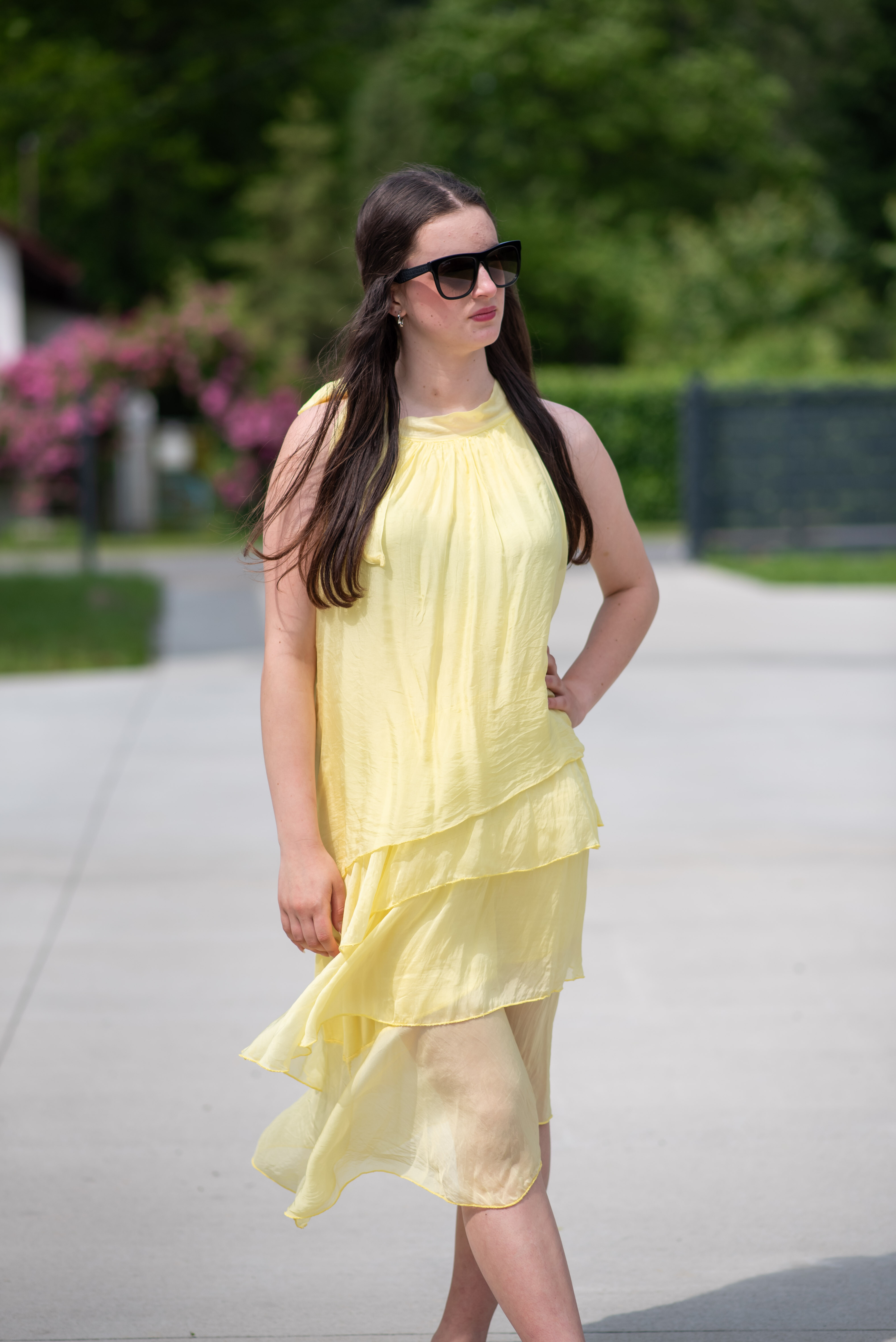 Módní hedvábné šaty volánového kaskádovitého střihu v midi délce. Šaty jsou bez rukávu se stojáčkem na uvázání kolem krku.