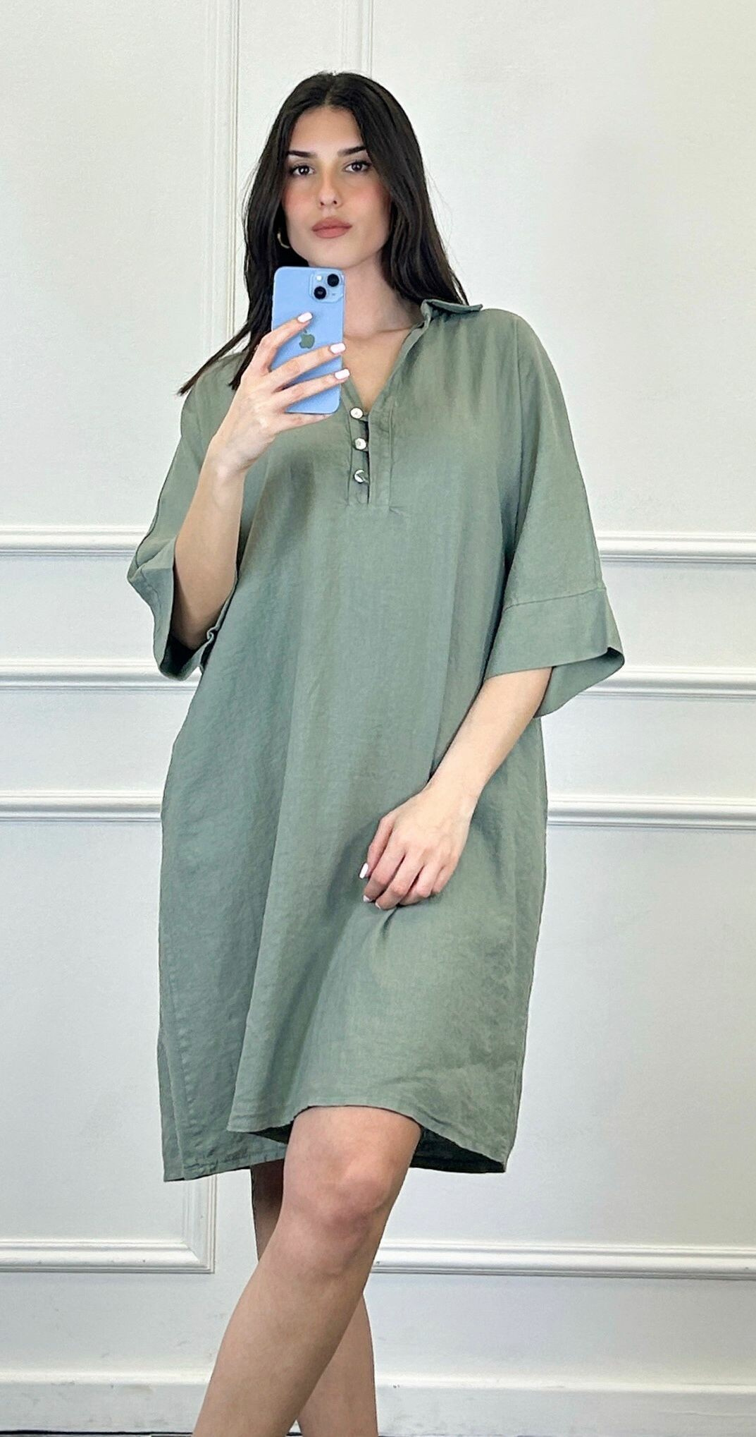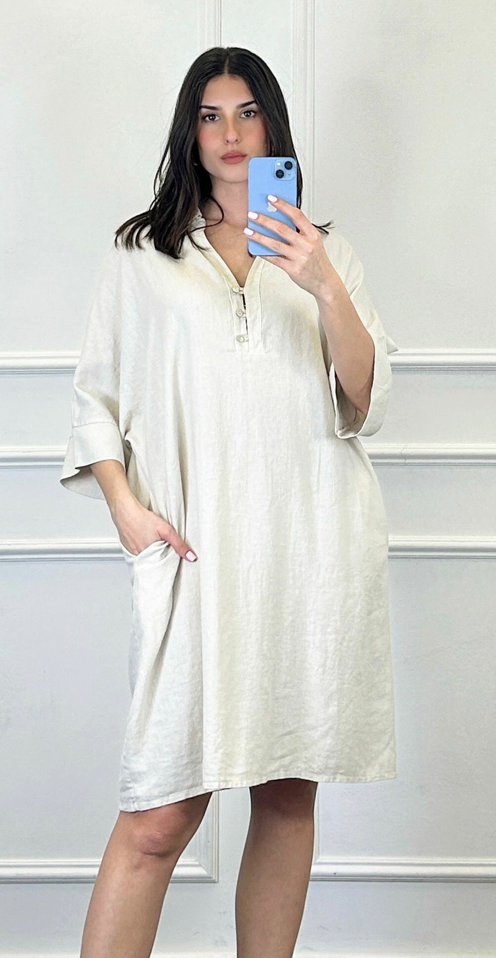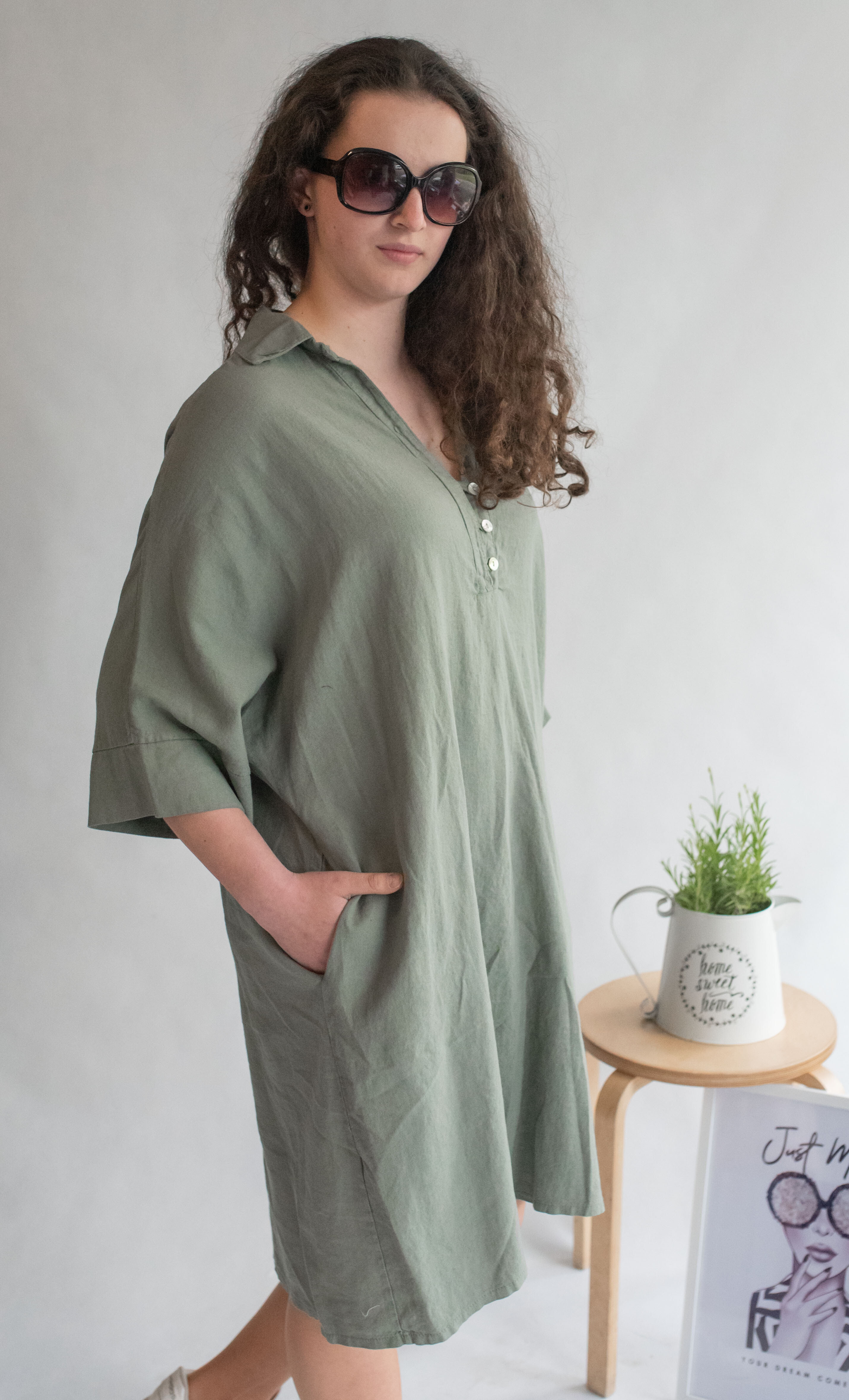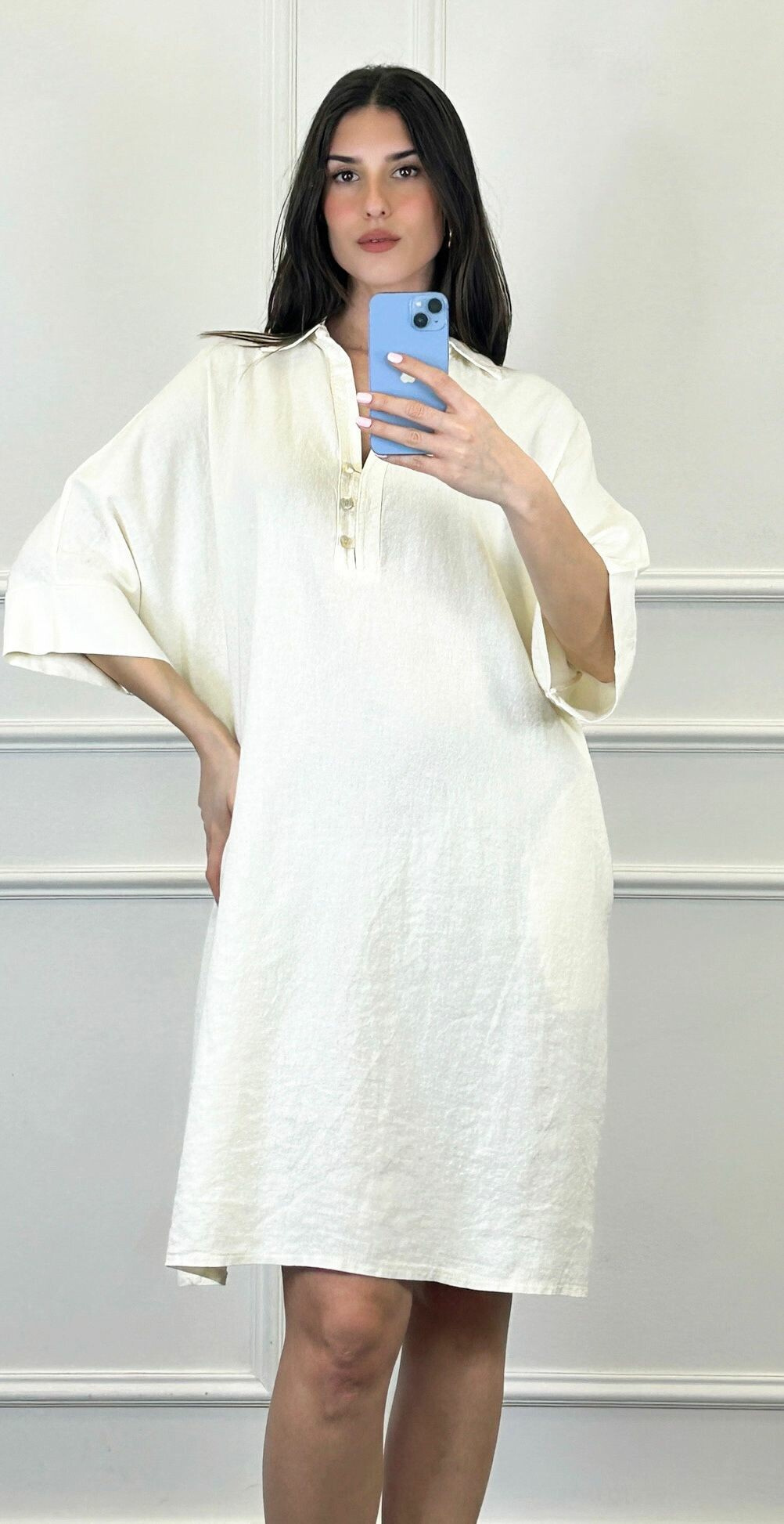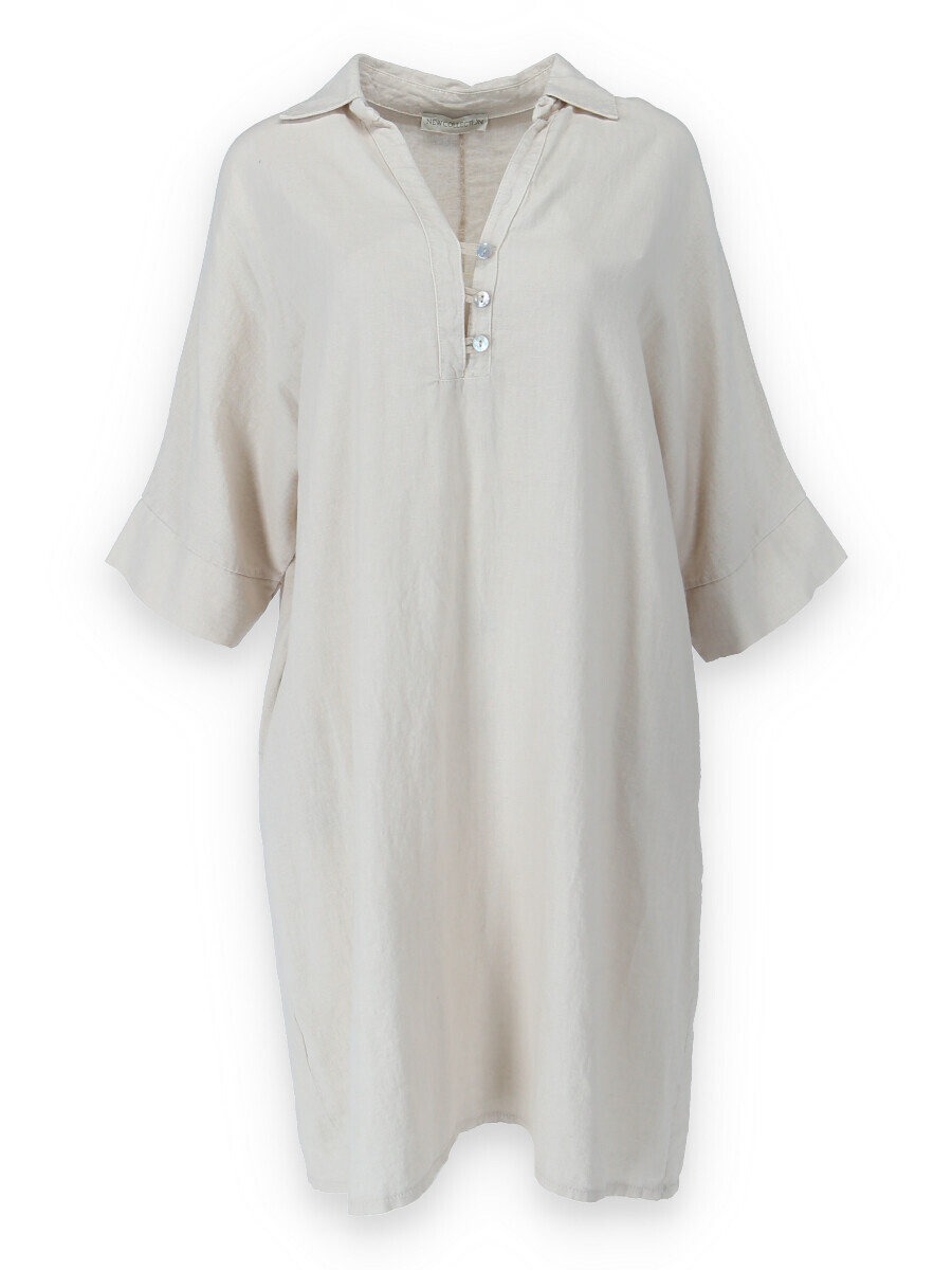 Lněná tunika střední délky a 3/4 rukávem. Tunika/šatovka je doplněna knoflíky ve vrchní části a límečkem, šatovka je volnějšího oversize stříhu.