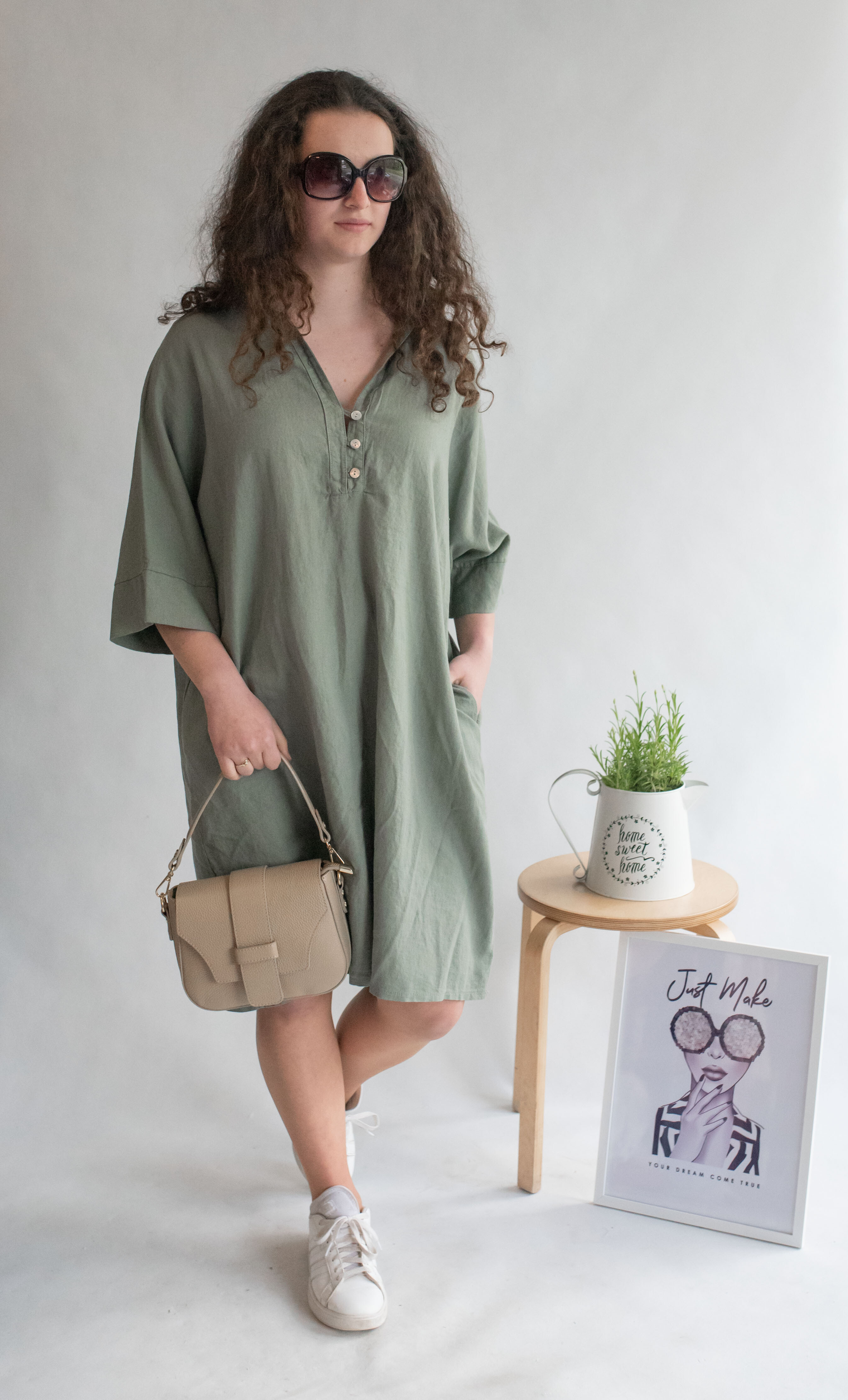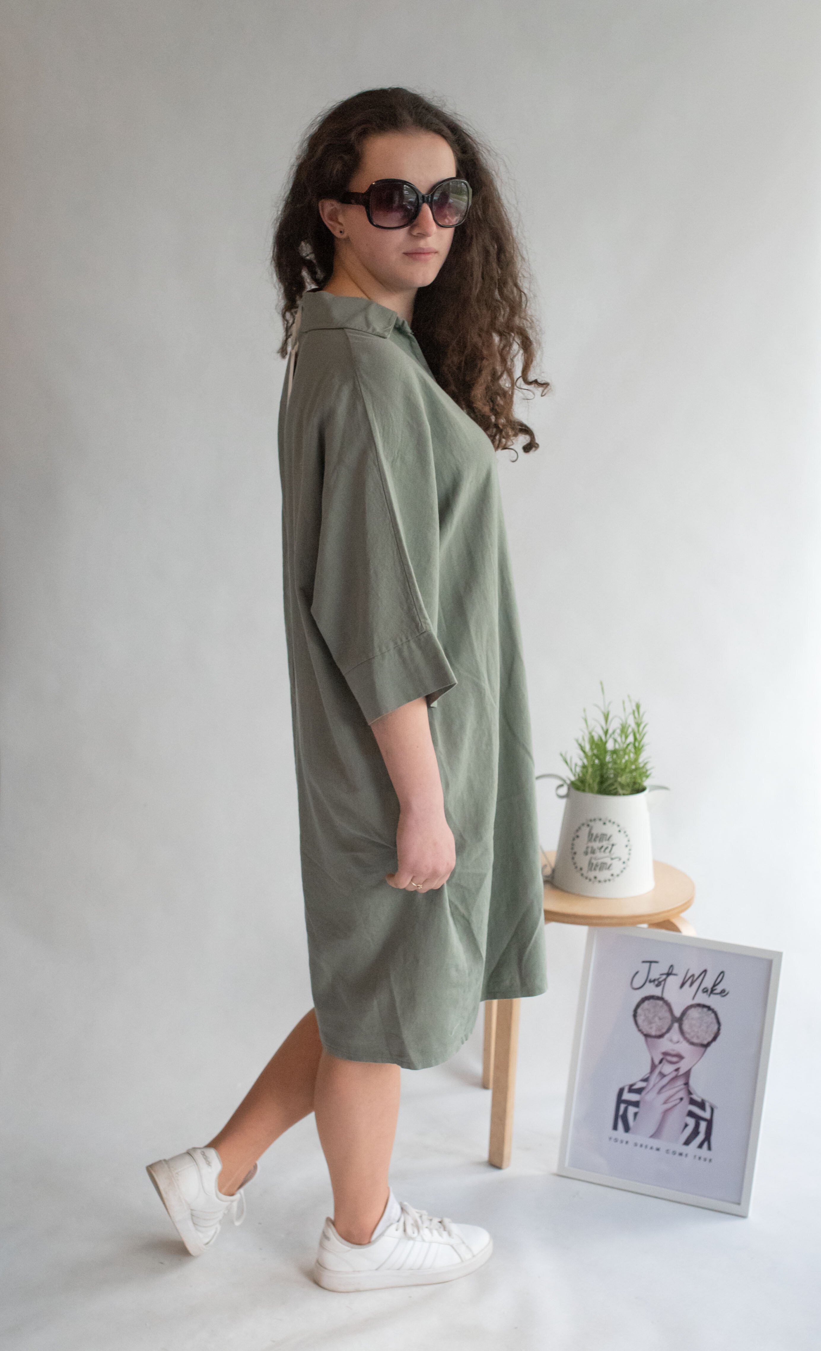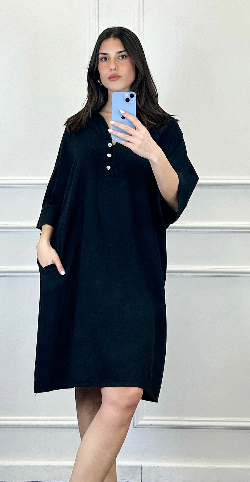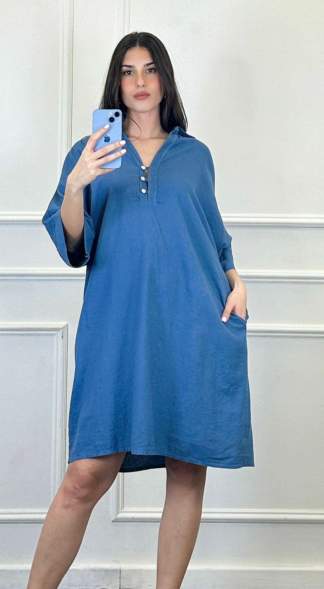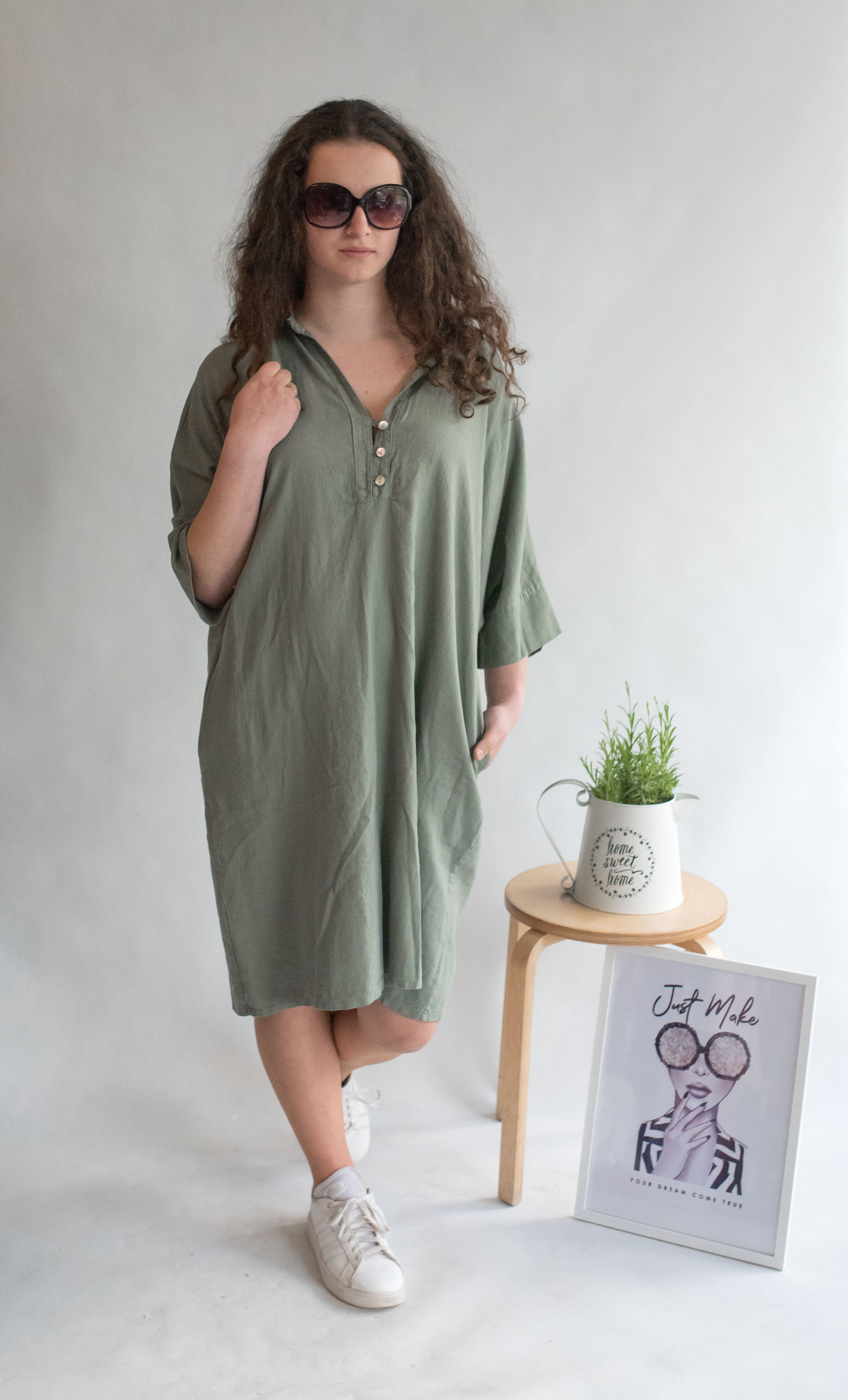 Lněná tunika střední délky a 3/4 rukávem. Tunika/šatovka je doplněna knoflíky ve vrchní části a límečkem, šatovka je volnějšího oversize stříhu.