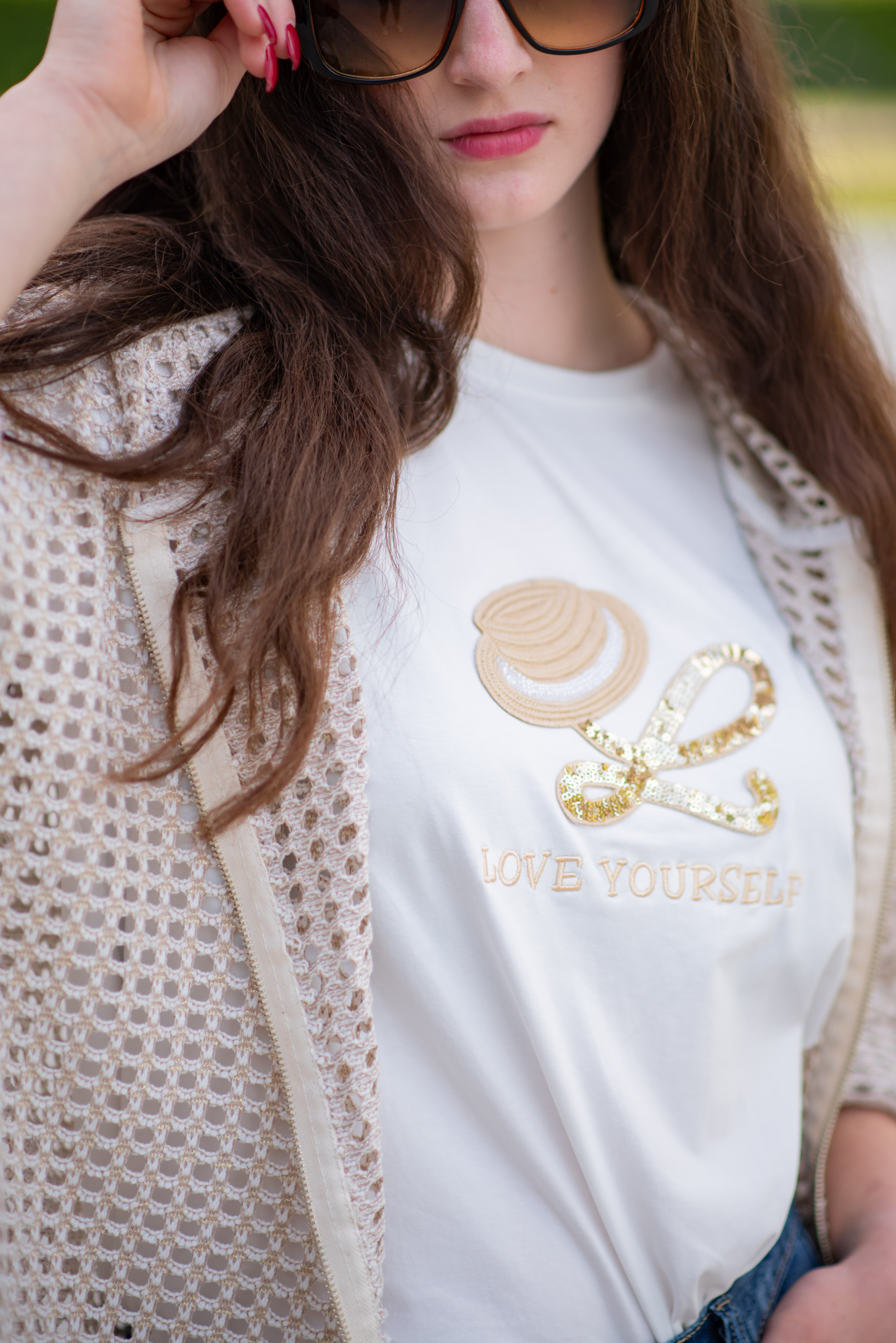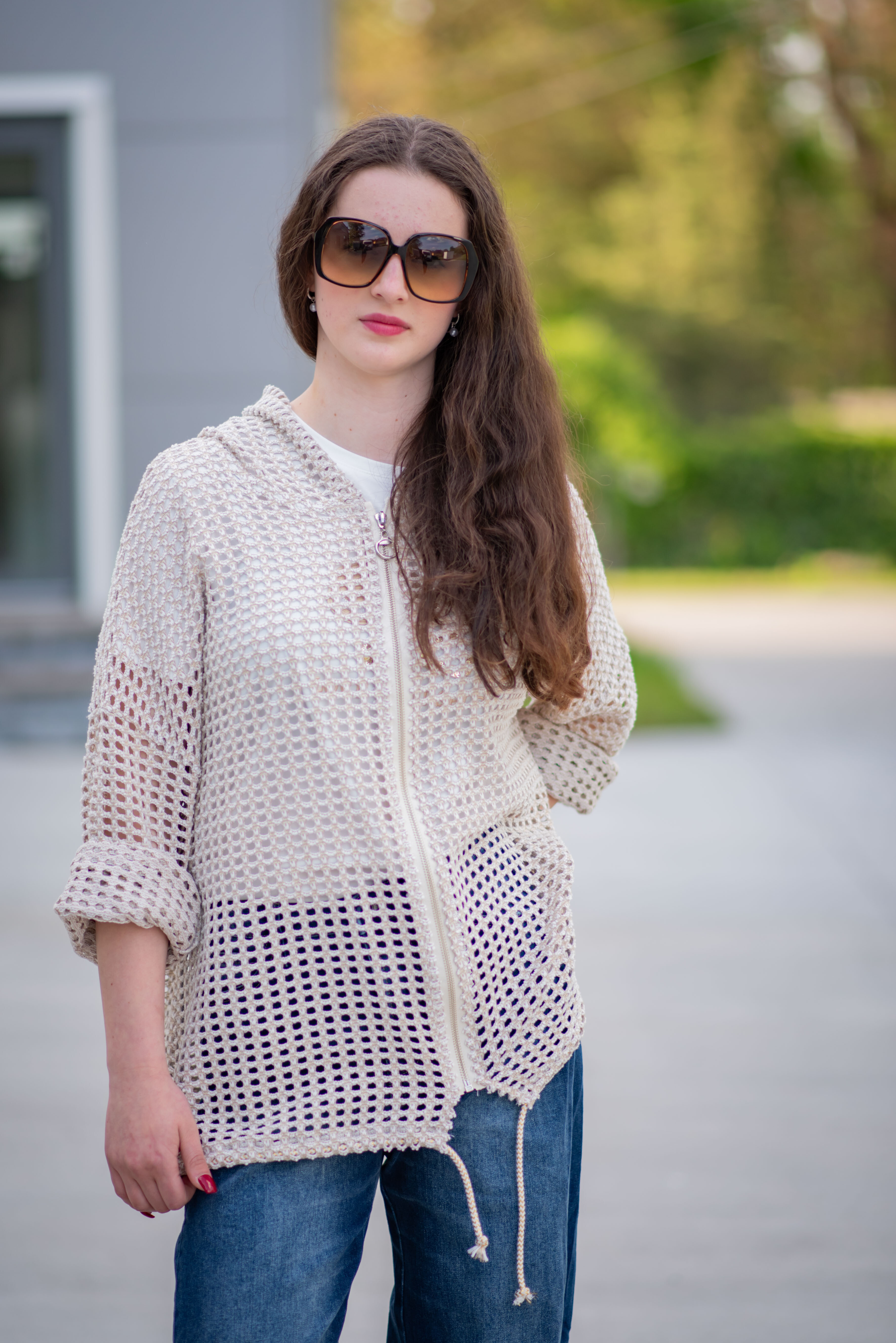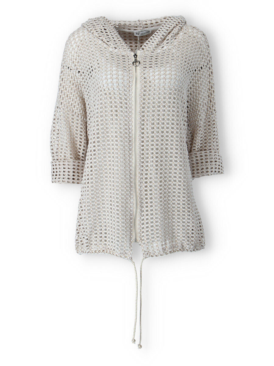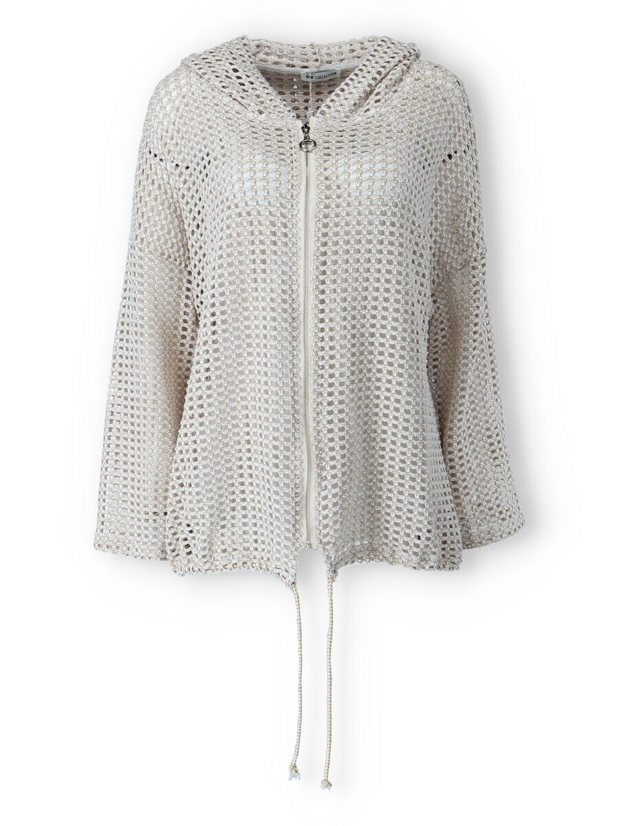 Trendy mikina/bunda ze síťoviny pozlacené. Bunda má kapuci a 3/4 rukáv. Bunda je na zapínání na zip a v pase je na stažení na šňůrku. Vyrobeno v Itálii.