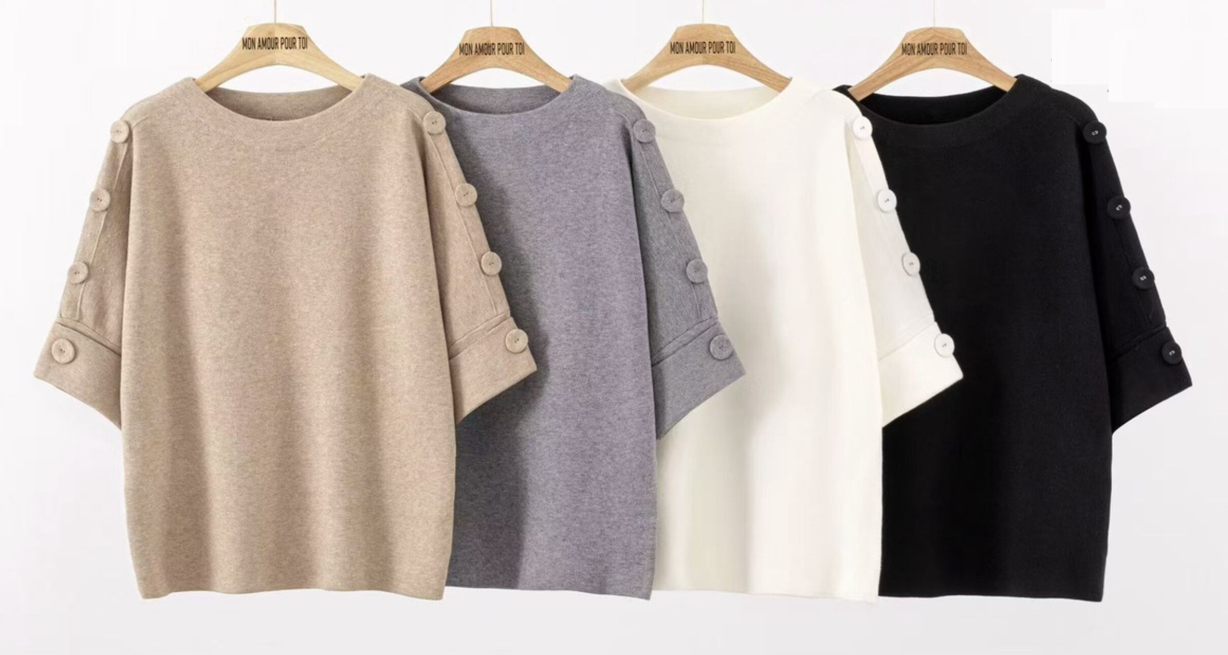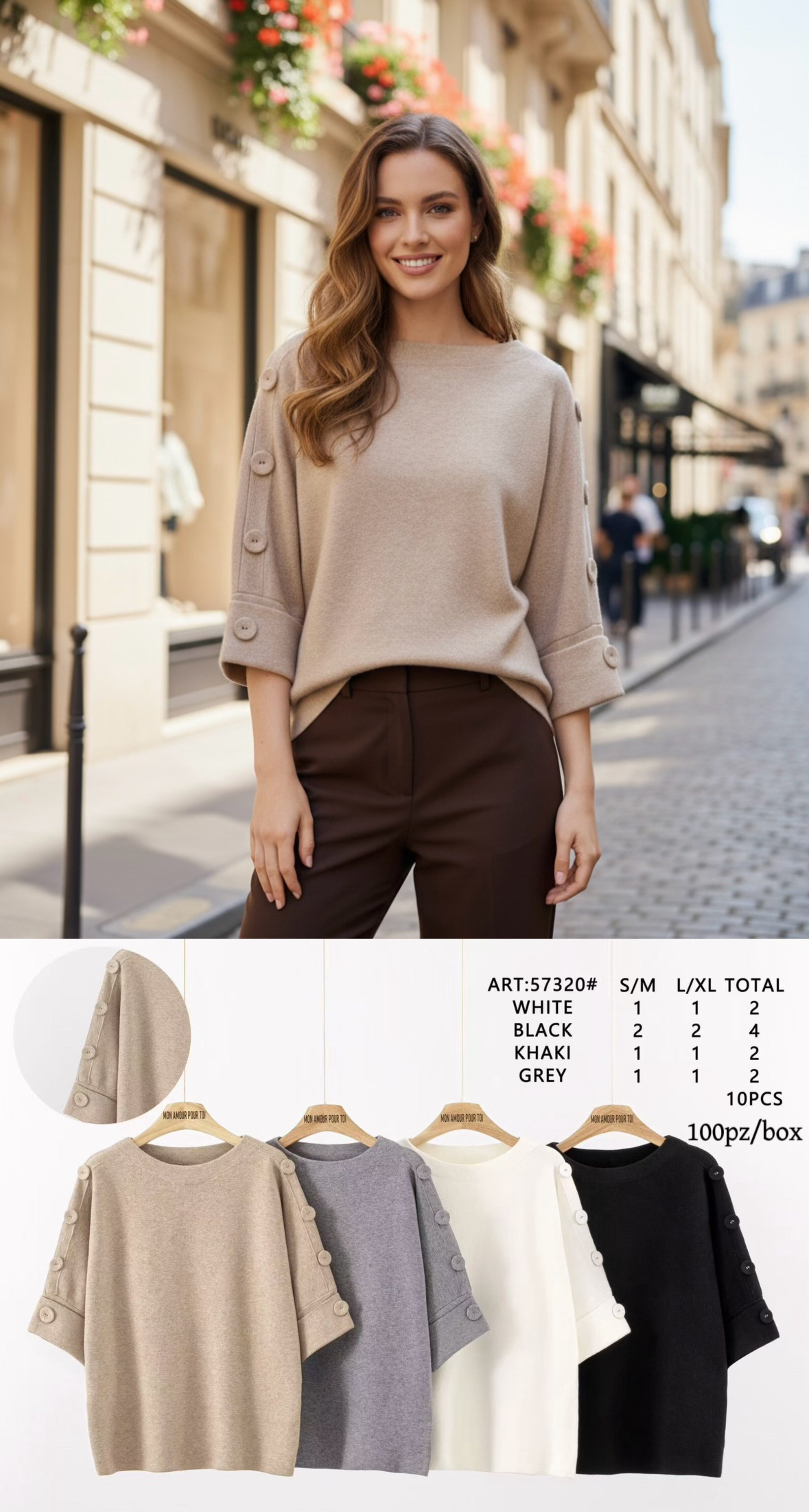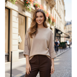 Módní svetřík z hrubého úpletu s 3/4 rukávem. Svetr má na rukávem a aplikaci knoflíků na rukávech.
