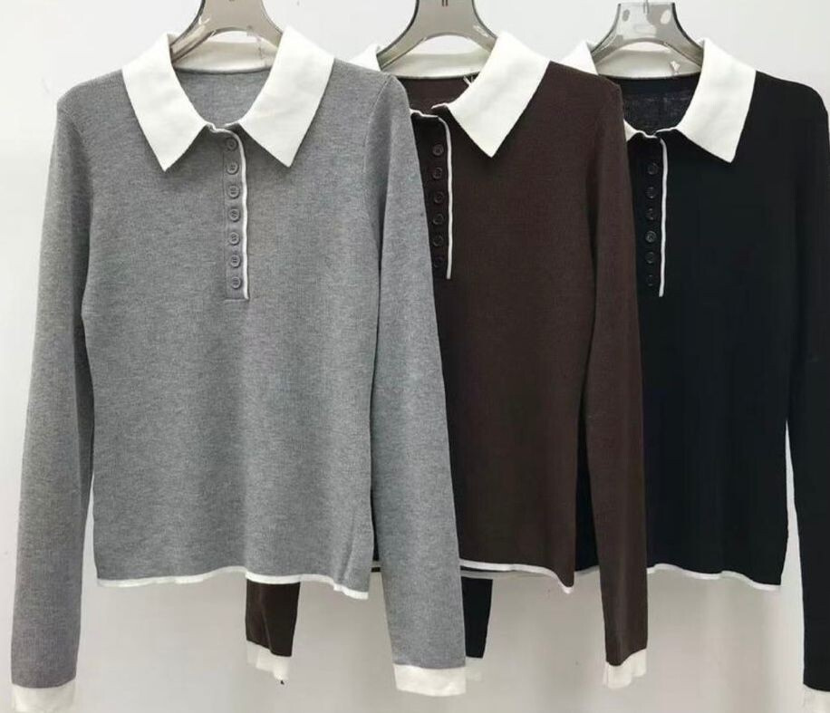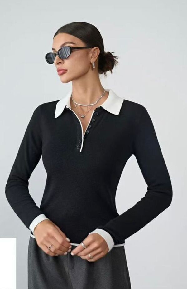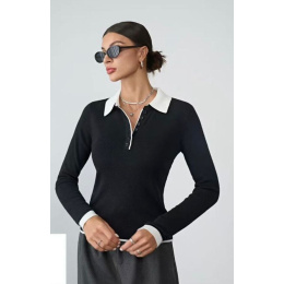 Úpletový módní svetřík kombinovaný. Svetřík má límeček, knoflíky ve výstřihu a je kombinovaný s bílým úpletem, působícím, jako podšitá košile.