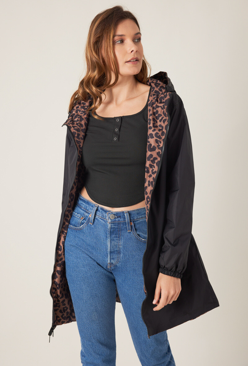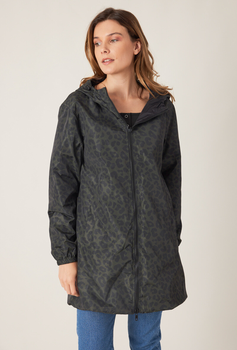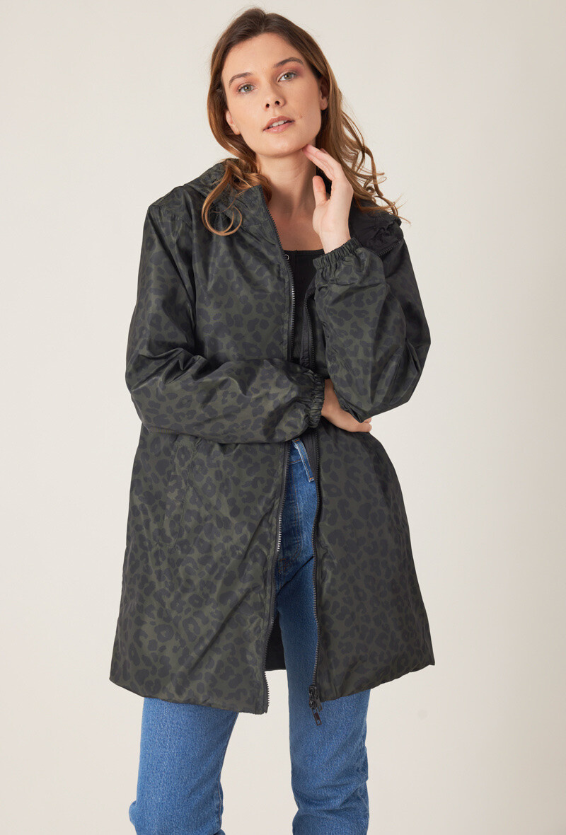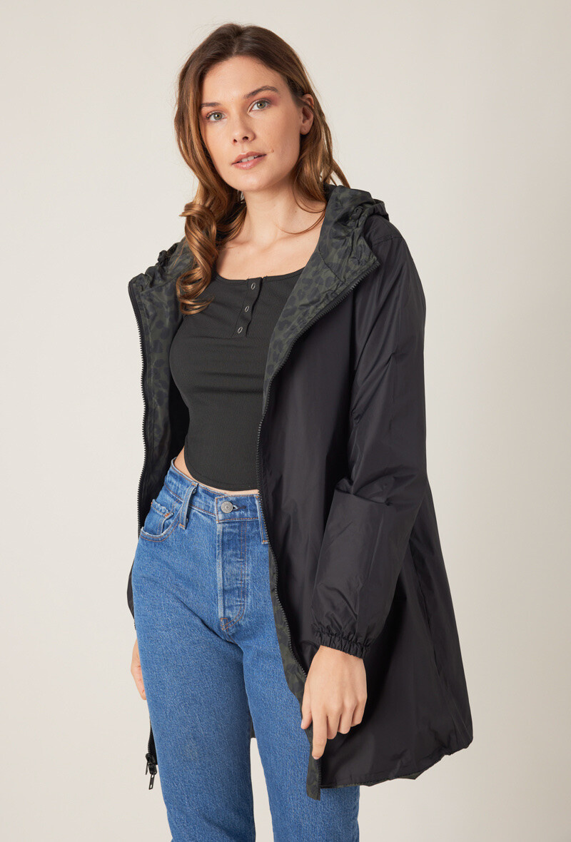 Voděodolná delší oboustranná parka-bunda s kapucí.