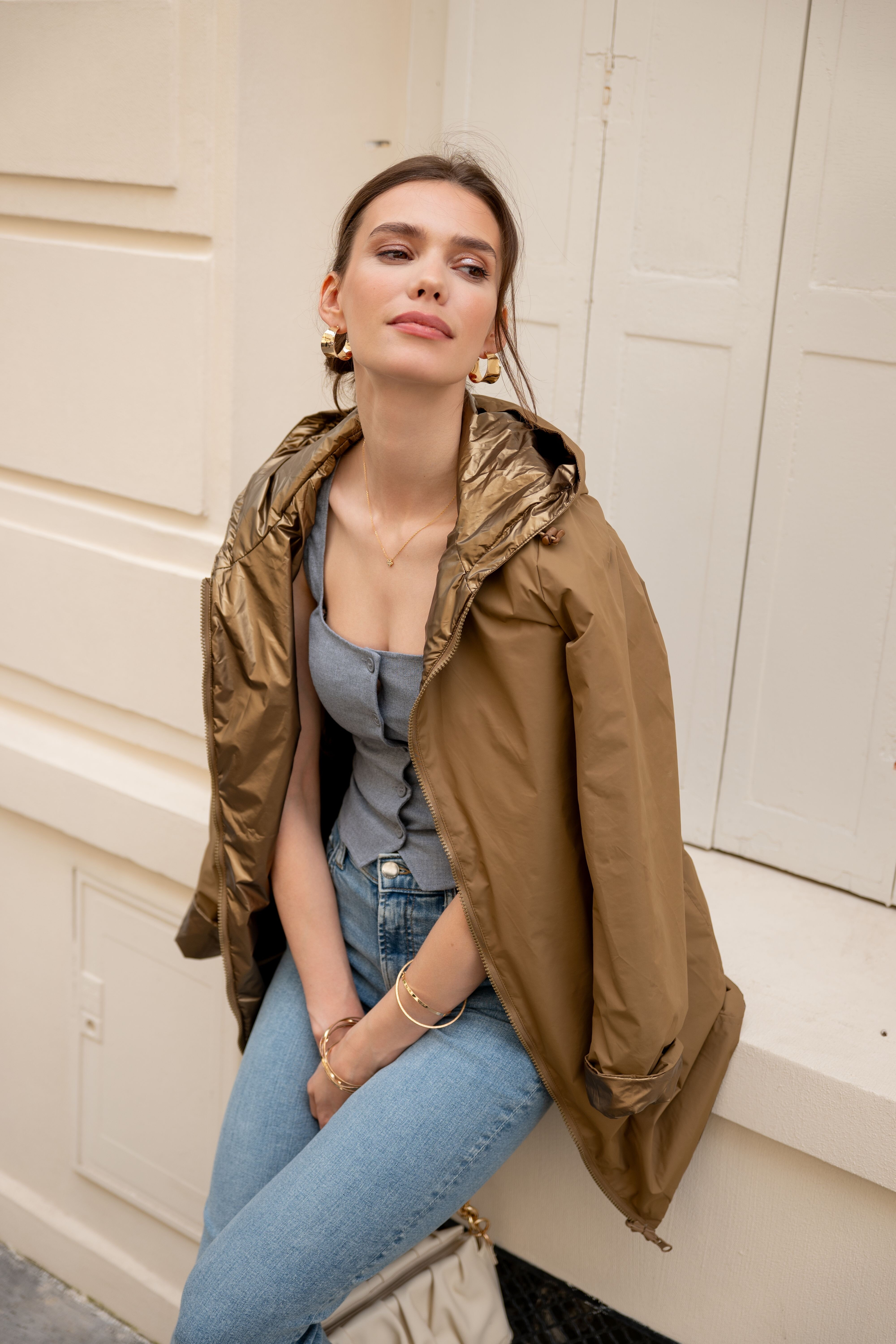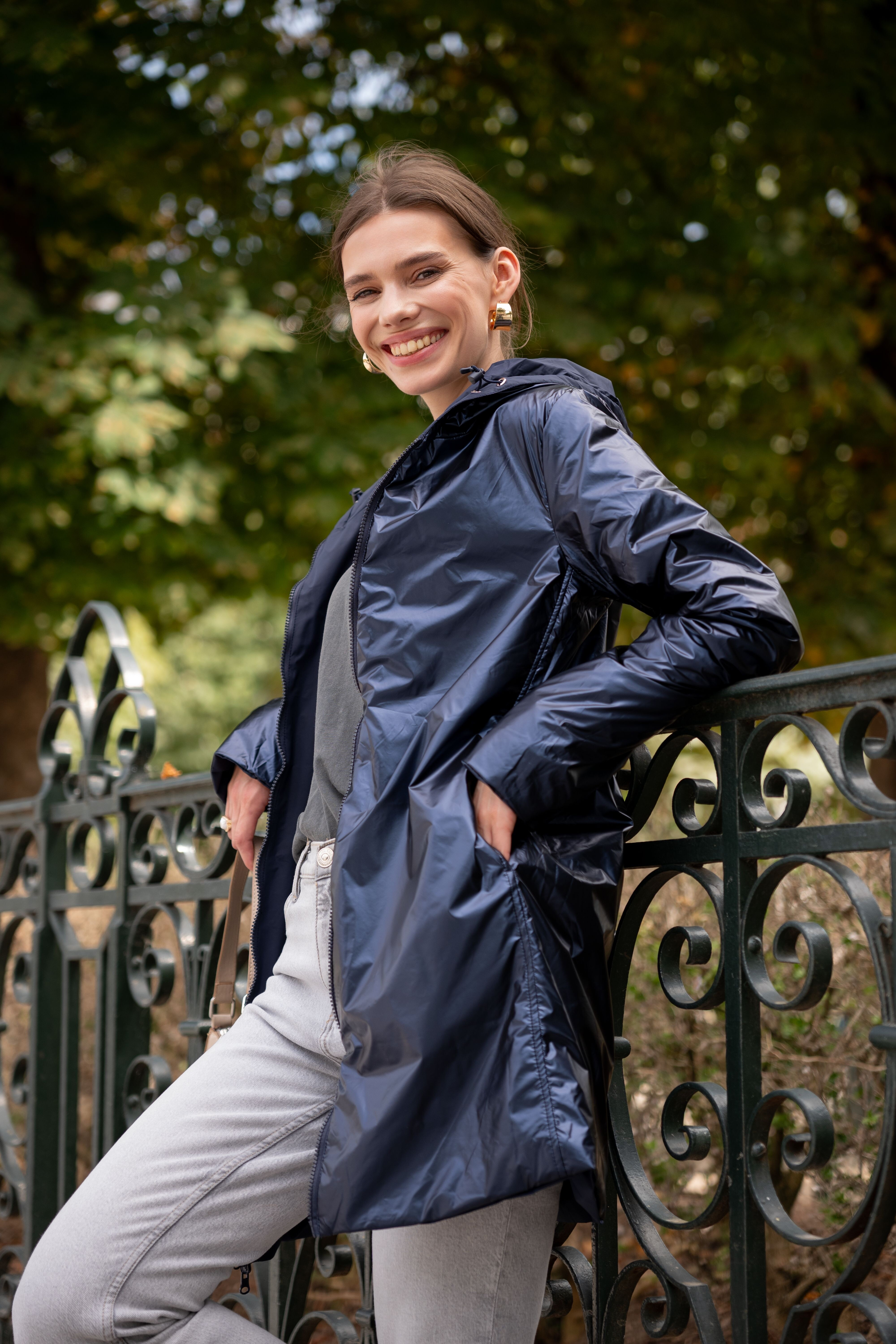 Voděodolná delší oboustranná parka-bunda s kapucí.