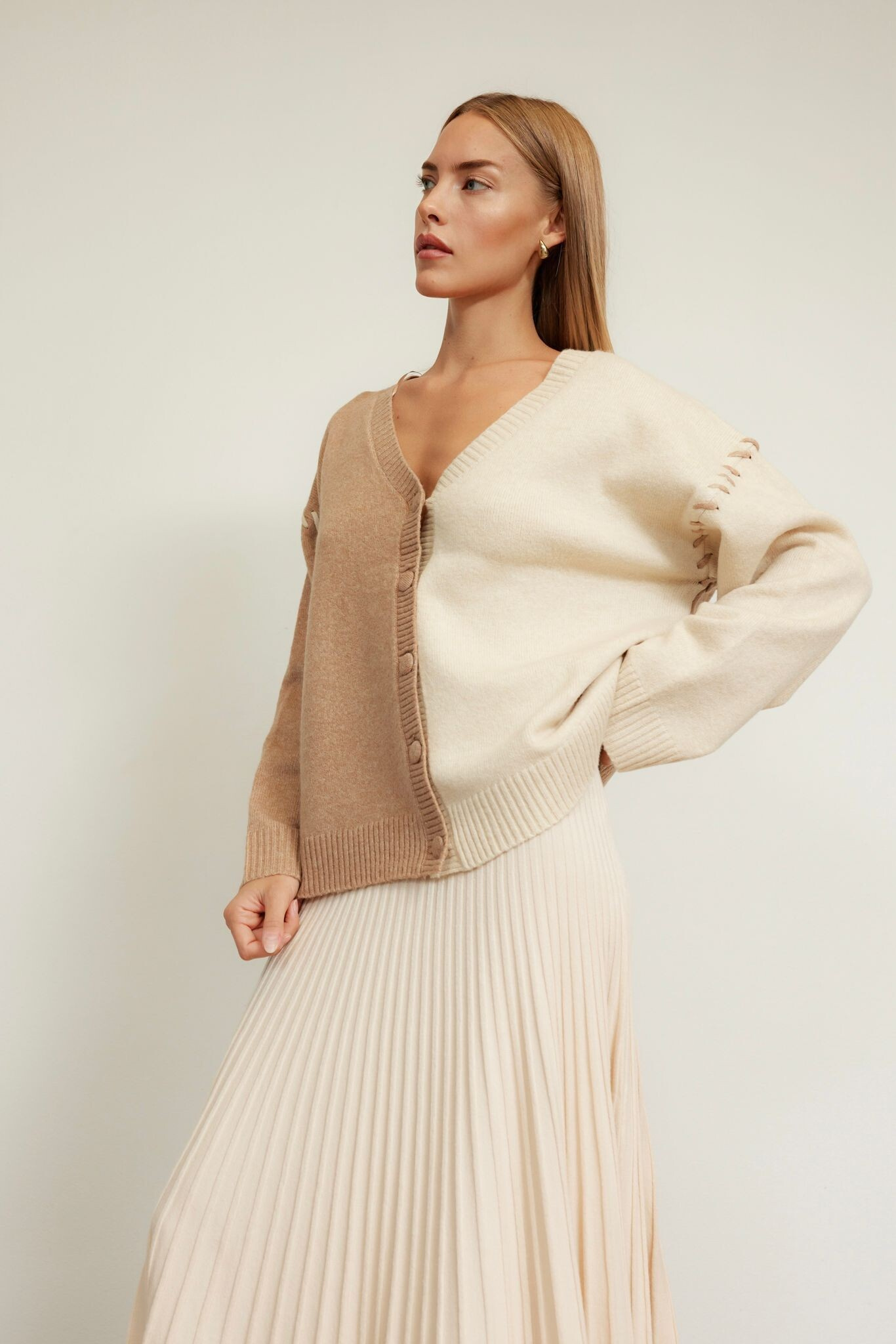 Elegantní vlněný svetřík s dlouhým rukávem a výstřihem do V. Svetr je krásně propracovaný, kombinovaný do dvou barev a je volnějšího střihu. Dovoz Itálie