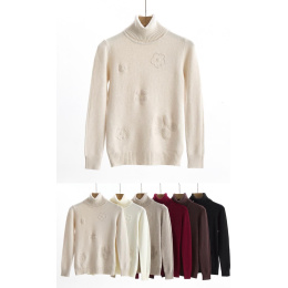 Úpletový rolák na tělo s aplikací vyšitých květů. Zakončení lemů žebrovaným úpletem.