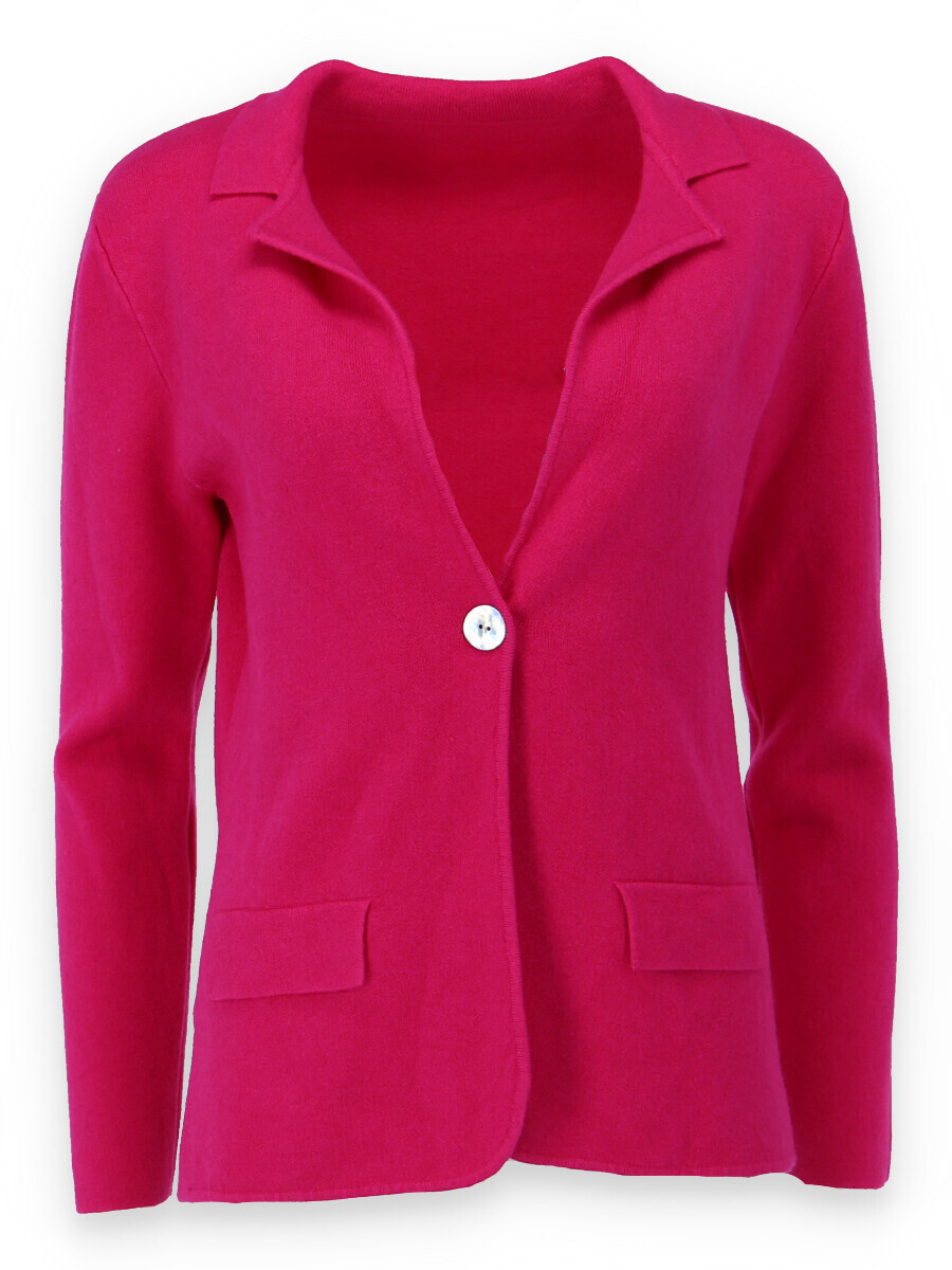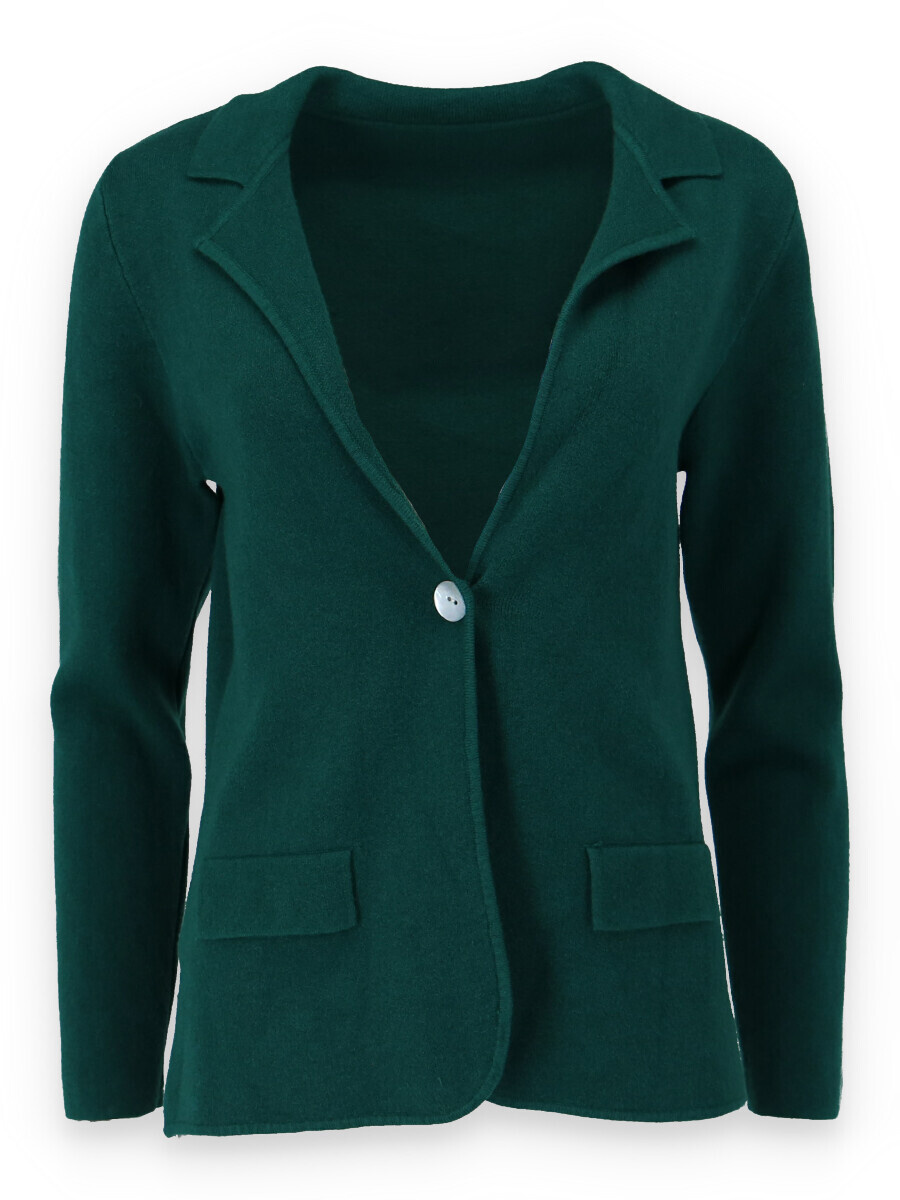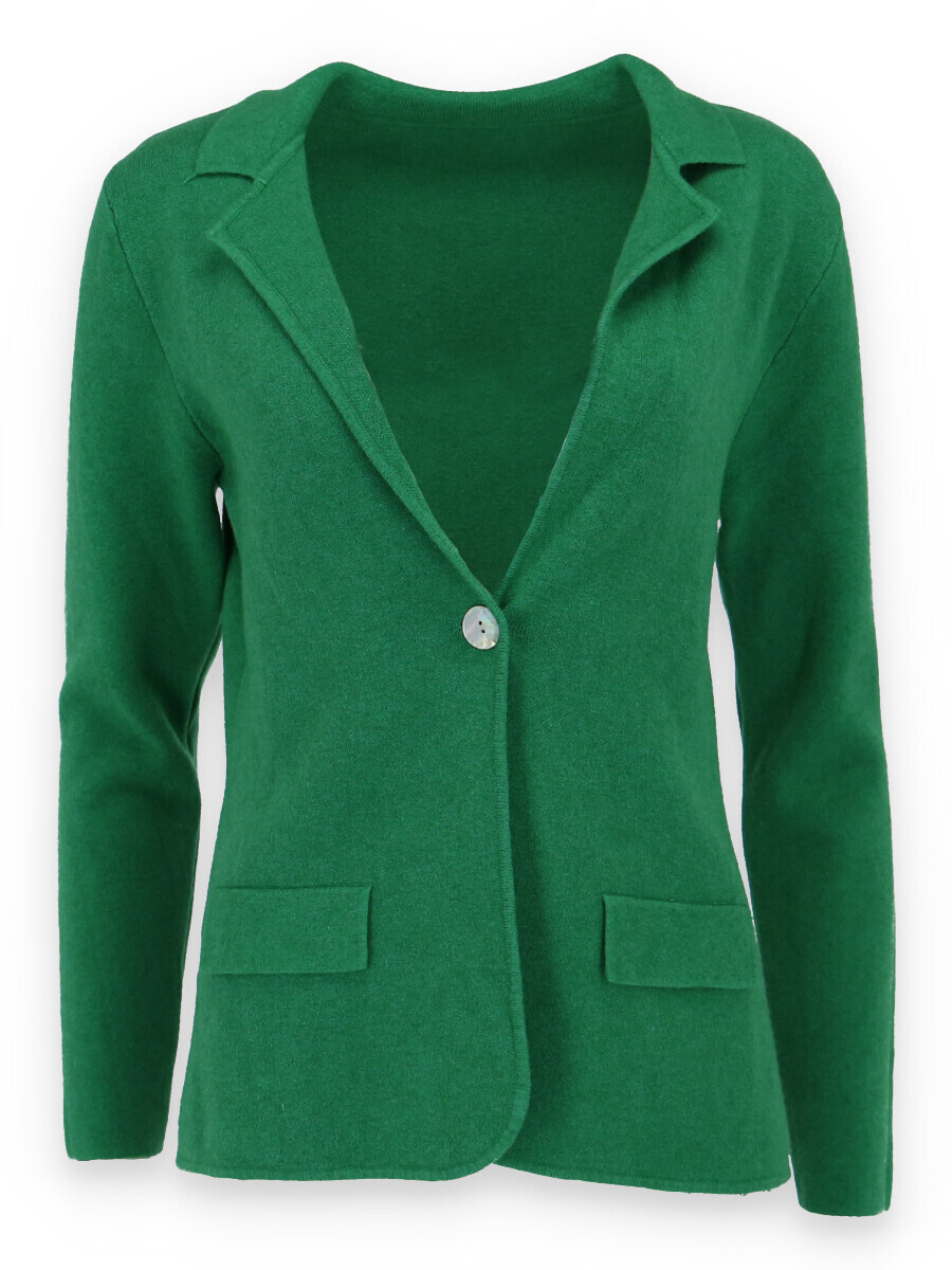 Úpletové sako se zapínáním na knoflík, na přední části našité falešné kapsy. Trendy kousek, který by neměl chybět v žádném šatníku moderní ženy. Dovoz Itálie.