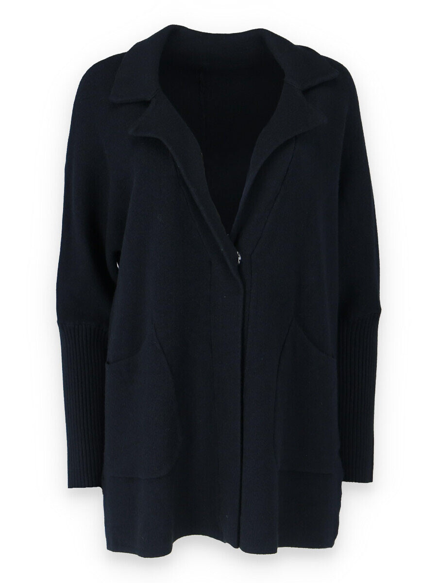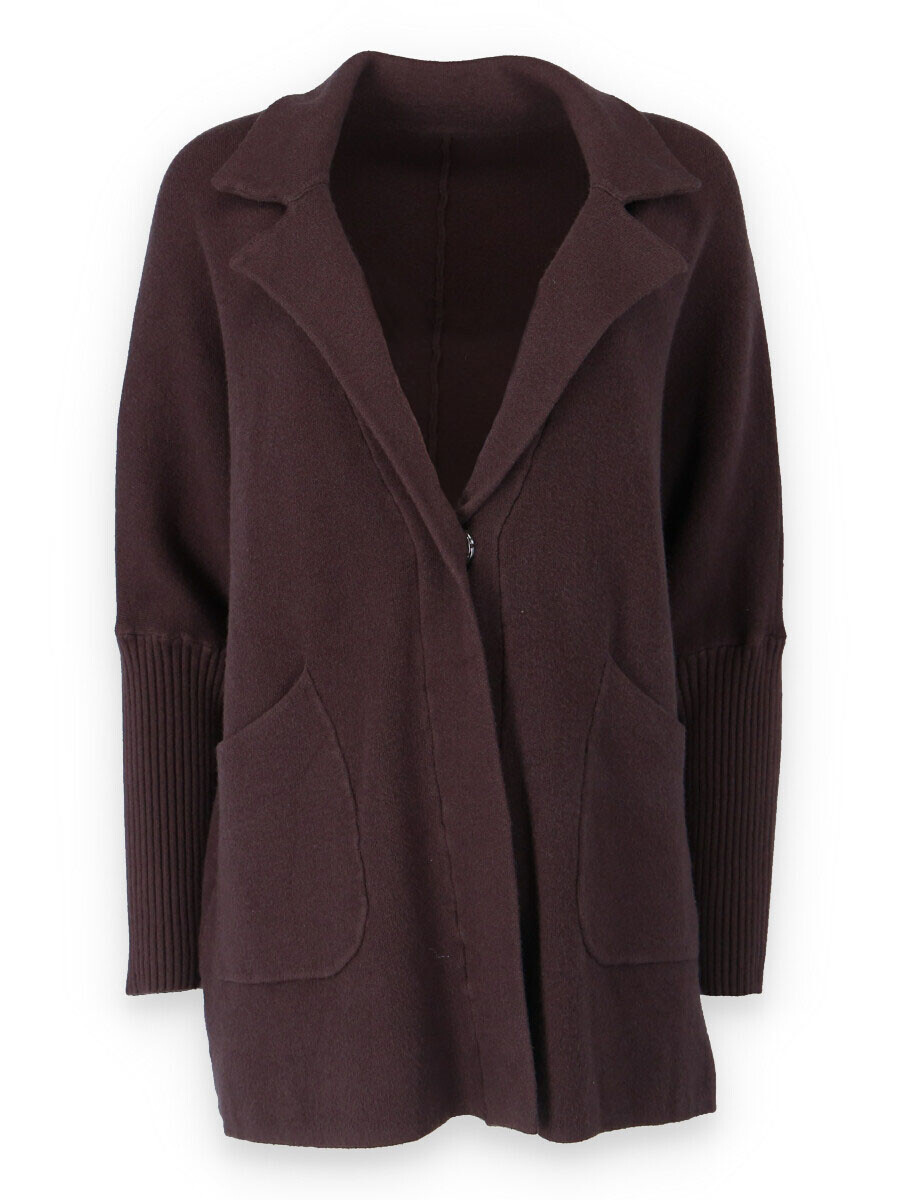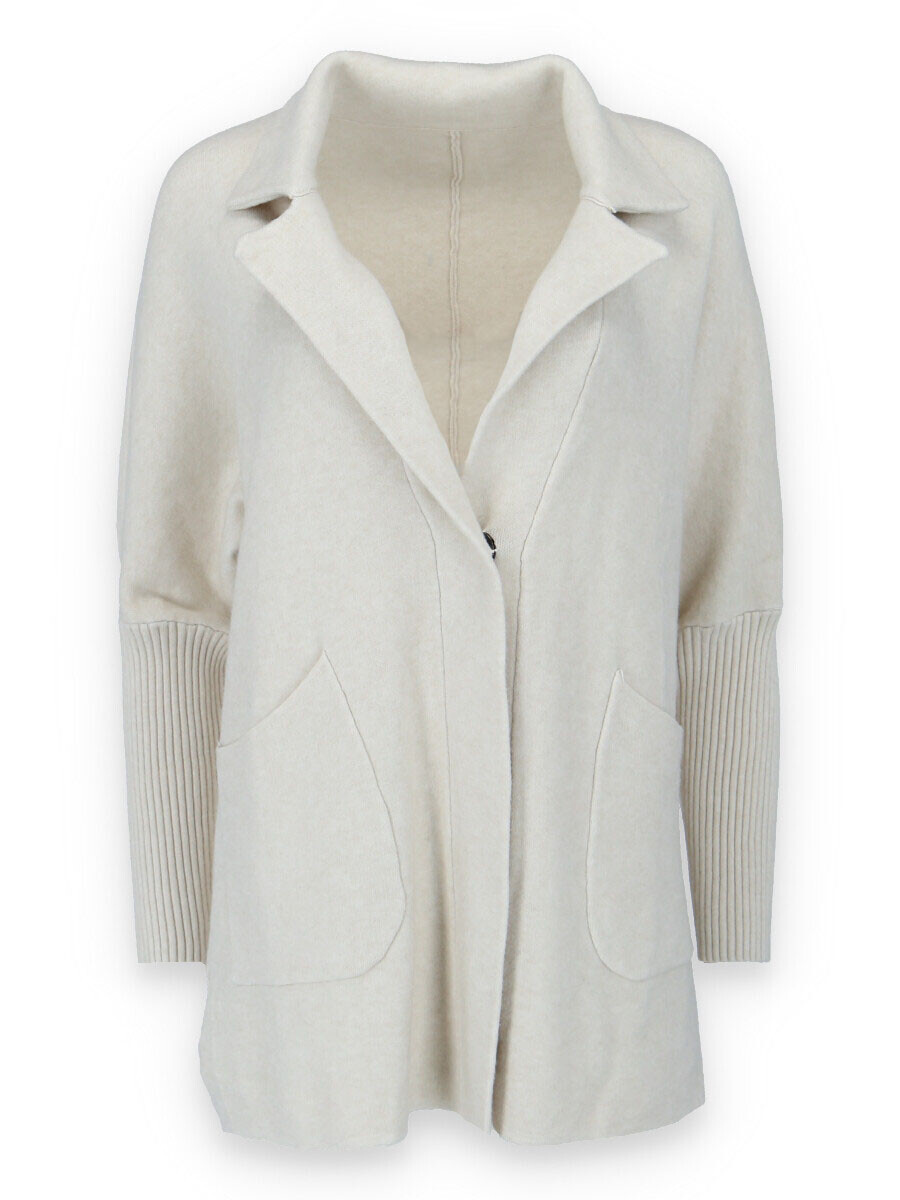 Úpletové sako/kabátek oversize střihu, sako má dlouhý rukáv, poslední 1/3 rukávu z úzkého úpletu, na přední části našité kapsy a zapínání na knoflík/druk, dovoz Itálie