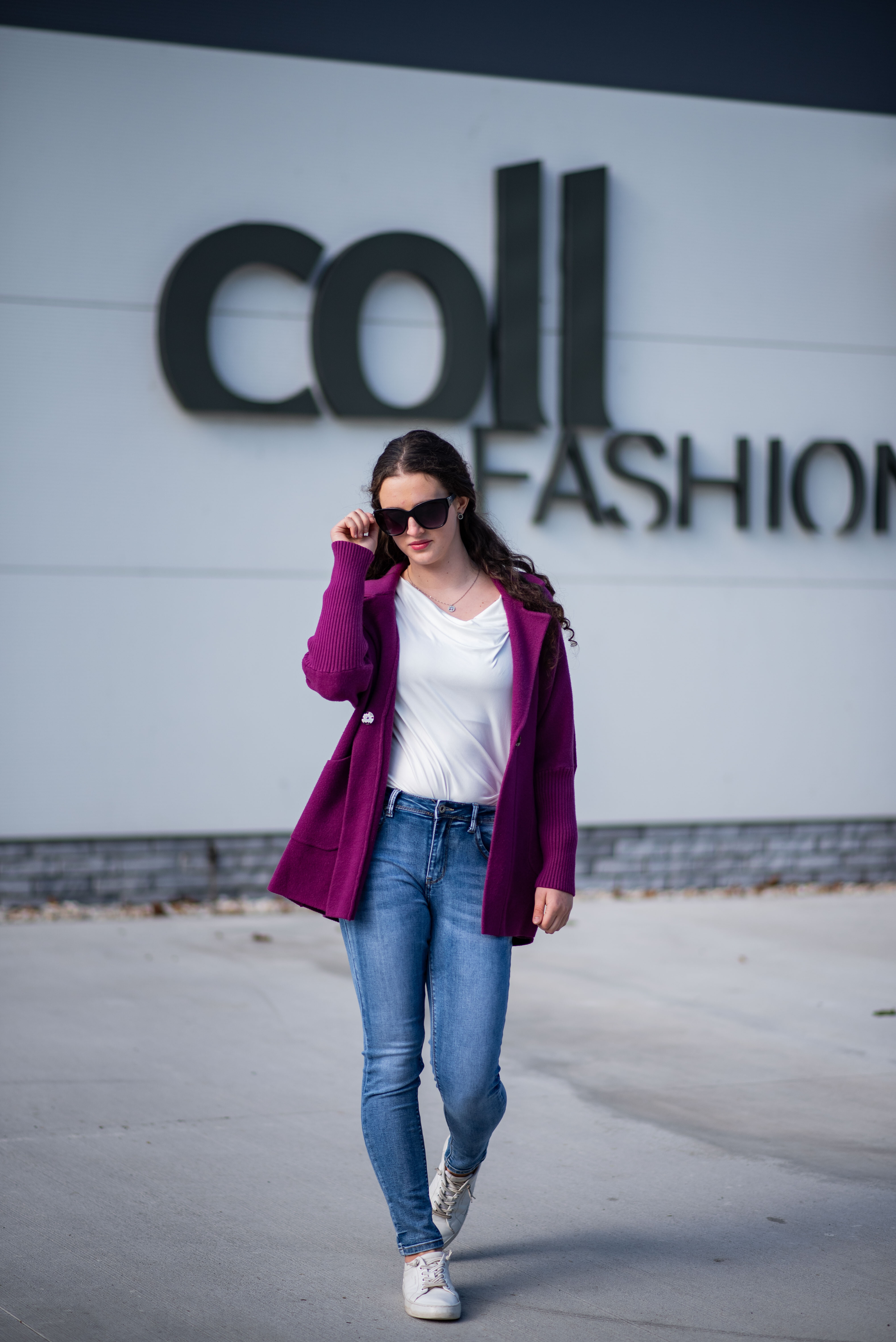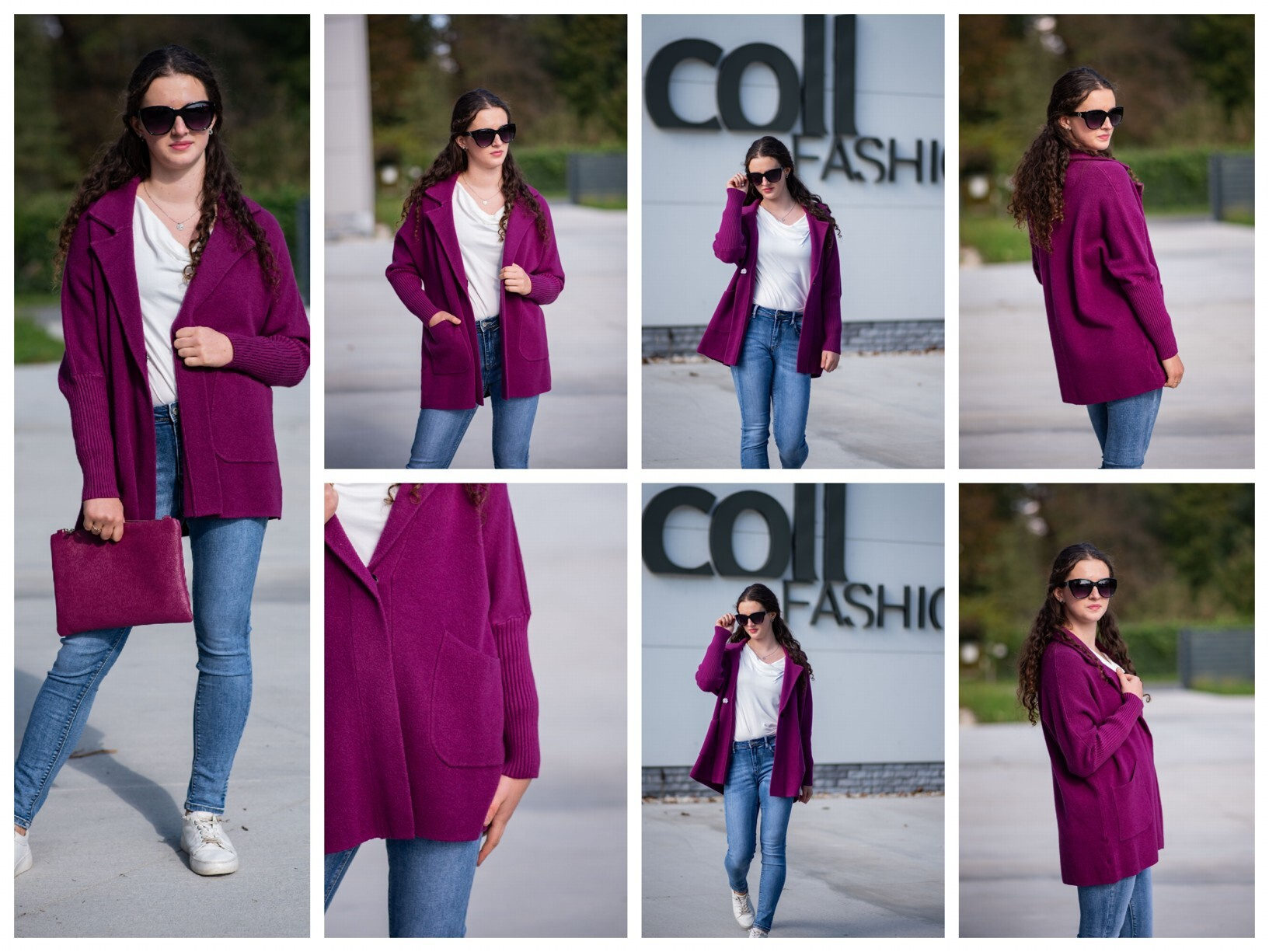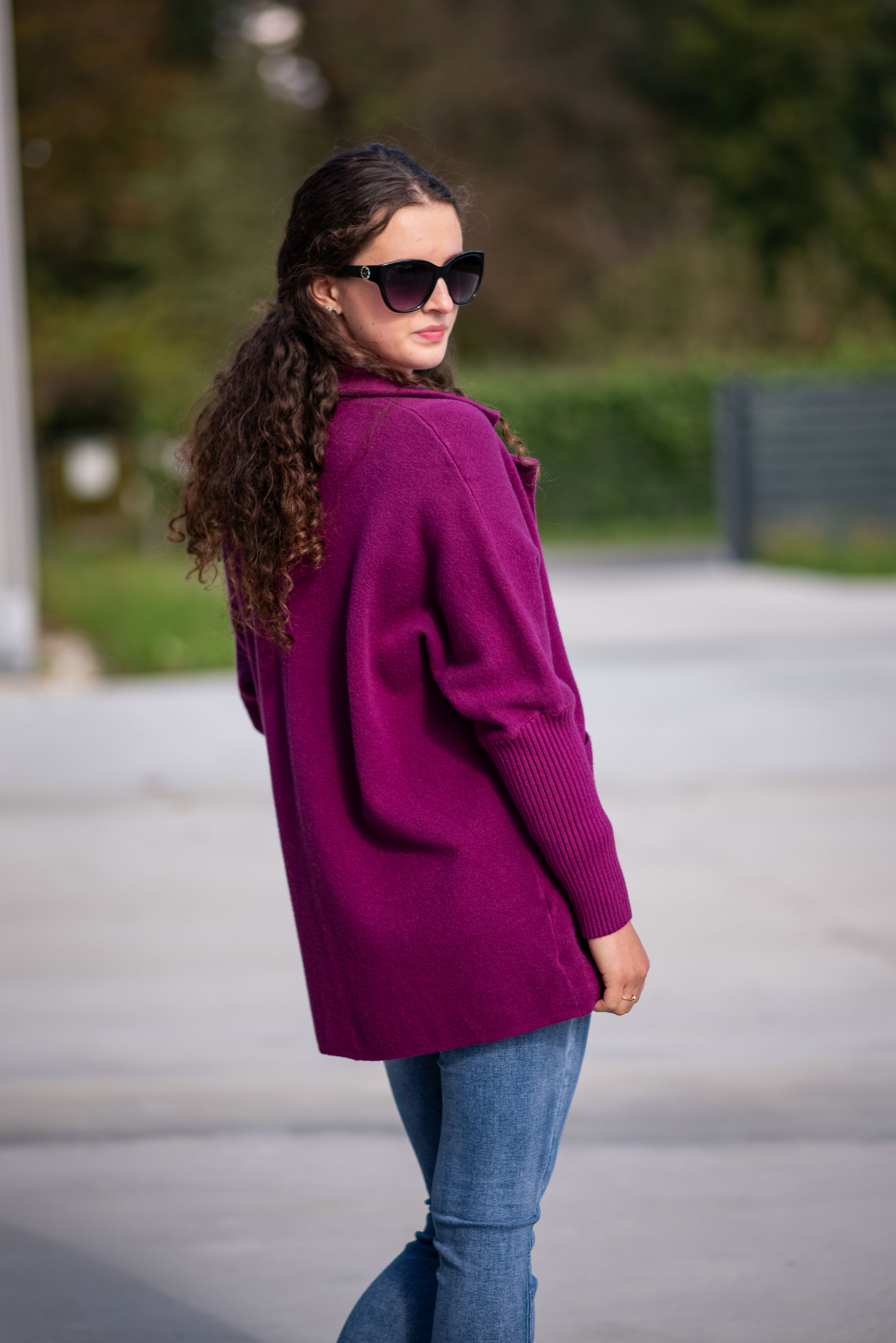 Úpletové sako/kabátek oversize střihu, sako má dlouhý rukáv, poslední 1/3 rukávu z úzkého úpletu, na přední části našité kapsy a zapínání na knoflík/druk, dovoz Itálie