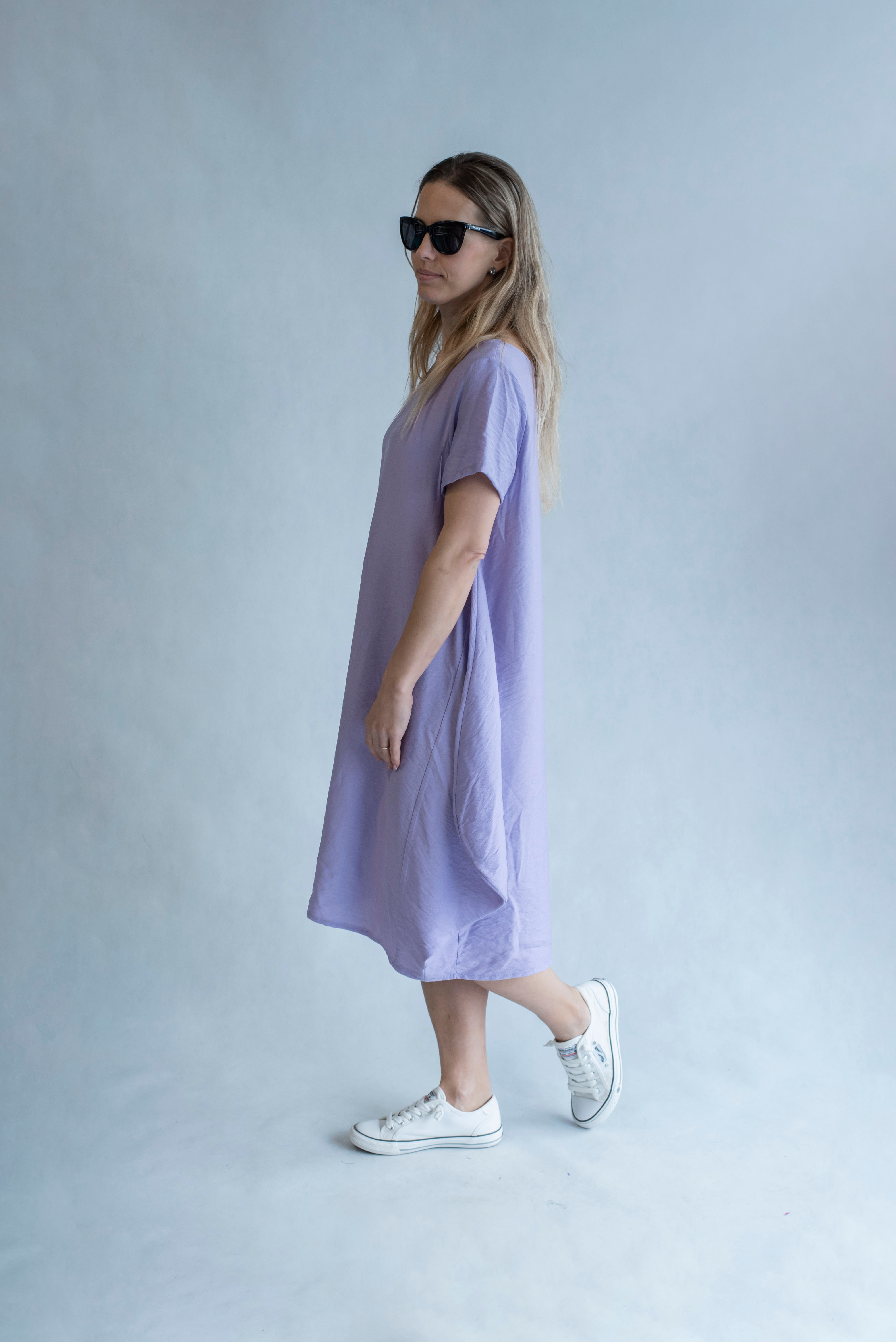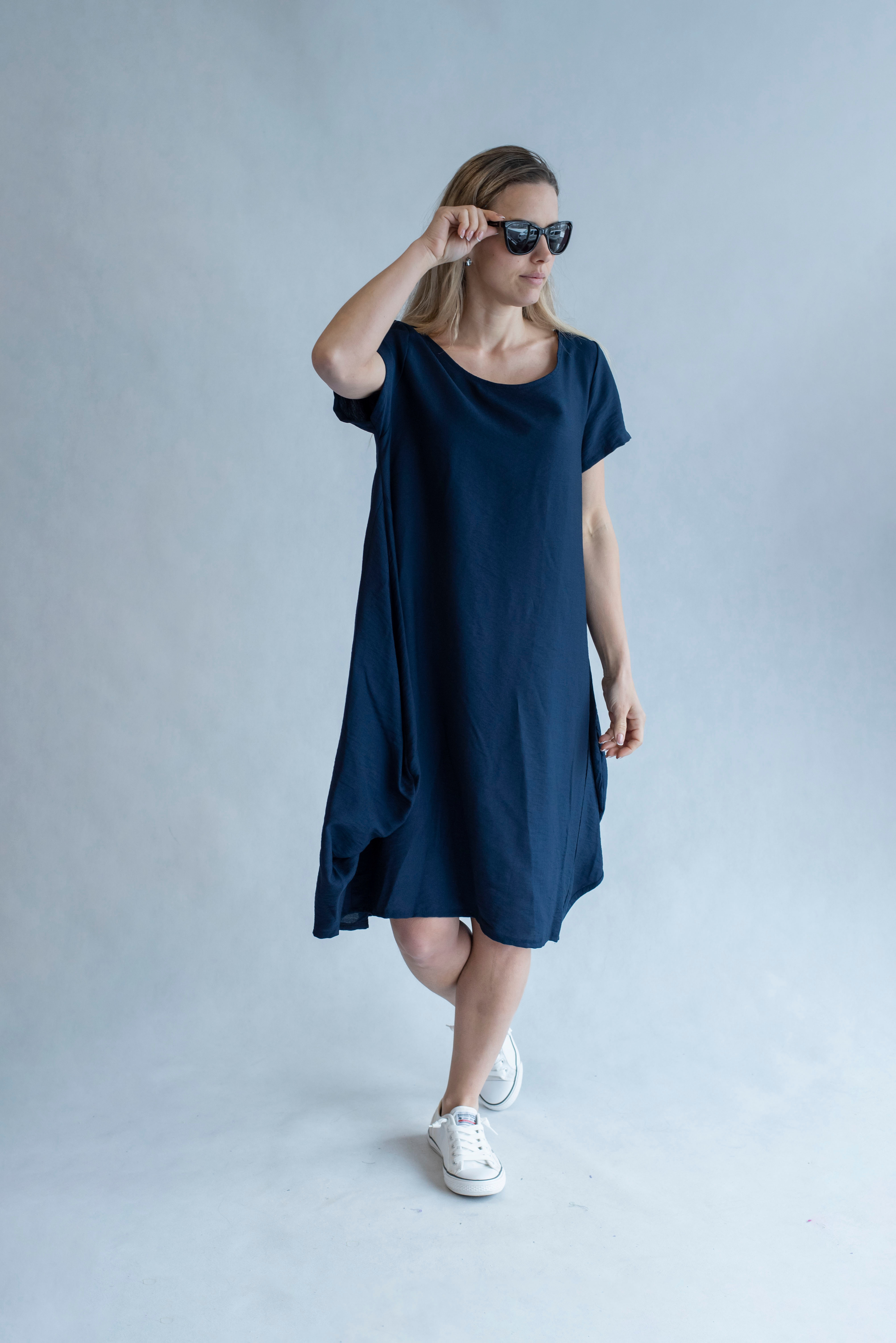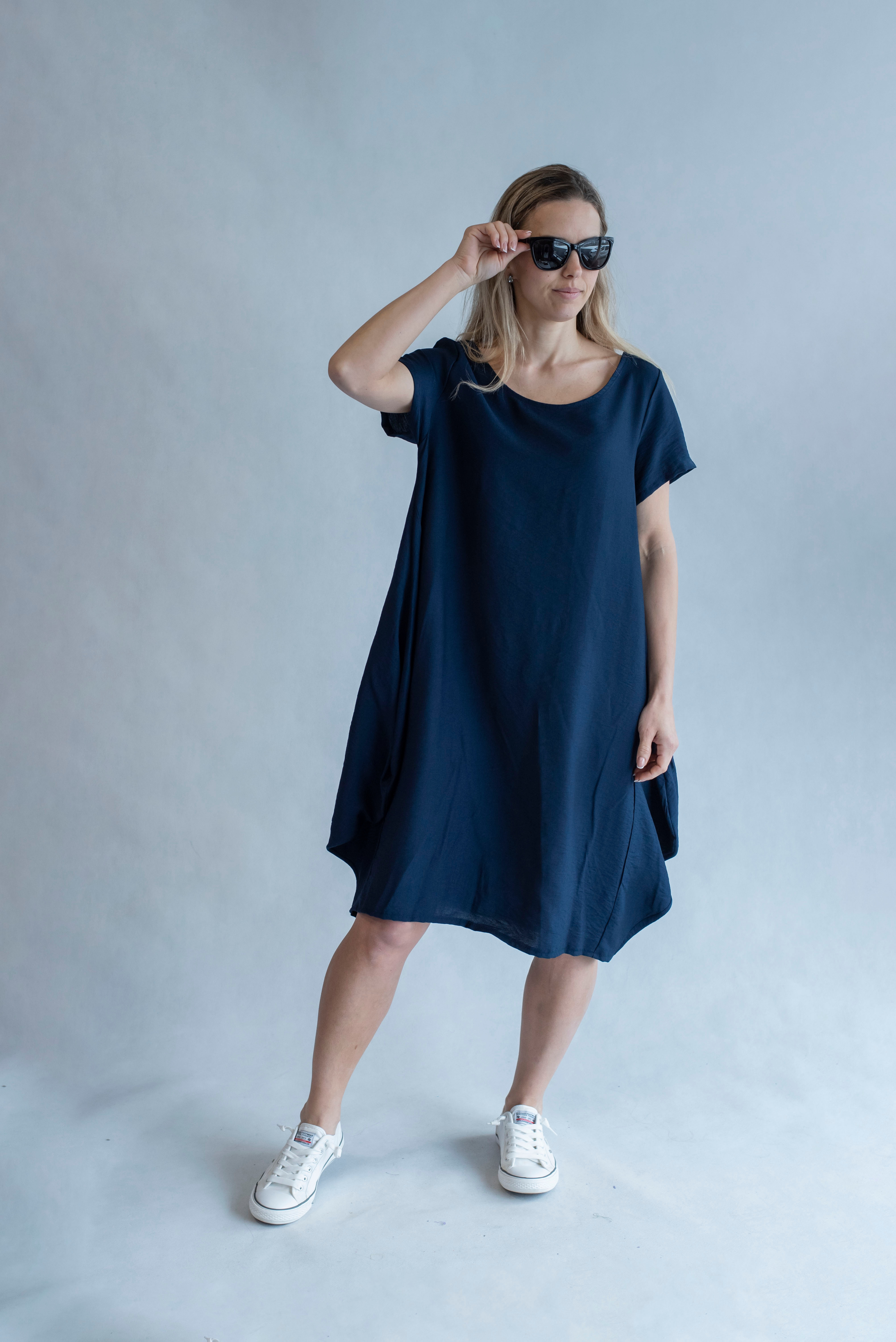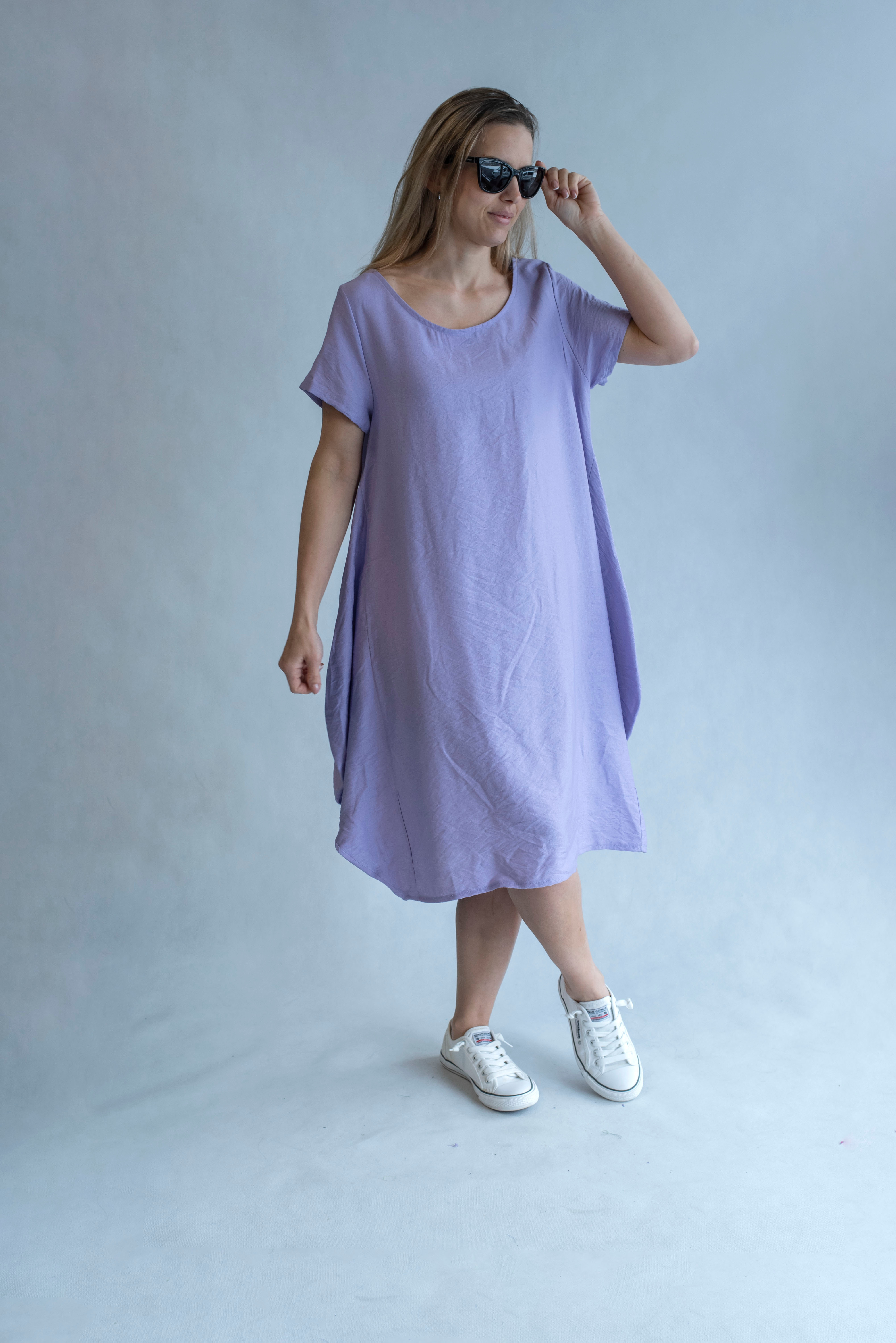 Elegantní, dámská lněná volnočasová šatovka pro denní nošení z lehkého a vzdušného materiálu , kulatý výstřih , do cípu, vyrobeno v Italii