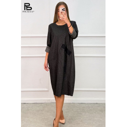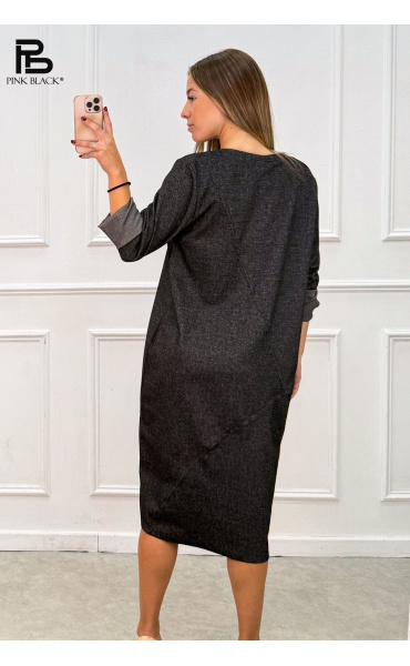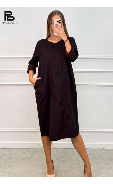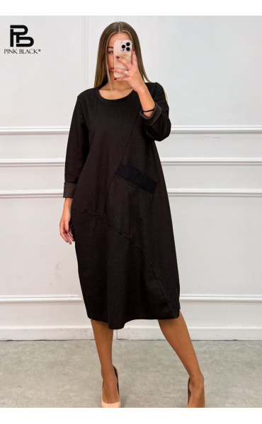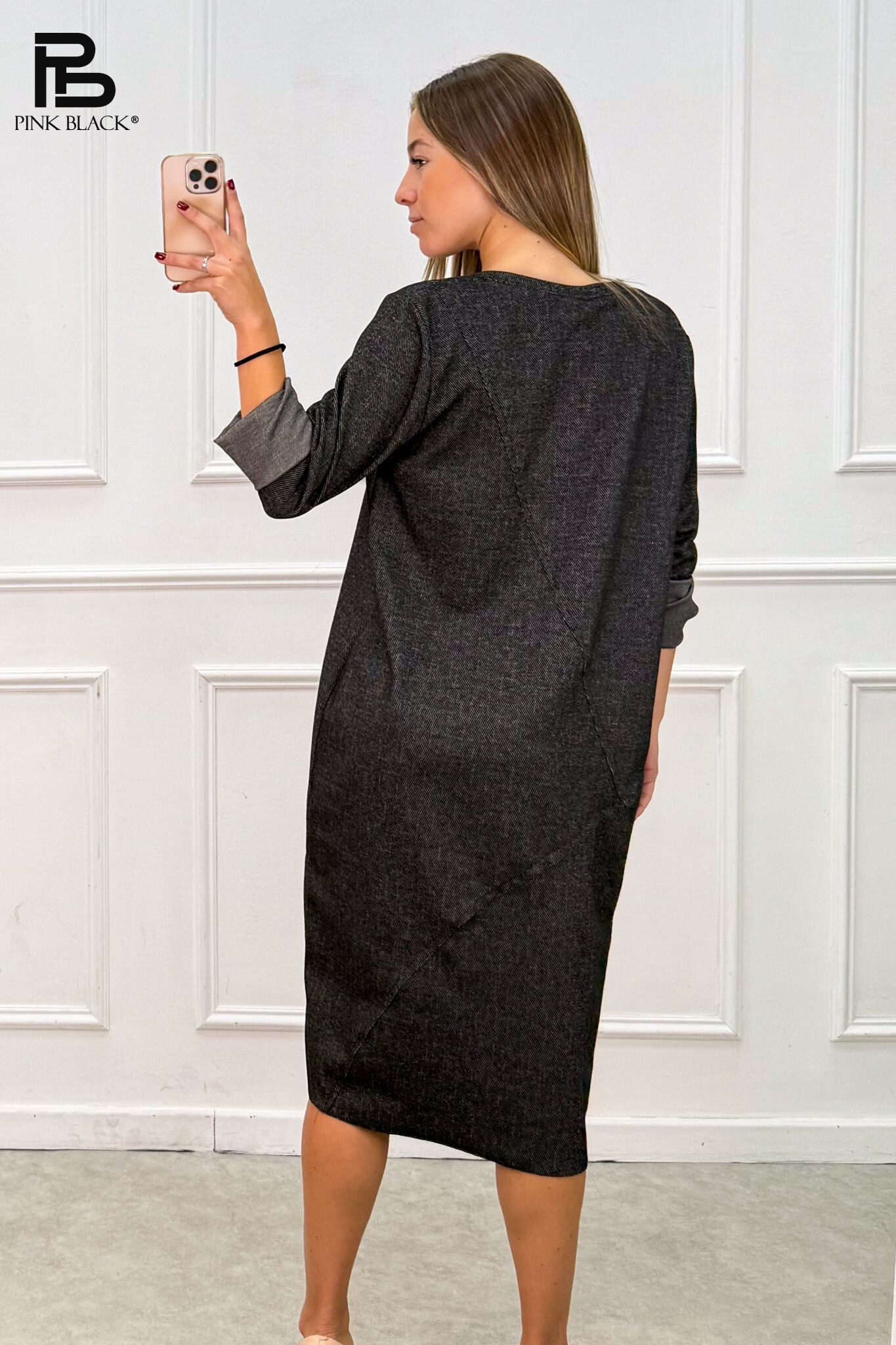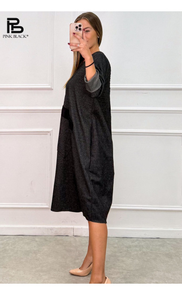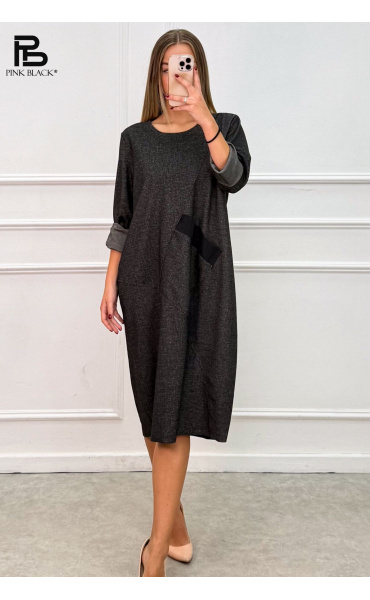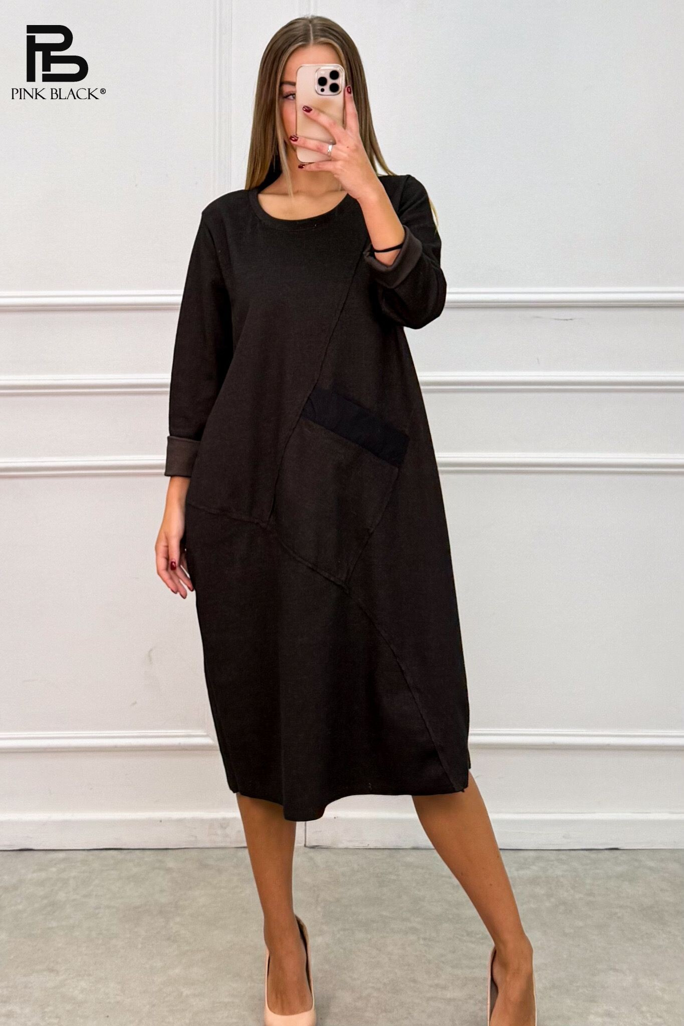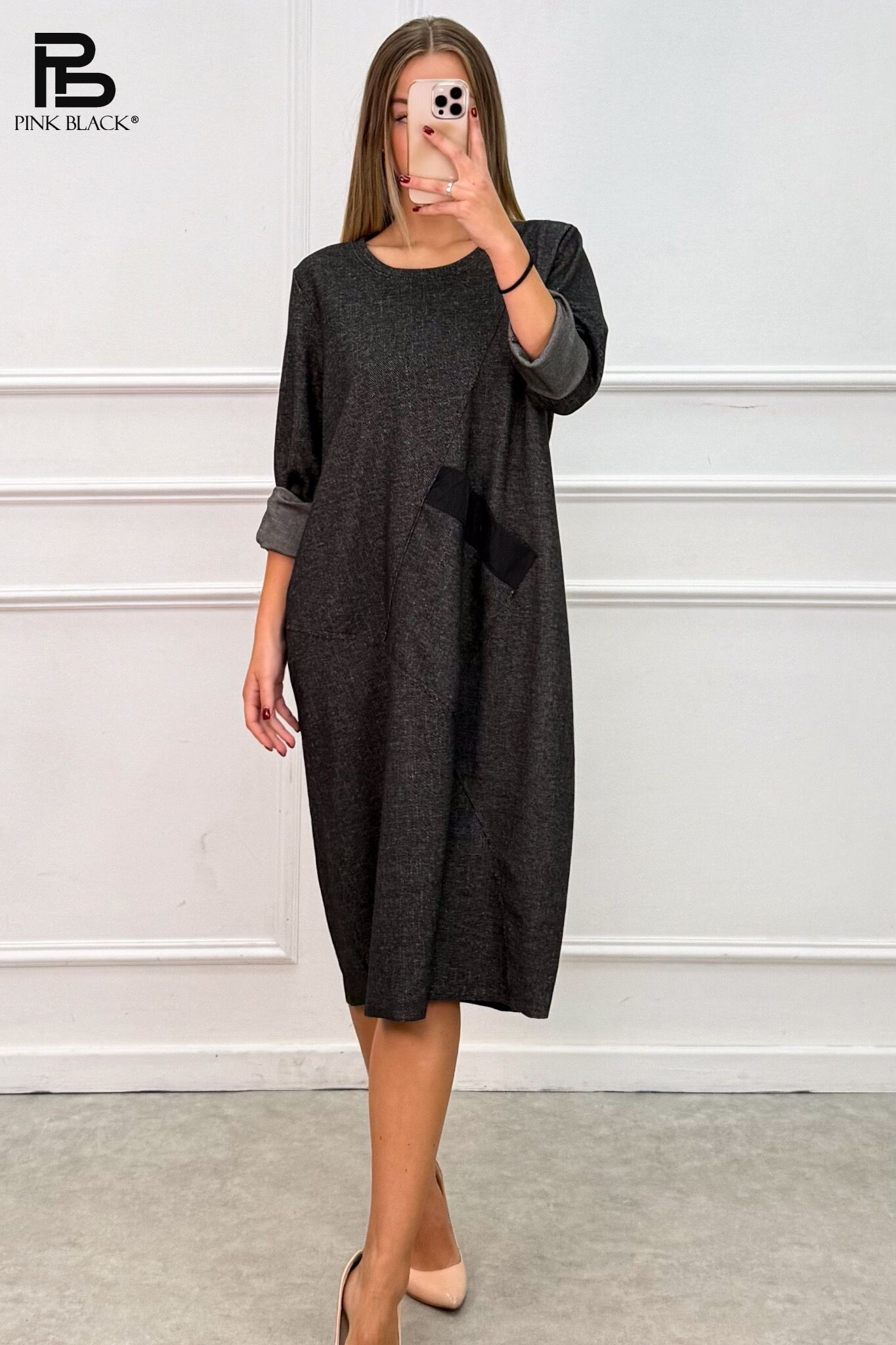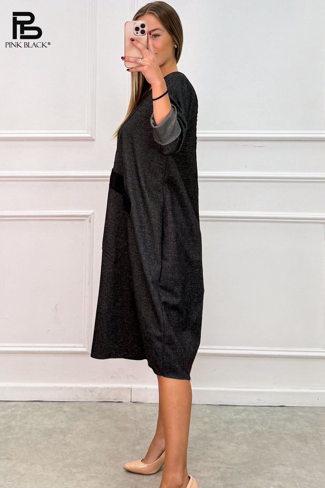 Trendy šatovka volnějšího střihu s našitou kapsou na přední straně. Šatovka má dlouhý rukáv a kulatý výstřih.