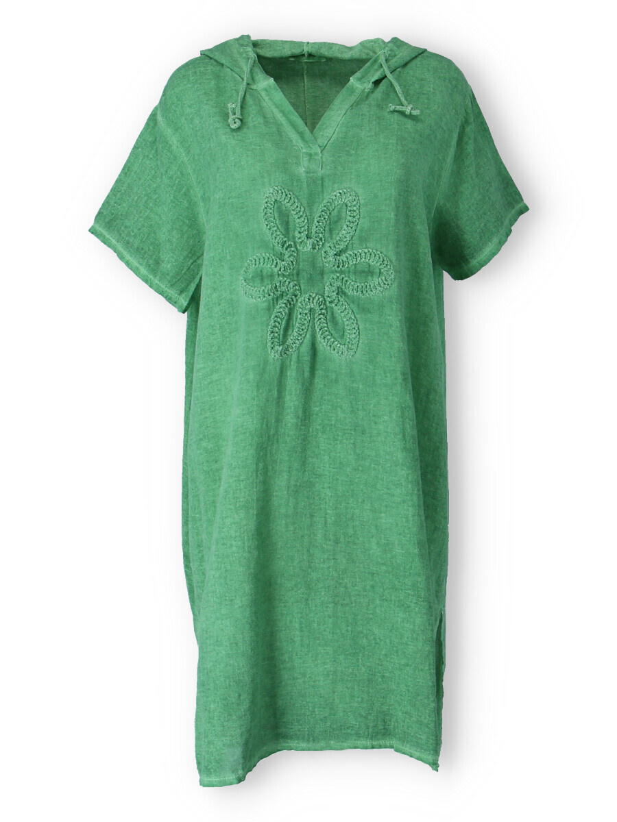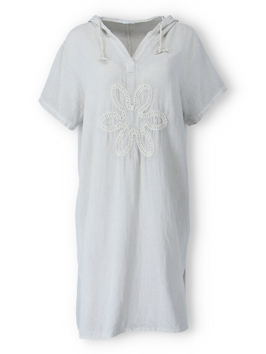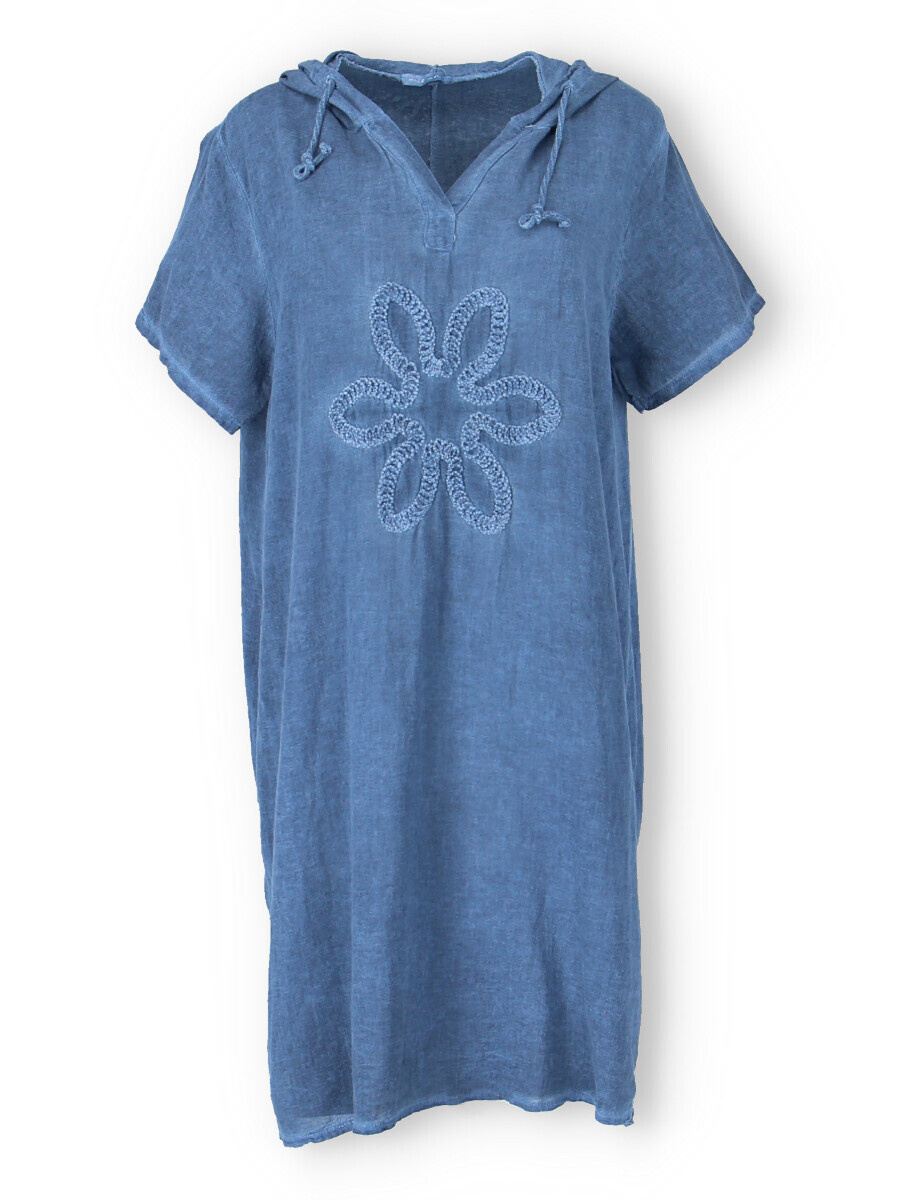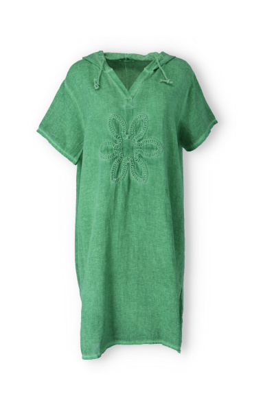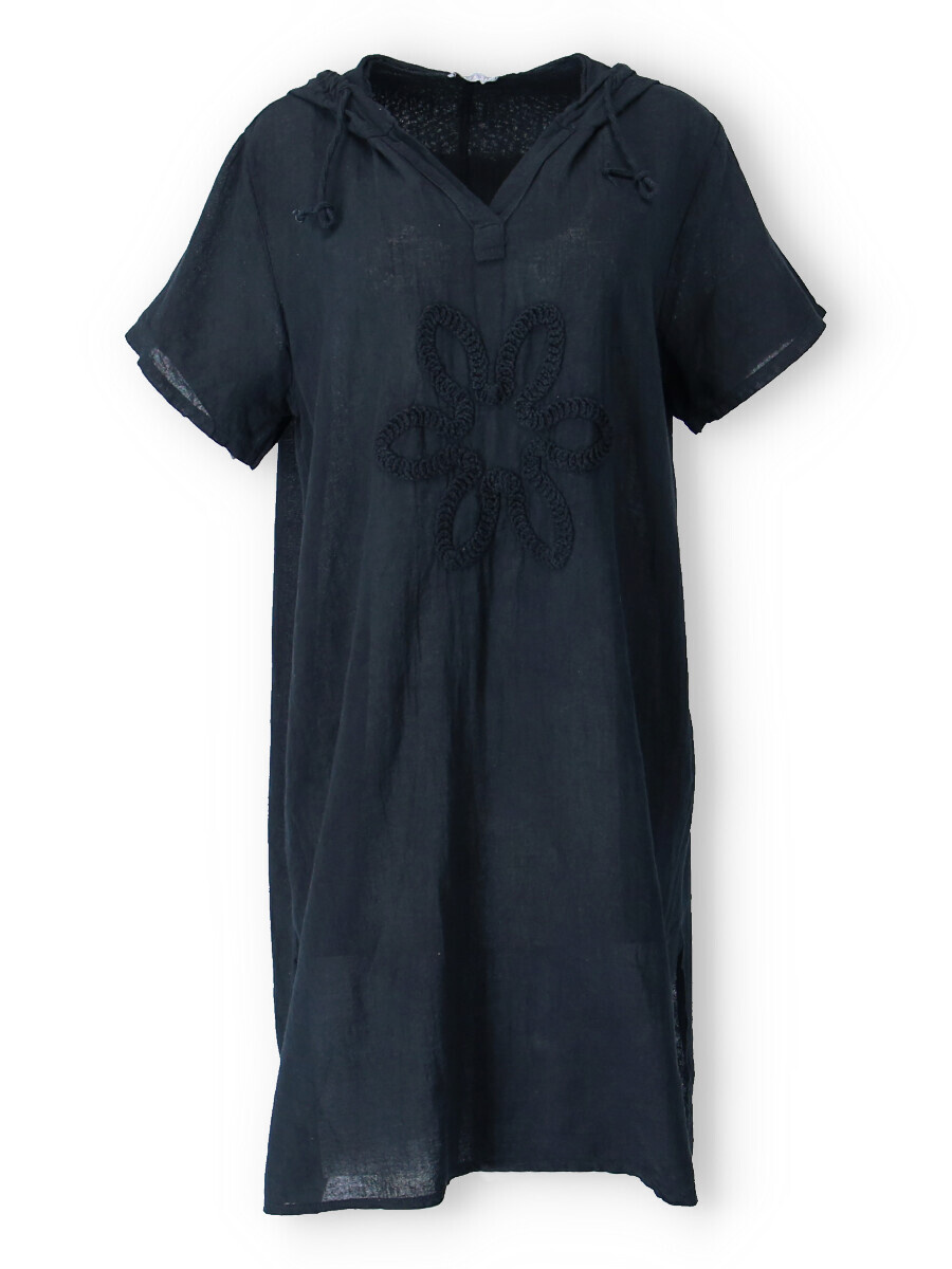 Šatovka s kapucí s krátkým rukávem. Šatovka má prodlouženou zadní, kapuci, výstřih do V a na přední straně aplikaci květu.